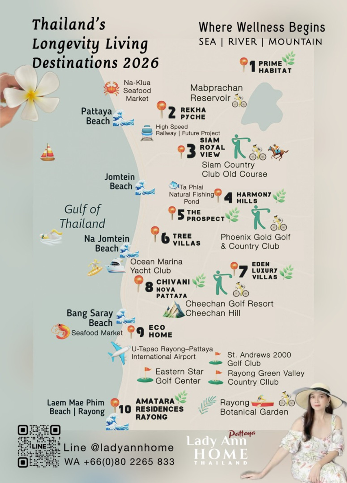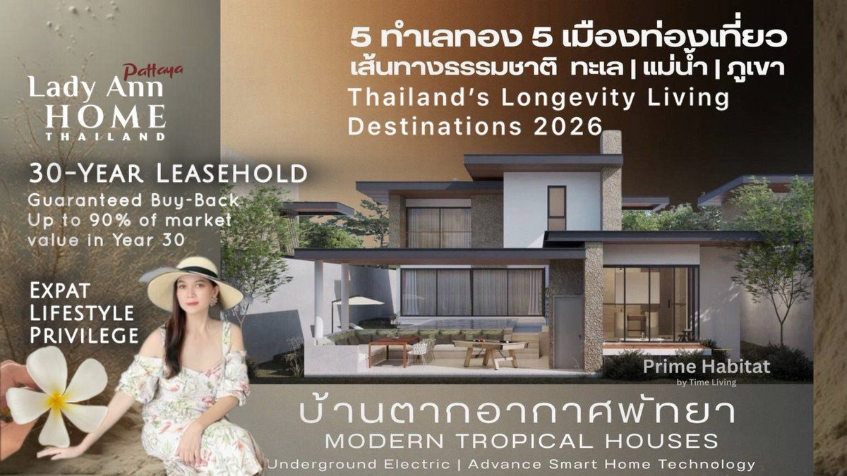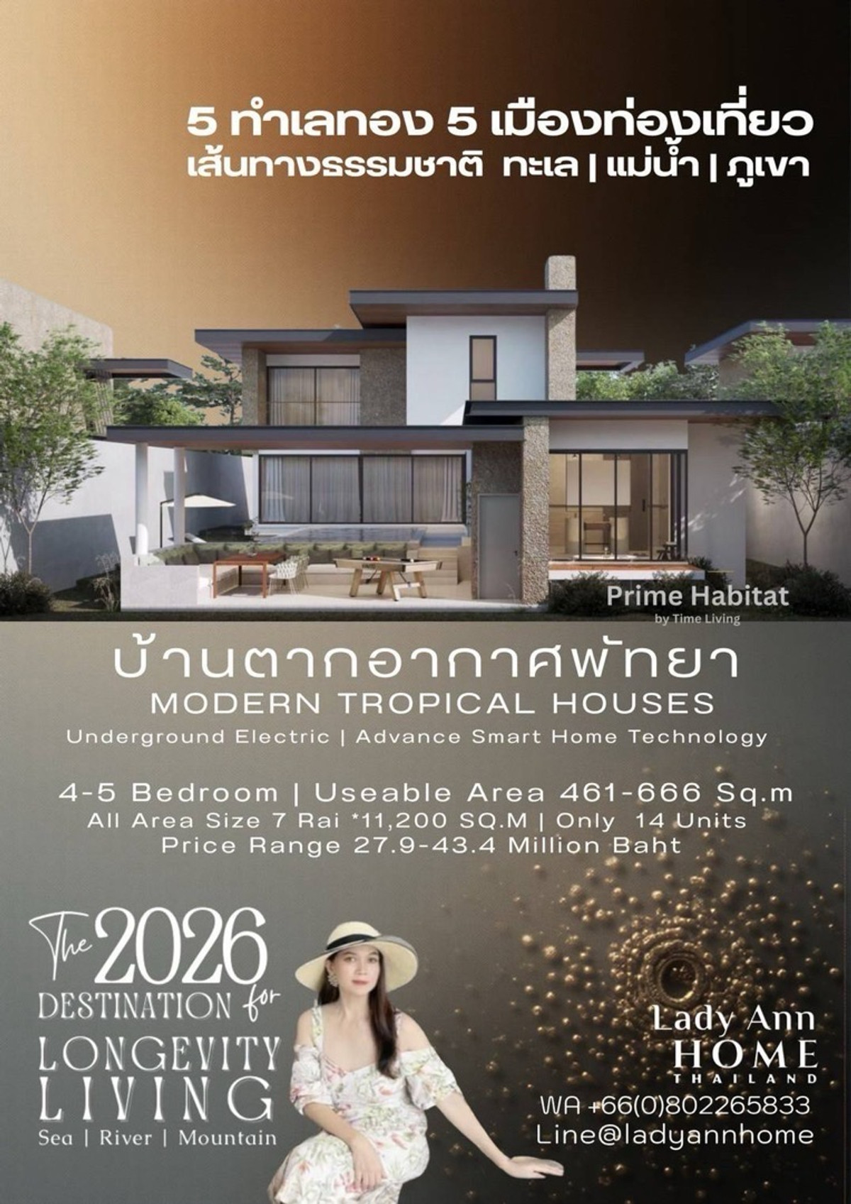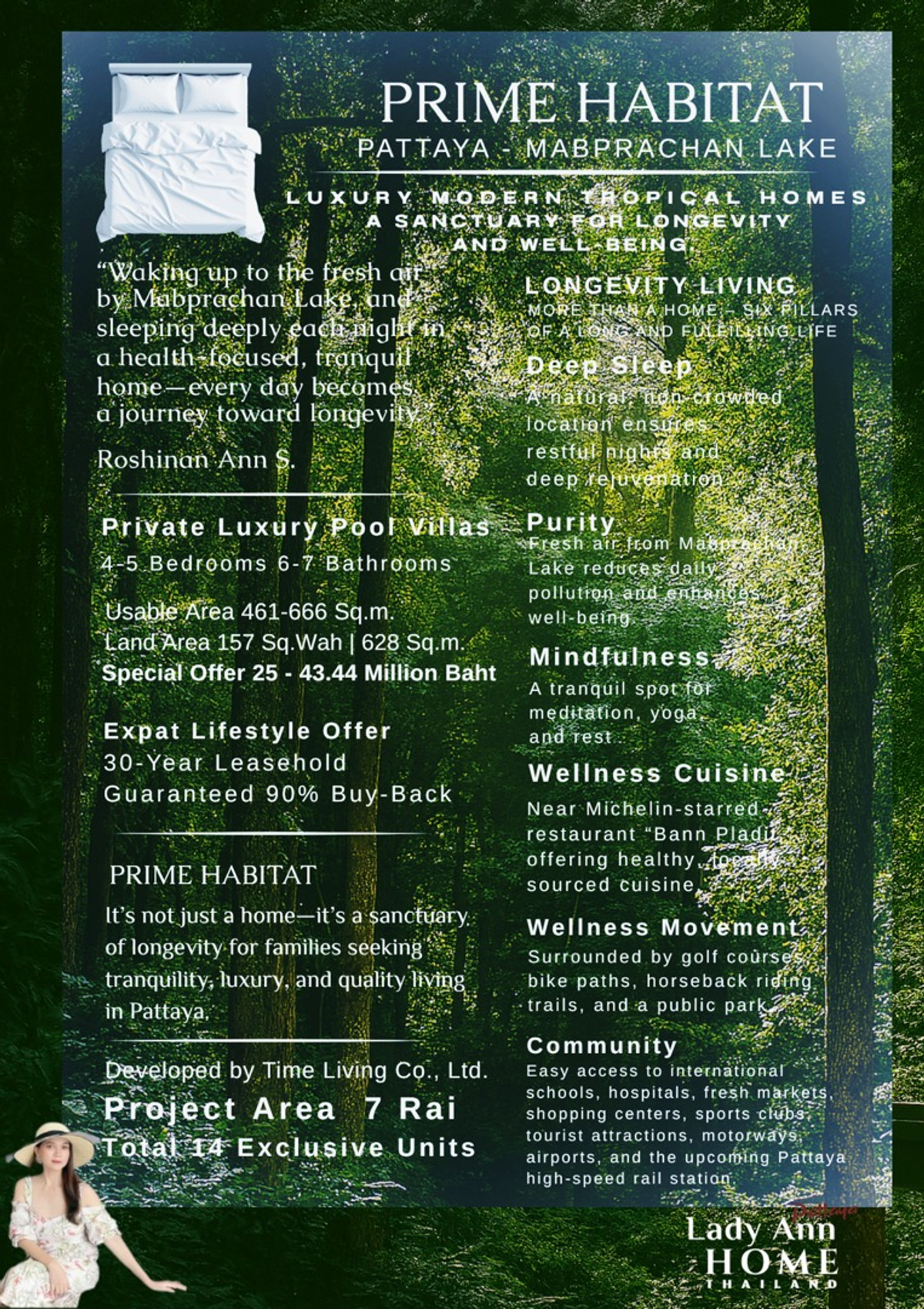 ค้นพบจุดหมายปลายทางแห่งใหม่ของชีวิต ที่อยู่อาศัยที่เน้นการได้ใช้ชีวิตยืนยาว ในสภาพแวดล้อมทางธรรมชาติที่งดงาม ใกล้ทะเล แม่น้ำ ภูเขา ในปี 2569 บ้านน่าอยู่อาศัย..ตอบโจทย์ชีวิตที่เหลืออยู่ เริ่มต้นวางรากฐานสุขภาพที่ดีในวันนี้ เพื่อชีวิตที่ยืนยาว 5 ทำเลทอง 5 เมืองท่องเที่ยว พัทยา | ระยอง | เขาใหญ่ | กรุงเทพฯ | นครปฐม ——————————————————- PRIME HABITAT PATTAYA พิกัด พัทยา – อ่างเก็บน้ำมาบประชัน บ้านพักสไตล์ทรอปิคอลโมเดิร์น ที่ออกแบบเพื่อการอยู่อาศัยอย่างยั่งยืน พื้นที่โครงการขนาด : 7 ไร่ จำนวนยูนิต : 14 หลัง รูปแบบบ้าน : 2 แบบ Modern Tropical House วิลล่าพร้อมสระว่ายน้ำส่วนตัว | วิลล่าพร้อมดาดฟ้าส่วนตัว 4–5 ห้องนอน | 6–7 ห้องน้ำ พื้นที่ใช้สอย : 461–666 ตร.ม. ขนาดที่ดิน : 157 ตร.วา | 628 ตร.ม. ราคาพิเศษ : 25 - 43.44 ล้านบาท ข้อเสนอสำหรับชาวต่างชาติ สิทธิการเช่าระยะยาว 30 ปี การันตีซื้อคืน 90%*** ตามเงื่อนไขที่บริษัทกำหนด ที่นี่…ไม่ใช่แค่บ้าน แต่คือ "สถานที่แห่งการฟื้นคืนพลัง" สำหรับครอบครัวที่แสวงหาความสงบ ความหรูหรา และคุณภาพชีวิตที่แท้จริง LONGEVITY LIVING 6 เสาหลัก ตอบโจทย์รากฐานสำคัญเพื่อชีวิตที่ยืนยาว • การนอนหลับลึก บ้านในทำเลเงียบสงบ ไม่แออัด ช่วยให้พักผ่อนได้เต็มที่ • ความบริสุทธิ์ อากาศสดชื่นจากอ่างเก็บน้ำ ช่วยลดมลภาวะ เสริมสุขภาพ • ความสงบในใจ พื้นที่เหมาะสำหรับการทำสมาธิ โยคะ และการพักผ่อน • อาหารเพื่อสุขภาพ ใกล้ร้านอาหารระดับมิชลิน "บ้านปลาดิษฐ์" ที่เน้นวัตถุดิบท้องถิ่นและเมนูสุขภาพ • การเคลื่อนไหวเพื่อสุขภาพ รายล้อมด้วยสนามกอล์ฟ เส้นทางปั่นจักรยาน ขี่ม้า และสวนสาธารณะ • ชุมชนคุณภาพ เดินทางสะดวกสู่โรงเรียนนานาชาติ โรงพยาบาล ตลาดสด ศูนย์การค้า คลับกีฬา แหล่งท่องเที่ยว มอเตอร์เวย์ สนามบิน และสถานีรถไฟความเร็วสูงแห่งใหม่ของพัทยา The 2026 Destination for Longevity Living SEA | RIVER | MOUNTAIN Begin your journey in 5 destination cities of Thailand~where new homes meet high-speed rail and nature’s rhythm. If your destination is to find a residence that emphasizes longevity in a beautiful natural environment, close to the sea, rivers, mountains, and tourist attractions, restaurants, cafes, fresh markets, communities, international schools, golf courses, yacht and spas. "Where the rest of life finds its meaning" _________________________ PRIME HABITAT POOLVILLAS PATTAYA Location | Pattaya - Mabprachan Lake Developed by Time Living Co., Ltd. Project Area 7 Rai Total : Exclusive 14 Units Villas Type Private Pool Villas & Private Pool Villa with Rooftop Advance Smart Home Technology Underground Electric 4-5 Bedrooms 6-7 Bathrooms Usable Area 461-666 Sq.m Land Area 157 Sq.wah | 628 Sq.m Special Offer 25 - 43.44 Million Baht Highlight Exclusively for Expats and Foreign Couples 🌿 Expat Lifestyle Privilege • 30-Year Leasehold With the option to renew for another 30 years — at a fixed rental value • Guaranteed Buy-Back Up to 90% of market value in Year 30 **Terms & Conditions apply by Time Living Co., Ltd. พิกัด พัทยา-อ่างเก็บน้ำมาบประชัน 6-17 นาที ถึง ร.ร นานาชาติ 4 แห่ง The Regent’s International School Mooltripakdee International School Rugby School Thailand 12 นาที ถึง สนามกอล์ฟ 2 แห่ง Siam Country Club Old Course Pattaya Country Club 16 นาที ถึง ตลาดอาหารทะเลสดๆ ลานโพธิ์นาเกลือ 12 นาที ถึง มอเตอร์เวย์ กรุงเทพฯ-พัทยา-ระยอง 15 นาท