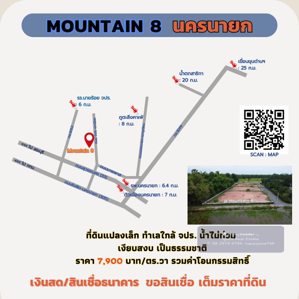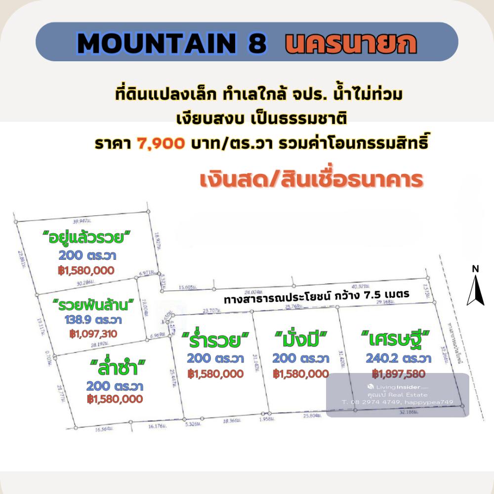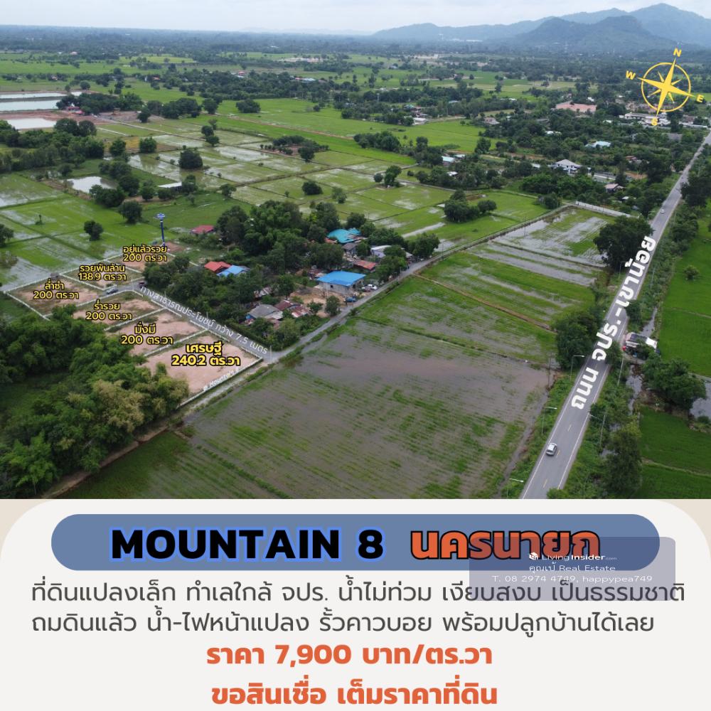 ที่ดินนครนายก 200 ตร.วา ใกล้ จปร. ที่ดินพัฒนาเชิงเกษตร บรรยากาศสงบสบาย ผ่อนธนาคารได้ 🌲โครงการ Mountain 8 : จ.นครนายก 📣 ตำบล พรหมณี อำเภอ เมืองนครนายก จังหวัด นครนายก ที่ดินพัฒนาเชิงเกษตร บรรยากาศสงบสบาย ☑️ วิวเขา จปร. และ วิวเขาพระ สวยงาม บรรยากาศ สบายๆ 🎉 บรรยากาศวิวเขาสวยๆ เหมือนหุบเขา ทำเลดี เดินทางสะดวก ไม่เปลี่ยว ใกล้แหล่งความเจริญ 🔰 ที่ดินแปลงย่อยมีเพียง 6 แปลง เท่านั้น 💢 เนื้อที่ประมาณ 100-200 ตารางวา/แปลง 🎉เนื้อที่แปลงเล็ก ราคาล้านต้นๆ พร้อมปลูกบ้านสวน วิวเขา มีเพื่อนบ้านหลายท่าน 💝 ราคา 💝 🎯 ราคาปกติ 10,000 บาท/ตารางวา 🎁 ราคาพิเศษ ช่วงเดือนนี้ เพียง 7,900 บาท/ตารางวา 💕 รายละเอียดการพัฒนาที่ดิน💕 ☑️ ที่ดิน ถมดินแล้วเรียบร้อยสวยงาม ☑️ รั้วคอกม้าสีขาวรอบแปลง ☑️ ถนนสาธารณประโยชน์ภายในโครงการ กว้าง 7.5 เมตร ☑️ ไฟฟ้า ประปา พร้อมหน้าแปลง ☑️ ฟรี ค่าโอนกรรมสิทธิ์ ☑️ ฟรี สินเชื่อธนาคารกรุงเทพ 📌ปักหมุด https://goo.gl/maps/EVqku9eqZCHKci3w8 สถานที่ใกล้เคียง โรงถ่ายละครไทยรัฐ 0.5 กม. รพ.สต. ตอไม้แดง 0.5 กม. โรงพยาบาลนครนายก 6.4 กม. โรงพยาบาล รร.นายร้อย จปร. 8 กม. รร.นายร้อย จปร. 8 กม. เอเดนฟาร์ม 8.6 กม. วัดมณีวงศ์ 12.5 กม. อุทยานพระพิฆเนศ 11.5 กม. น้ำตกสาริกา 20.2 กม. เขื่อนขุนด่านปราการชล 24.6 กม. อช.เขาใหญ่ 68 กม. 📢สอบถามรายละเอียดเพิ่มเติม ติดต่อ 🤵คุณเป้ Real Estate Agent รับฝาก ซื้อ-ขาย ที่ดินสวย เพื่อการลงทุน ธุรกิจ และอยู่อาศัย 📞Tel. คลิกเพื่อดูเบอร์โทรติดต่อ 📟 Line : happypea749 คลิก https://line.me/ti/p/WbmkWfUuvu 🎉ดูที่ดินแปลงอื่นๆ https://www.livinginsider.com/public_profile/1/eDbjy.html #ขายที่ดินนครนายก #ที่ดิน200ตรว #นครนายก #ที่ดินเปล่านครนายก #ที่ดินจปร #บ้านสวน #Mountain8 #ที่ดินนครนายก #ที่ดินเขาเพิ่ม