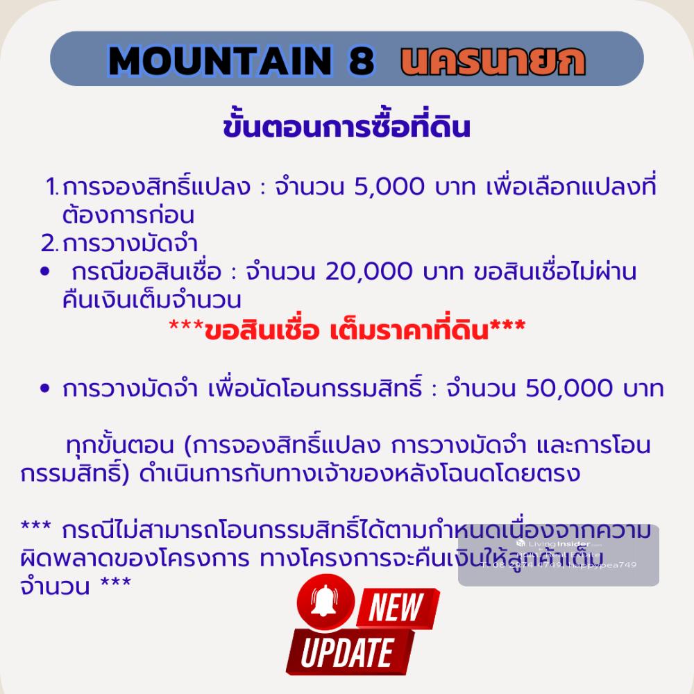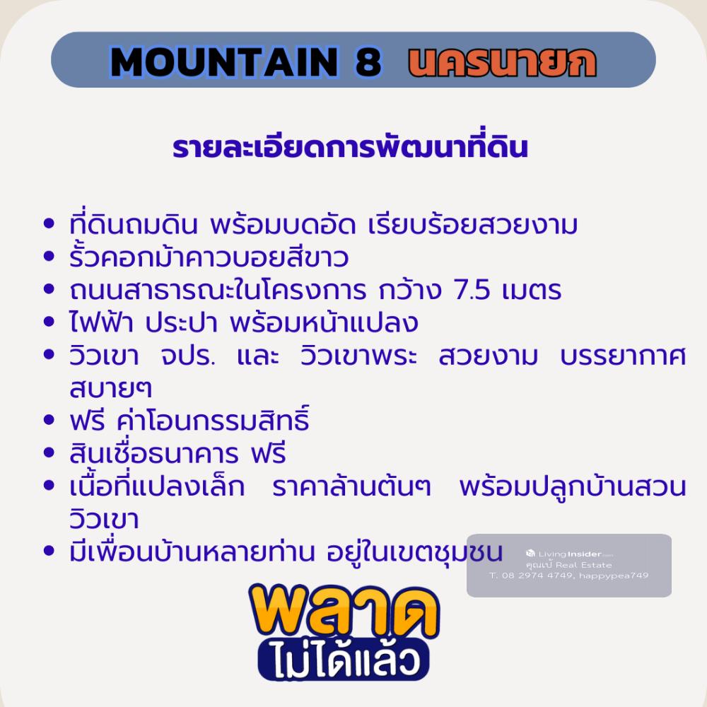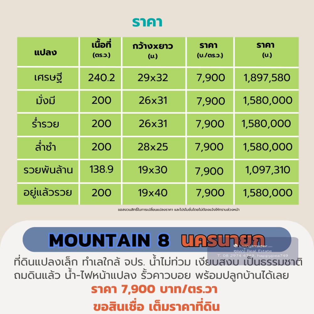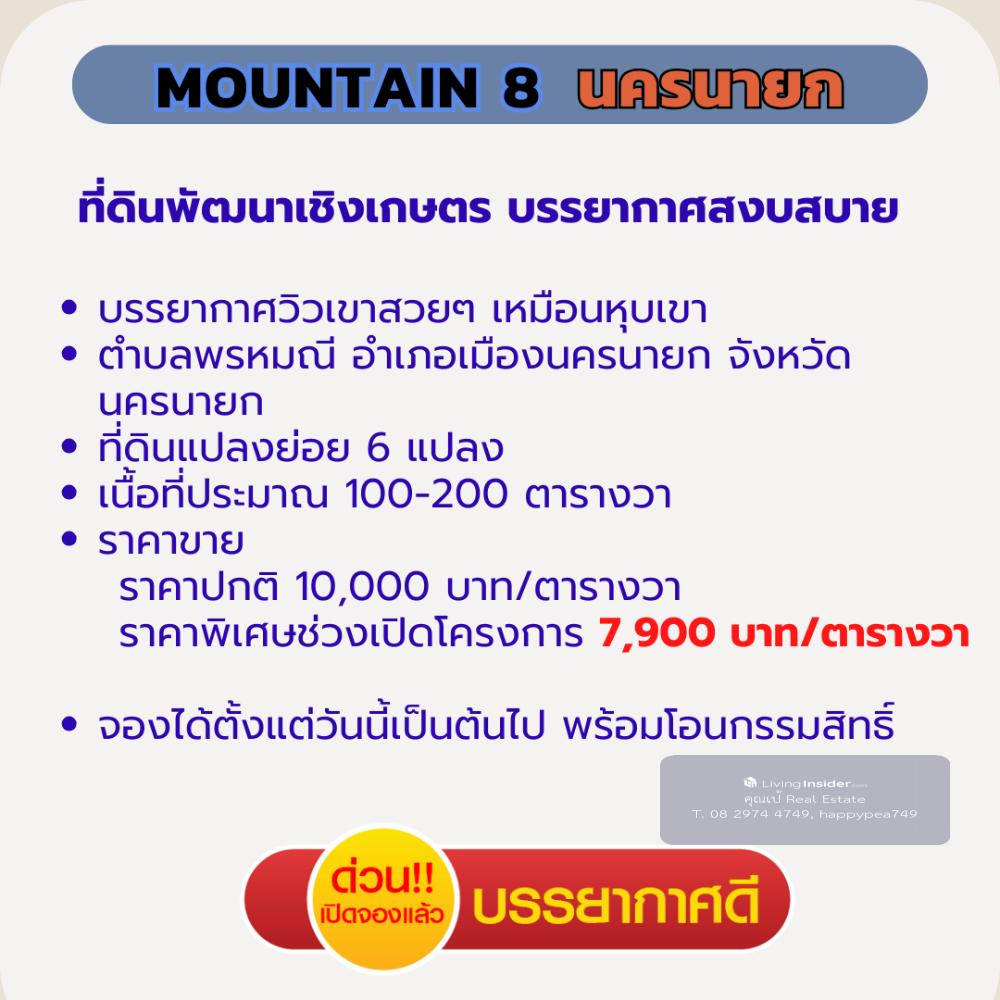 ที่ดินนครนายก 200 ตร.วา ใกล้ จปร. ที่ดินพัฒนาเชิงเกษตร บรรยากาศสงบสบาย ผ่อนธนาคารได้ 🌲โครงการ Mountain 8 : จ.นครนายก 📣 ตำบล พรหมณี อำเภอ เมืองนครนายก จังหวัด นครนายก ที่ดินพัฒนาเชิงเกษตร บรรยากาศสงบสบาย ☑️ วิวเขา จปร. และ วิวเขาพระ สวยงาม บรรยากาศ สบายๆ 🎉 บรรยากาศวิวเขาสวยๆ เหมือนหุบเขา ทำเลดี เดินทางสะดวก ไม่เปลี่ยว ใกล้แหล่งความเจริญ 🔰 ที่ดินแปลงย่อยมีเพียง 6 แปลง เท่านั้น 💢 เนื้อที่ประมาณ 100-200 ตารางวา/แปลง 🎉เนื้อที่แปลงเล็ก ราคาล้านต้นๆ พร้อมปลูกบ้านสวน วิวเขา มีเพื่อนบ้านหลายท่าน 💝 ราคา 💝 🎯 ราคาปกติ 10,000 บาท/ตารางวา 🎁 ราคาพิเศษ ช่วงเดือนนี้ เพียง 7,900 บาท/ตารางวา 💕 รายละเอียดการพัฒนาที่ดิน💕 ☑️ ที่ดิน ถมดินแล้วเรียบร้อยสวยงาม ☑️ รั้วคอกม้าสีขาวรอบแปลง ☑️ ถนนสาธารณประโยชน์ภายในโครงการ กว้าง 7.5 เมตร ☑️ ไฟฟ้า ประปา พร้อมหน้าแปลง ☑️ ฟรี ค่าโอนกรรมสิทธิ์ ☑️ ฟรี สินเชื่อธนาคารกรุงเทพ 📌ปักหมุด https://goo.gl/maps/EVqku9eqZCHKci3w8 สถานที่ใกล้เคียง โรงถ่ายละครไทยรัฐ 0.5 กม. รพ.สต. ตอไม้แดง 0.5 กม. โรงพยาบาลนครนายก 6.4 กม. โรงพยาบาล รร.นายร้อย จปร. 8 กม. รร.นายร้อย จปร. 8 กม. เอเดนฟาร์ม 8.6 กม. วัดมณีวงศ์ 12.5 กม. อุทยานพระพิฆเนศ 11.5 กม. น้ำตกสาริกา 20.2 กม. เขื่อนขุนด่านปราการชล 24.6 กม. อช.เขาใหญ่ 68 กม. 📢สอบถามรายละเอียดเพิ่มเติม ติดต่อ 🤵คุณเป้ Real Estate Agent รับฝาก ซื้อ-ขาย ที่ดินสวย เพื่อการลงทุน ธุรกิจ และอยู่อาศัย 📞Tel. คลิกเพื่อดูเบอร์โทรติดต่อ 📟 Line : happypea749 คลิก https://line.me/ti/p/WbmkWfUuvu 🎉ดูที่ดินแปลงอื่นๆ https://www.livinginsider.com/public_profile/1/eDbjy.html #ขายที่ดินนครนายก #ที่ดิน200ตรว #นครนายก #ที่ดินเปล่านครนายก #ที่ดินจปร #บ้านสวน #Mountain8 #ที่ดินนครนายก #ที่ดินเขาเพิ่ม