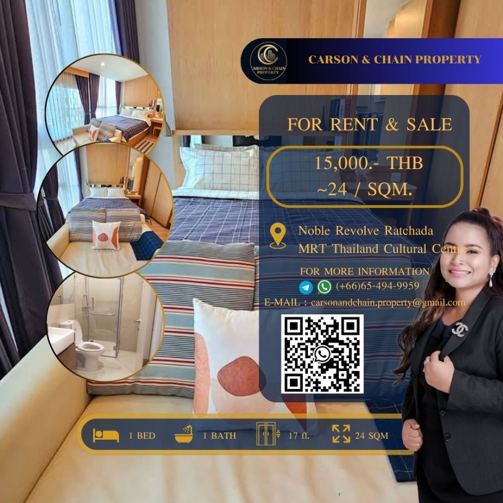 Condominium near to MRT Thailand Cultural Centre Station 80 Meters / Fully Furnished with appliances Unite Details: Code: #CC054 Length of contract: 1 Year Availability: Ready to move in Project Name: Noble Revolve Ratchada Zone: Ratchada Rental Price: 15,000.- THB Bedroom: 1 (Studio) Bathroom: 1 Unit Size: 24 sqm Floor: 17 Facilities ✅ Fully Furnished, Nice decoration. ✅ Swimming pool / Sauna room ✅ Fitness Why contact us? We help EXPATS who are anxious about moving to Bangkok to get the safest and most convenient experience, event if you have never been to Thailand before, during THE WHOLE LEASE AGREEMENT with us. "Carson&Chain Property YOUR LIVING AND BUSINESS, SIMPLIFIED" Contact the best team in your favorite language WhatsApp Business: คลิกเพื่อดูเบอร์โทรติดต่อ Mobile 66 63 – 146 - 4287 ( GAO ) Mobile 66 92- 626 - 4591 (Kitty) Line @carsonproperty Link Line : https://lin.ee/KoEH0ds Link Messenger Facebook : m.me/ คลิกเพื่อดูเบอร์โทรติดต่อ