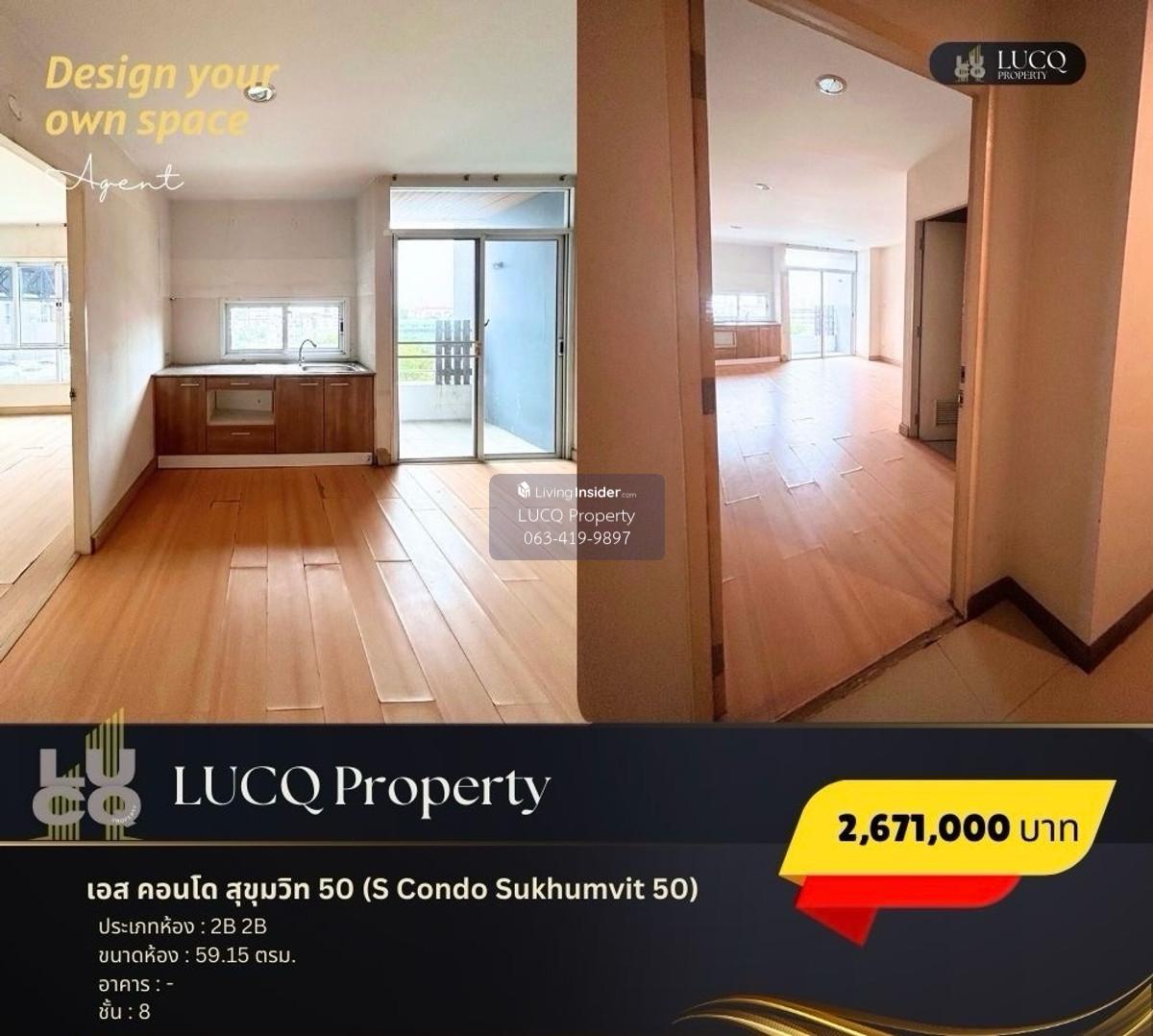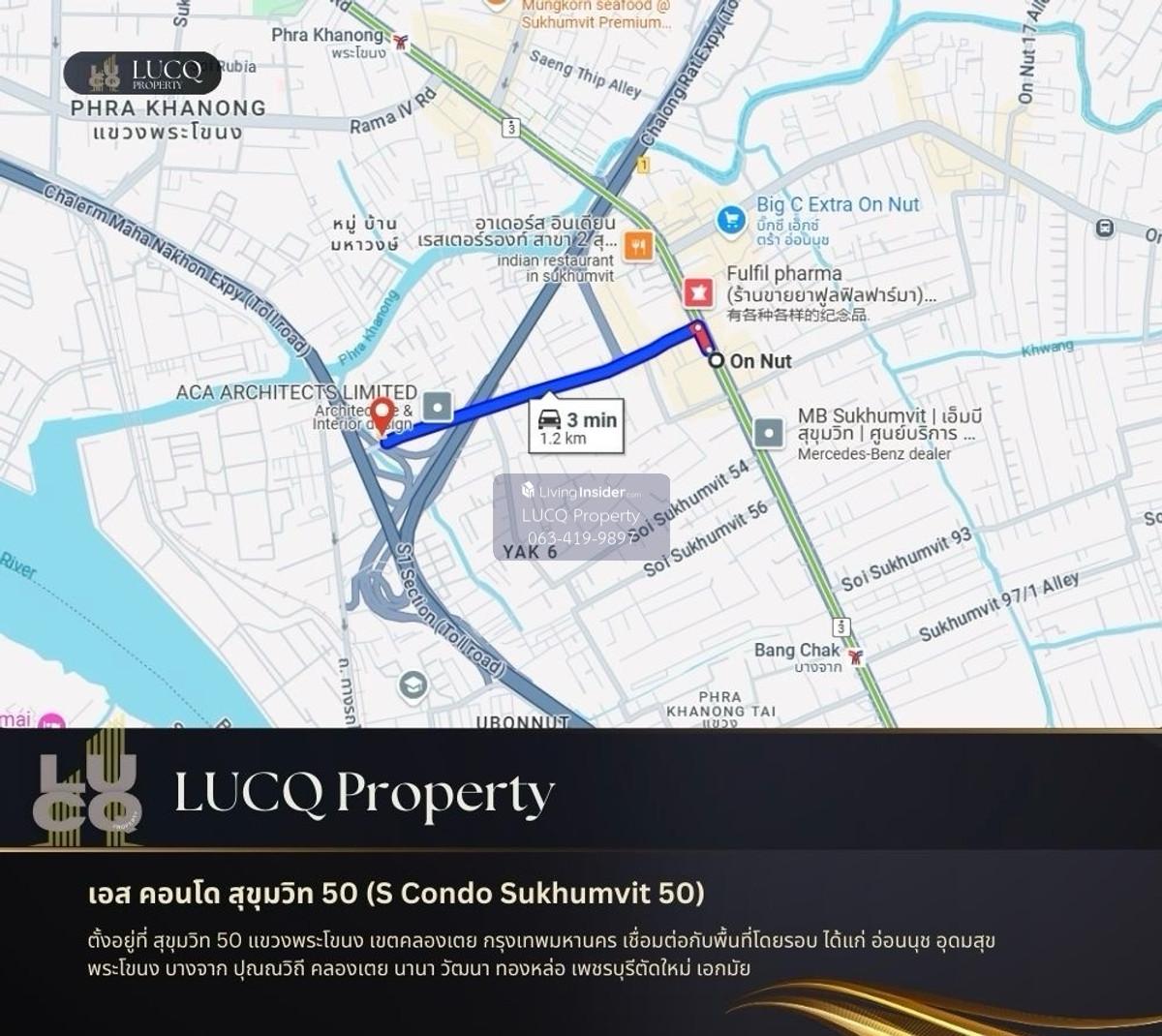 เอส คอนโด สุขุมวิท 50 (S Condo Sukhumvit 50) ตั้งอยู่ที่ สุขุมวิท 50 แขวงพระโขนง เขตคลองเตย กรุงเทพมหานคร เชื่อมต่อกับพื้นที่โดยรอบ ได้แก่ อ่อนนุช อุดมสุข พระโขนง บางจาก ปุณณวิถี คลองเตย นานา วัฒนา ทองหล่อ เพชรบุรีตัดใหม่ เอกมัย ราคา 2,671,000 บาท สำหรับพื้นที่ใช้สอยขนาด 59.15 ตรม. และ ราคา 3,318,000 บาท สำหรับพื้นที่ใช้สอยขนาด 73.47 ตรม. ภายในห้องถูกแบ่งออกเป็น 2 ห้องนอน 2 ห้องน้ำ พื้นที่บริเวณตรงกลางและระเบียงขนาดใหญ่เหมาะสำหรับการพักผ่อน และครัวภายในที่ถูกจัดวางอย่างเป็นสัดส่วน สิ่งอำนวยความสะดวกภายในโครงการ - สระว่ายน้ำ - Fitness สถานที่ใกล้เคียง - สถานีรถไฟฟ้าบีทีเอส อ่อนนุช (BTS On Nut Station) ระยะทาง 1.2 กิโลเมตร (2 นาที) - โลตัส สุขุมวิท 50 (Lotus’s Sukhumvit 50) ระยะทาง 1.1 กิโลเมตร (2 นาที) - เกทเวย์ เอกมัย (Gateway Ekamai) ระยะทาง 3.4 กิโลเมตร (6 นาที) - เมเจอร์ ซีนีเพล็กซ์ สุขุมวิท (Major Cineplex Sukhumvit) ระยะทาง 3.7 กิโลเมตร (6 นาที) - บิ๊กซี พระราม 4 (Big C Extra Rama 4) ระยะทาง 5.0 กิโลเมตร (6 นาที) - เอ็มโพเรียม (Emporium) ระยะทาง 4.6 กิโลเมตร (7 นาที) - เอ็มควอเทียร์ (EmQuartier) ระยะทาง 4.7 กิโลเมตร (7 นาที) - เอ็มสเฟียร์ (EmSphere) ระยะทาง 5.2 กิโลเมตร (8 นาที) - เทอร์มินอล 21 อโศก (Terminal 21 Asok) ระยะทาง 6.0 กิโลเมตร (10 นาที) - โรบินสัน สุขุมวิท (Robinson Sukhumvit) ระยะทาง 6.0 กิโลเมตร (10 นาที) - เซ็นทรัลเวิลด์ (Central World) ระยะทาง 9.2 กิโลเมตร (13 นาที) - สยามพารากอน (Siam Paragon) ระยะทาง 9.4 กิโลเมตร (13 นาที) - โรงพยาบาลกล้วยน้ำไท (Kluaynamthai Hospital) ระยะทาง 2.6 กิโลเมตร (4 นาที) - โรงพยาบาลสุขุมวิท (Sukhumvit Hospital) ระยะทาง 3.3 กิโลเมตร (6 นาที) - โรงพยาบาลสมิติเวช สุขุมวิท (Samitivej Sukhumvit Hospital) ระยะทาง 4.8 กิโลเมตร (8 นาที) - โรงเรียนนานาชาติแองโกล สิงคโปร์ (Anglo Singapore International School) ระยะทาง 3.4 กิโลเมตร (5 นาที) - โรงเรียนนานาชาติเอกมัย (Ekamai International School) ระยะทาง 5.5 กิโลเมตร (9 นาที) - มหาวิทยาลัยศรีนครินทรวิโรฒ ประสานมิตร (Srinakharnwirot University) ระยะทาง 6.5 กิโลเมตร (11 นาที) - จุฬาลงกรณ์มหาวิทยาลัย (Chulalongkorn University) ระยะทาง 9.2 กิโลเมตร (14 นาที) - ศูนย์ประชุมแห่งชาติสิริกิติ์ (Queen Sirikit National Convention Center) ระยะทาง 5.8 กิโลเมตร (8 นาที) - สวนเบญจกิติ (Benchakiti Park) ระยะทาง 6.2 กิโลเมตร (10 นาที) #ขายคอนโด #scondo #คอนโดสุขุมวิท #คอนโดราคาถูก #คอนโดมือสอง #2ห้องนอน #การลงทุน สอบถามข้อมูลเพิ่มเติม โทรศัพท์ คลิกเพื่อดูเบอร์โทรติดต่อ (Yoq) Line Official: @lucq.property