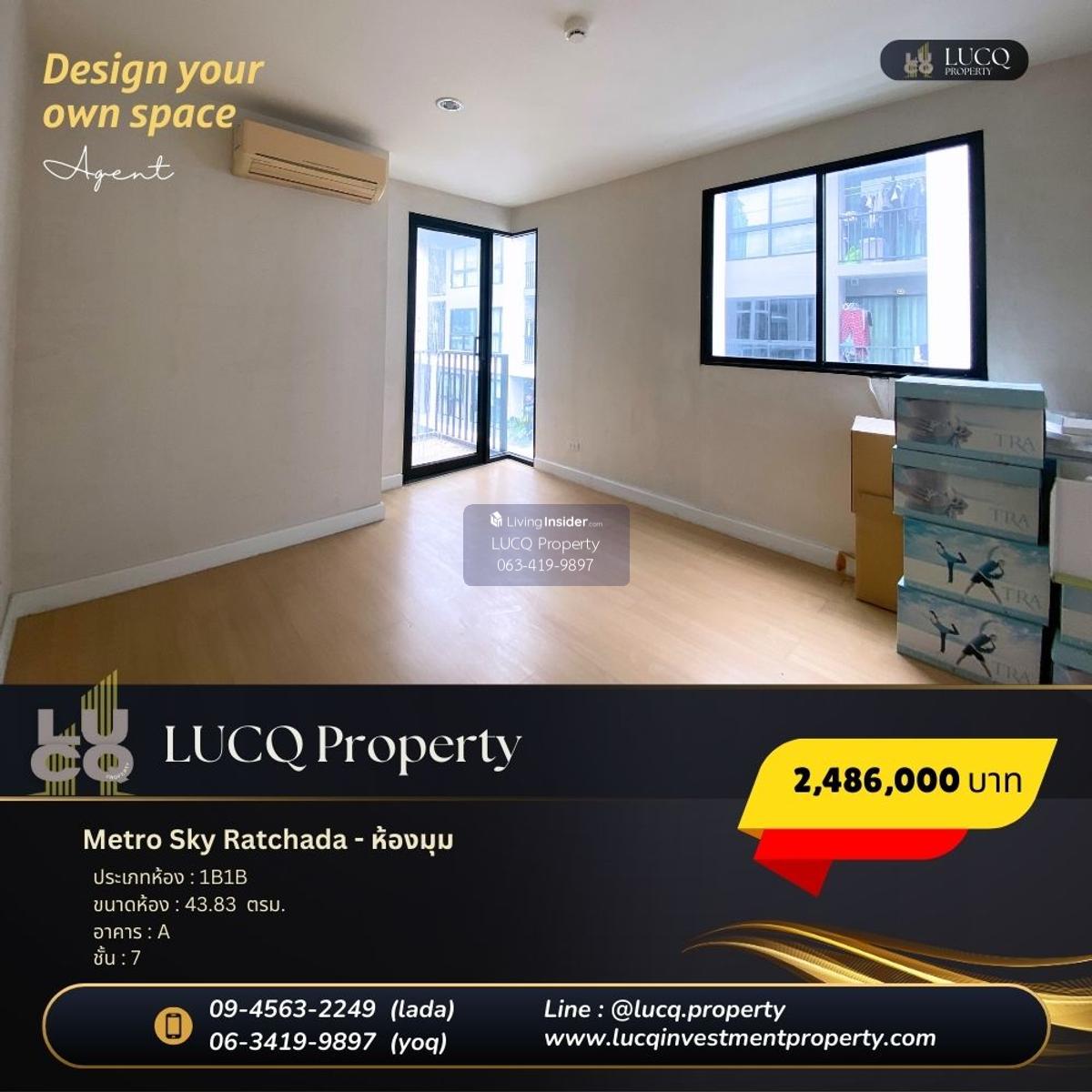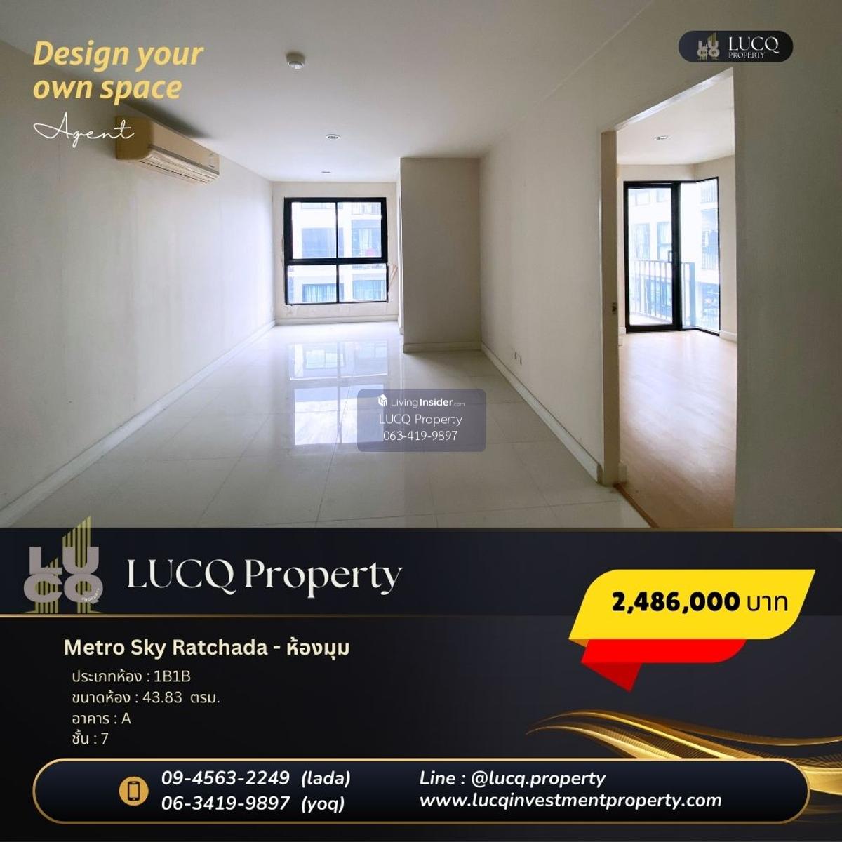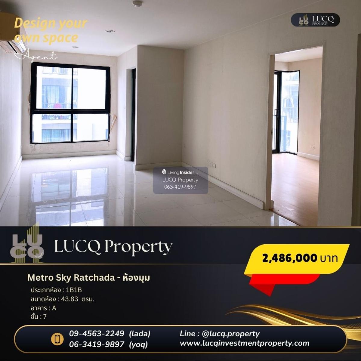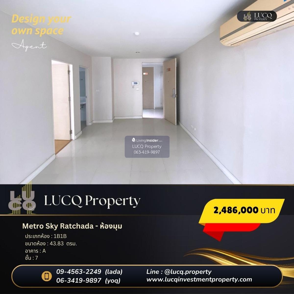 เมโทร สกาย รัชดา (Metro Sky Ratchada) 🌳 ตั้งอยู่ที่ ซอย อินทามระ 47 แขวงรัชดาภิเษก เขตดินแดง กรุงเทพมหานคร เชื่อมต่อกับพื้นที่โดยรอบ ได้แก่ รัชดาภิเษก ห้วยขวาง อินทามาระ สะพานควาย ลาดพร้าว สุทธิสารวินิจฉัย 💰ราคา 2,420,000 บาท พื้นที่ใช้สอยขนาด 44.32 ตรม. (อาคาร A ชั้น 4) 💰ราคา 2,486,000 บาท พื้นที่ใช้สอยขนาด 43.83 ตรม. (อาคาร A ชั้น 7) พื้นที่ใช้สอยภายในห้องถูกแบ่งออกเป็น 1 ห้องนอน 1 ห้องน้ำ พื้นที่บริเวณตรงกลางสำหรับการพักผ่อน และห้องครัวที่แยกออกมาอย่างเป็นสัดส่วน 🌳 สิ่งอำนวยความสะดวกภายในโครงการ - สระว่ายน้ำ - Fitness - ห้องยิมนาสติก - ห้องซาวน่า - 7-11 (Seven Eleven) 📍 สถานที่ใกล้เคียง - สถานีรถไฟฟ้าสายสีน้ำเงิน สถานีสุทธิสาร (Sutthisan MRT Blue Line Station) ระยะทาง 950 เมตร (2 นาที) - สถานีรถไฟฟ้าสายสีน้ำเงิน สถานีรัชดาภิเษก (Ratchadaphisek MRT Blue Line Station) ระยะทาง 1.9 กิโลเมตร (3 นาที) - สถานีรถไฟฟ้าบีทีเอส สถานีสะพานควาย (Saphan Khwai BTS Station) ระยะทาง 3.6 กิโลเมตร (9 นาที) - บริษัท เมืองไทยประกันชีวิต จํากัด (มหาชน) (Muang Thai Life Assurance Public Company Limited) ระยะทาง 1.3 กิโลเมตร (3 นาที) - เดอะ สตรีท รัชดา (The Street Ratchada) ระยะทาง 1.8 กิโลเมตร (4 นาที) - ฟอร์จูนทาวน์ (Fortune Town) ระยะทาง 3.6 กิโลเมตร (6 นาที) - ศาลอาญา (Criminal Court) ระยะทาง 3.9 กิโลเมตร (6 นาที) - เซ็นทรัล พระราม 9 (Central Rama 9) ระยะทาง 3.6 กิโลเมตร (6 นาที) - เอสพละนาด รัชดาฯ (Esplanade Ratchada) ระยะทาง 3.0 กิโลเมตร (7 นาที) - จี ทาวเวอร์ (G Tower Grand Rama 9) ระยะทาง 4.4 กิโลเมตร (8 นาที) - โรงพยาบาลพญาไท พหลโยธิน (Phyathai Phaholyothin Hospital) ระยะทาง 3.1 กิโลเมตร (8 นาที) - โรงพยาบาลวิมุต (Vimut Hospital) ระยะทาง 3.1 กิโลเมตร (8 นาที) - โรงพยาบาลพระรามเก้า (Praram 9 Hospital) ระยะทาง 4.6 กิโลเมตร (9 นาที) - มหาวิทยาลัยหอการค้าไทย (University of The Thai Chamber of Commerce) ระยะทาง 2.0 กิโลเมตร (6 นาที) - มหาวิทยาลัยราชภัฏจันทรเกษม (Chandrakasem Rajabhat University) ระยะทาง 5.4 กิโลเมตร (7 นาที) ✳️ สอบถามข้อมูลเพิ่มเติม โทรศัพท์ คลิกเพื่อดูเบอร์โทรติดต่อ (Lada) หรือ คลิกเพื่อดูเบอร์โทรติดต่อ (Yoq) Line Official: @lucq.property