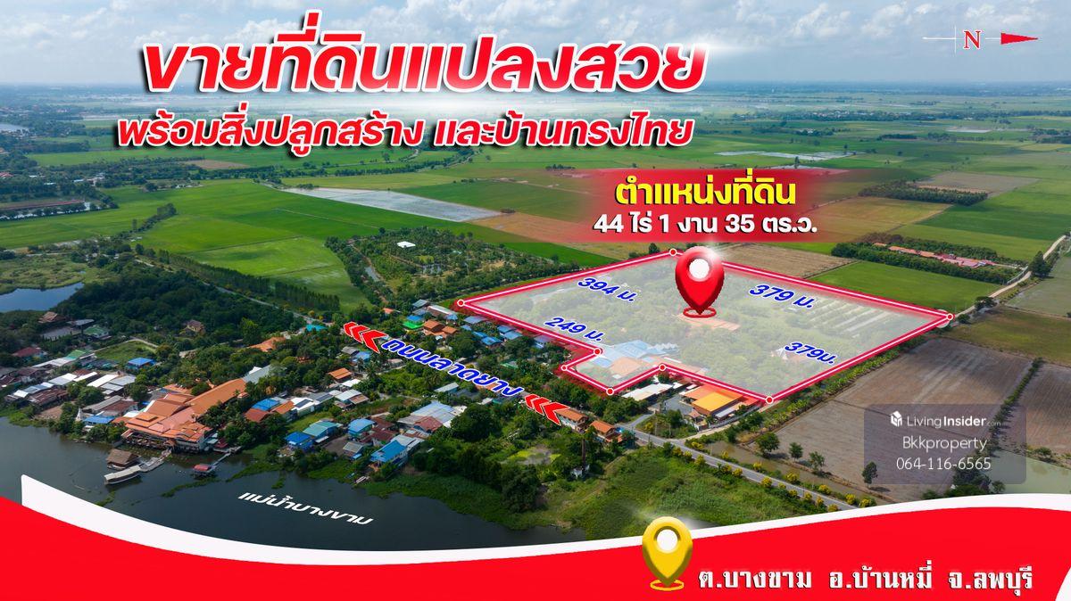 บ้านทรงไทย บนเนื้อที่ 44 ไร่ 66 ตร.ว. อ.บ้านหมี่ จ.ลพบุรี โฉนดครุฑแดง พร้อมสิ่งปลูกสร้าง