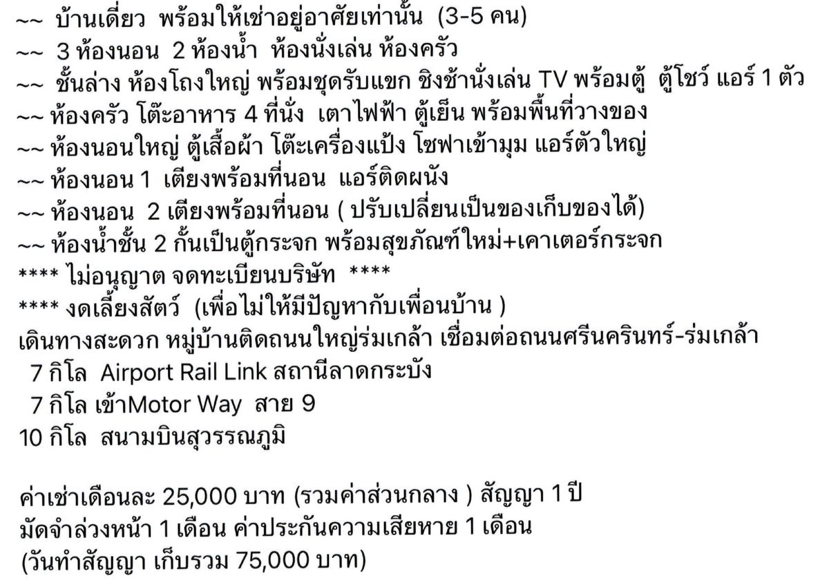 ให้เช่า บ้านเดี่ยว2ชั้น 50ตรว.อยู่ร่มเกล้า-สนามบินสุวรรณภูมิ