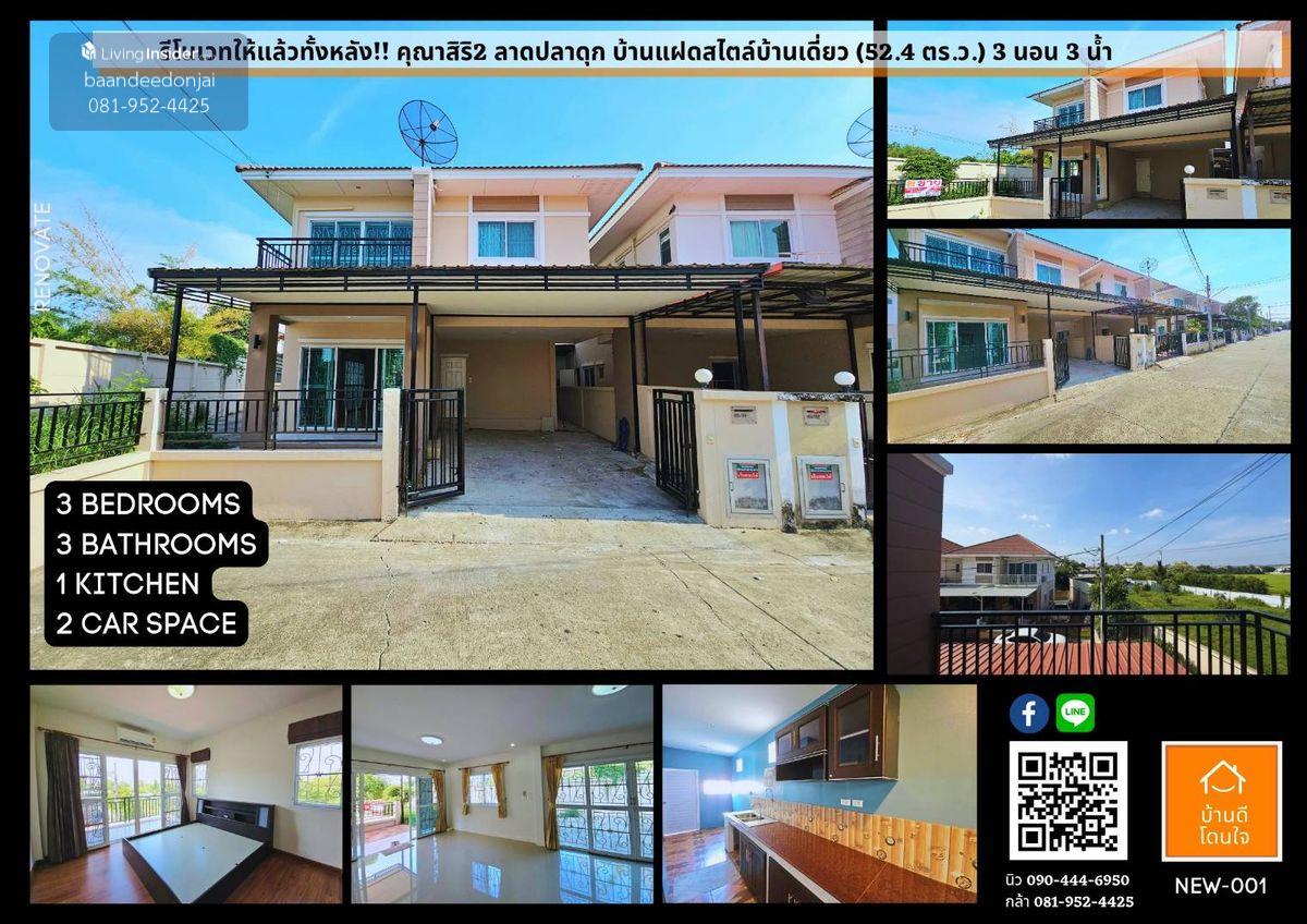 โปรไฟไหม้🔥บ้านเดี่ยว คุณาสิริ2 ลาดปลาดุก (52.4 ตร.ว.) 3 นอน 3 น้ำ รีโนเวทใหม่ สวยพร้อมอยู่ รีโนเวทให้แล้วทั้งหลัง!! ++ ราคาพิเศษ 3.49 ล้าน (จากเดิม 3.89 ล้าน) รายละเอียด - หมู่บ้าน คุณาสิริ2 ลาดปลาดุก ตำบล บางคูรัด อำเภอบางบัวทอง นนทบุรี 11110 พิกัด https://maps.app.goo.gl/fuRyw2NrLDANohpr5?g_st=com.google.maps.preview.copy - เนื้อที่ 52.4 ตารางวา - พื้นที่ใช้สอย 145 ตารางเมตร - 3 นอน 3 ห้องน้ำ 1 ห้องรับแขก 1 ห้องอเนกประสงค์ - พื้นที่ว่างข้างบ้านกว่า 17 ตารางวา จะต่อเติมเพิ่ม ทำสวน ได้ตามใจ - จอดรถ 2 คัน แอร์ 4 ตัว มุ้งลวด เหล็กดัด ม่าน - หน้าบ้าน หันทิศเหนือ - ต่อเติม ครัวไทย (ลงเสาเข็ม micropile) ไม่ต้องกลัวทรุด และหลังคาโรงรถ - ค่าส่วนกลางประมาณ 1,000 บาท/เดือน การเดินทางสะดวก - ใช้เส้นทางหลักถนนกาญจนาภิเษก เข้าสู่ซอยถนนวัดลาดปลาดุก เข้าซอยถนนเลียบคลองบางไทร ใกล้วงแหวนรอบนอกกรุงเทพฯ ฝั่งตะวันตก - ใกล้ทางพิเศษศรีรัช-วงแหวนรอบนอก - ใกล้รถไฟฟ้าสายสีม่วง สถานีคลองบางไผ่ สิ่งอำนวยความสะดวก - ระบบรักษาความปลอดภัย 24 ชั่วโมง ทำเลดี สถานที่ใกล้เคียง - ใกล้เซ็นทรัล เวสต์เกต - อิเกีย บางใหญ่ - บิ๊กซี บางใหญ่ - เทสโก้ โลตัส - พลัสมอลล์ - โรงพยาบาลเกษมราษฎร์ รัตนาธิเบศร์ - โรงเรียนกสิณธรเซนต์ปีเตอร์ - ตลาดบางใหญ่ ############################### รหัสทรัพย์ (Code): NEW-001 ทาง LineID : @baandeedonjai หรือคลิกที่นี่: https://lin.ee/qj6jzs0 คุณนิว โทร: คลิกเพื่อดูเบอร์โทรติดต่อ คุณกล้า โทร : คลิกเพื่อดูเบอร์โทรติดต่อ #บ้านดีโดนใจ #บริการด้วยใจคืองานของเรา #รับฝากขายบ้านที่ดินคอนโดกรุงเทพ #บ้านมือสอง #บ้านมือสองราคาถูก #ขายบ้าน #ฝากขายบ้าน #บ้านราคาถูก #คุณาสิริ2 #ลาดปลาดุก #กาญจนาภิเษก #ทางพิเศษศรีรัชวงแหวนรอบนอก #รถไฟฟ้าสายสีม่วง #นนทบุรี #เซ็นทรัลเวสต์เกต #ถนนเลียงคลองบางไทร #บางคูรัด #บางบัวทอง #โรงพยาบาลเกษมราษฎร์ #บางใหญ่ #IKEAบางใหญ่ #บางรักพัฒนา