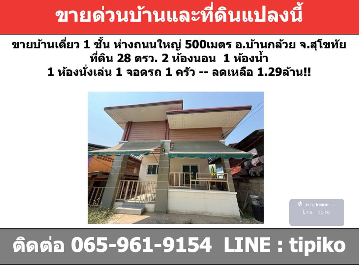 ขายบ้านเดี่ยวหนึ่งชั้น 2นอน 1น้ำ 28ตรว. บ้านกล้วย สุโขทัย