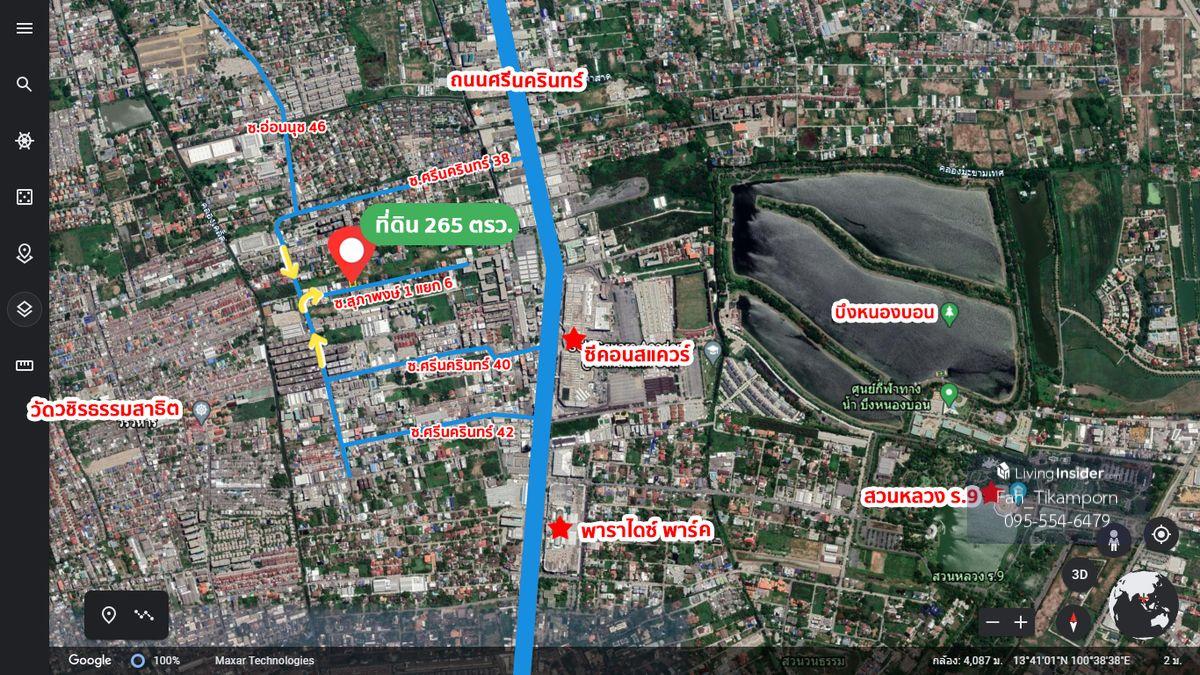🏡ขายที่ดินเปล่า 265 ตรว. หน้ากว้าง 36x29.5 เมตร ซ.สุภาพงษ์ 1แยก6 ตรงข้าม ซีคอนสแควร์ ศรีนครินทร์ กรุงเทพ 🌳รายละเอียดที่ดิน - เนื้อที่ 265 ตารางวา - หน้ากว้าง 36 เมตร ลึก 29.5 เมตร โดยประมาณ - หันทิศใต้ รูปแปลงเป็นรูปสี่เหลี่ยม - ที่ดินผังสีส้ม - เป็นที่ดินจัดสรร เคยมีการถมแล้ว - ในซอยเป็นถนนคอนกรีต 2 เลน 🚩ราคา 23,055,000 บาท (87,000 บาท/ตรว.) สนใจสอบถาม - ราคาต่อรองได้ค่ะ ☎️ คลิกเพื่อดูเบอร์โทรติดต่อ คลิกเพื่อดูเบอร์โทรติดต่อ 🏡 สภาพแวดล้อมและลักษณะเด่น - บรรยากาศดี เงียบสงบ สะอาด ร่มรื่น น่าอยู่ - เหมาะปลูกบ้านพักอาศัย - เหมาะทำออฟฟิศ, โฮมออฟฟิศ, โฮมสตูดิโอ - ในซอยเพิ่งทำถนนและวางท่อระบายน้ำใหม่ 📌ที่ตั้ง : ซอยสุภาพงษ์ 1แยก6 แขวงหนองบอน เขตประเวศ กรุงเทพ - เข้าได้จากซอยศรีนครินทร์ 38,40,42 - เข้าซ.สุภาพงษ์ 1แยก6 มา 200 เมตร ที่ดินอยู่ด้านซ้ายมือ 🏬 สถานที่ใกล้เคียง - ตลาดยงเจริญ - ห้างซีคอนสแควร์ ศรีนครินทร์ - ห้างพาราไดซ์ - สวนหลวงร.9 - รถไฟฟ้าสายสีเหลือง