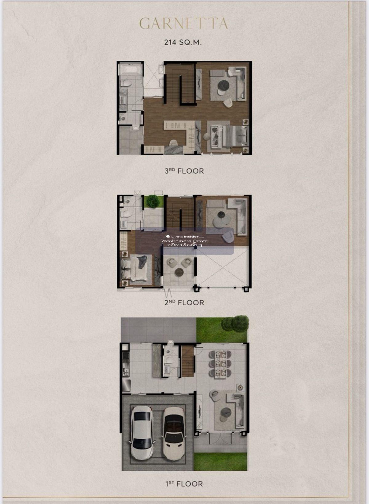 บ้านกลางเมือง คลาสเซ่ รัชโยธิน (Baan Klang Muang Classe Ratchayothin) บ้านแฝดและทาวน์โฮม 3 ชั้น ประเภทบ้าน 3 แบบ ✅Garnet บ้านแฝด 3 ชั้น หน้ากว้าง 13.5 เมตร ที่ดินเริ่มต้น 40.8 ตร.ว. พื้นที่ใช้สอย 234.