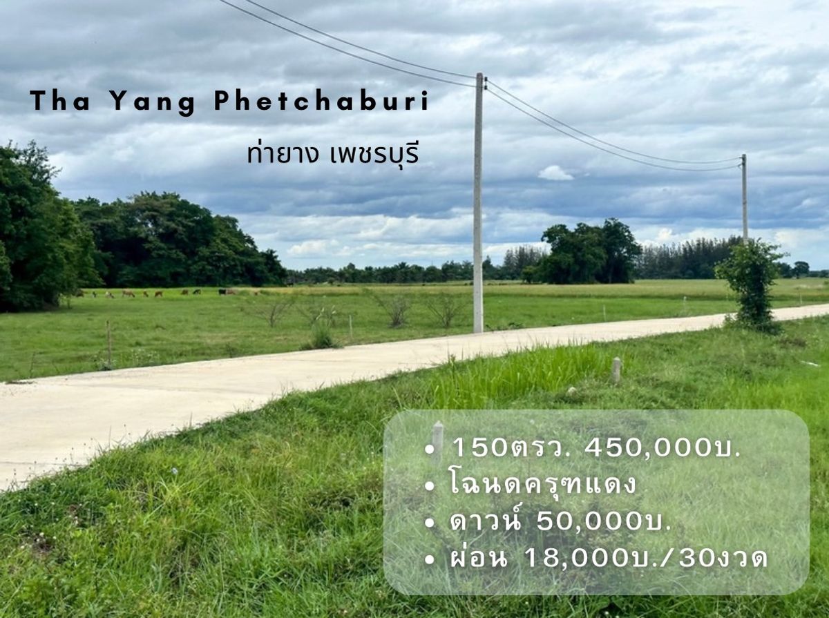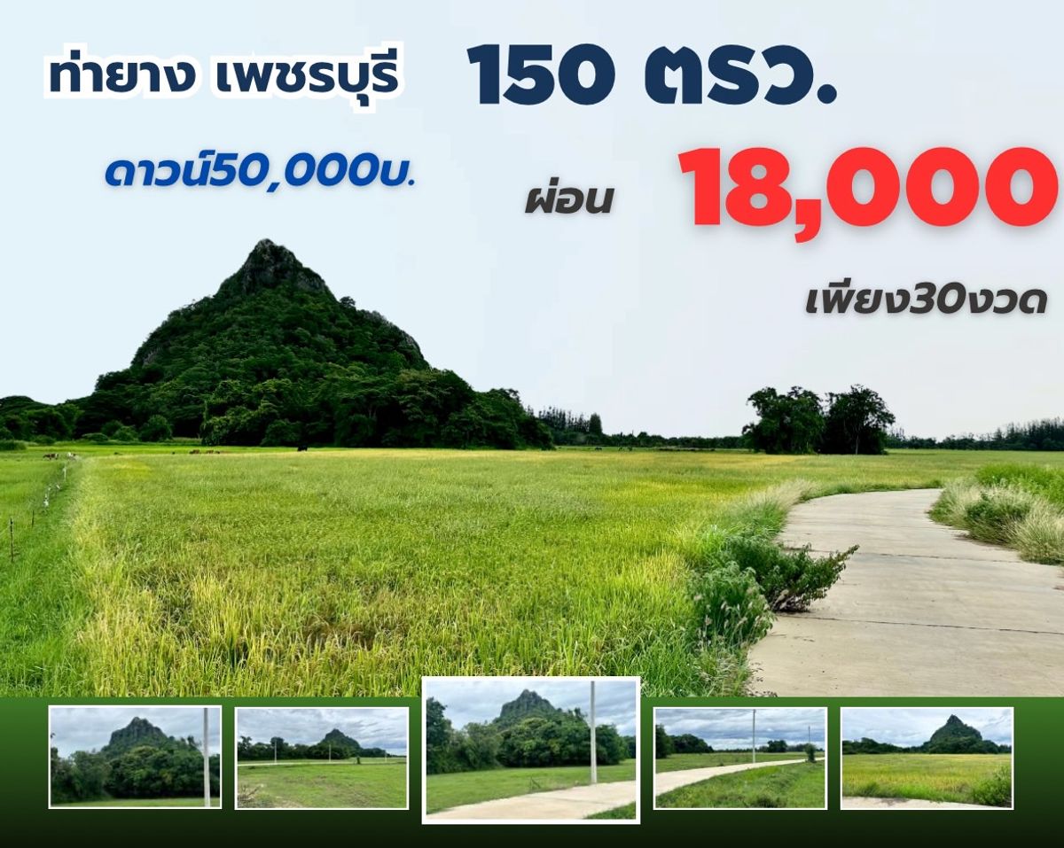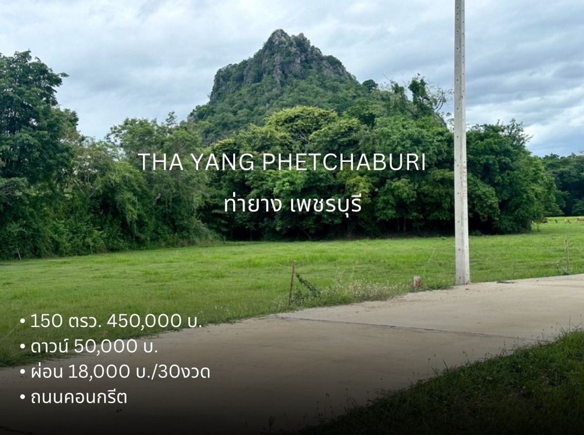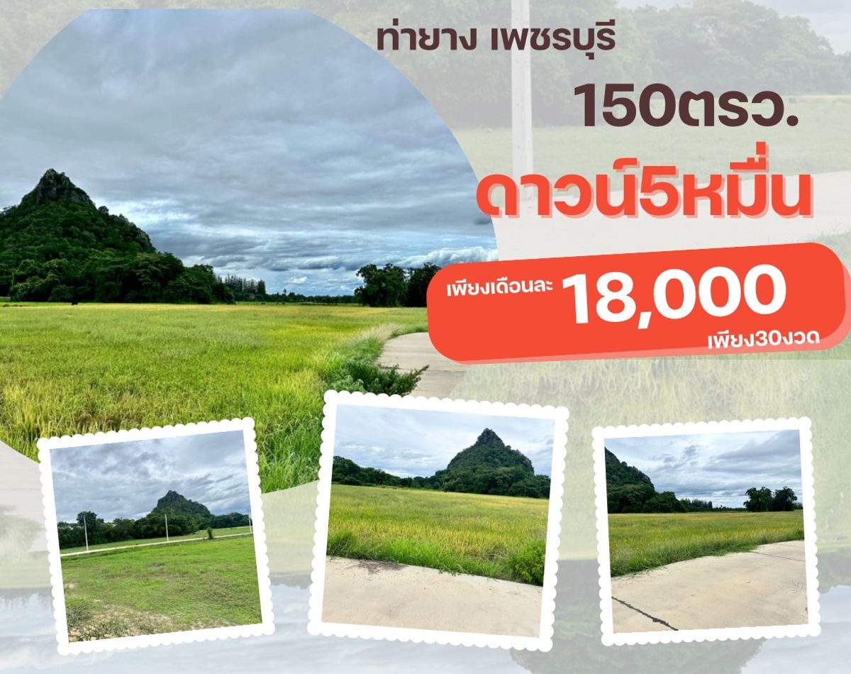 ที่ดิน ท่ายาง จ. เพชรบุรี ขนาด 150 ตรวา มีสองล๊อค สด 450,000 บาท ผ่อนดาวน์ 50000 บาท 18000x30 งวด วิวทุ่งนา ภูเขา ติดถนนคอนกรีตค่ะ ที่ดิน มีไฟฟ้า น้ำปะปาค่ะ ไปปั๊ม ปตท ท่ายาง เพียง 7 นาที ไปถนนเพชรเกษ