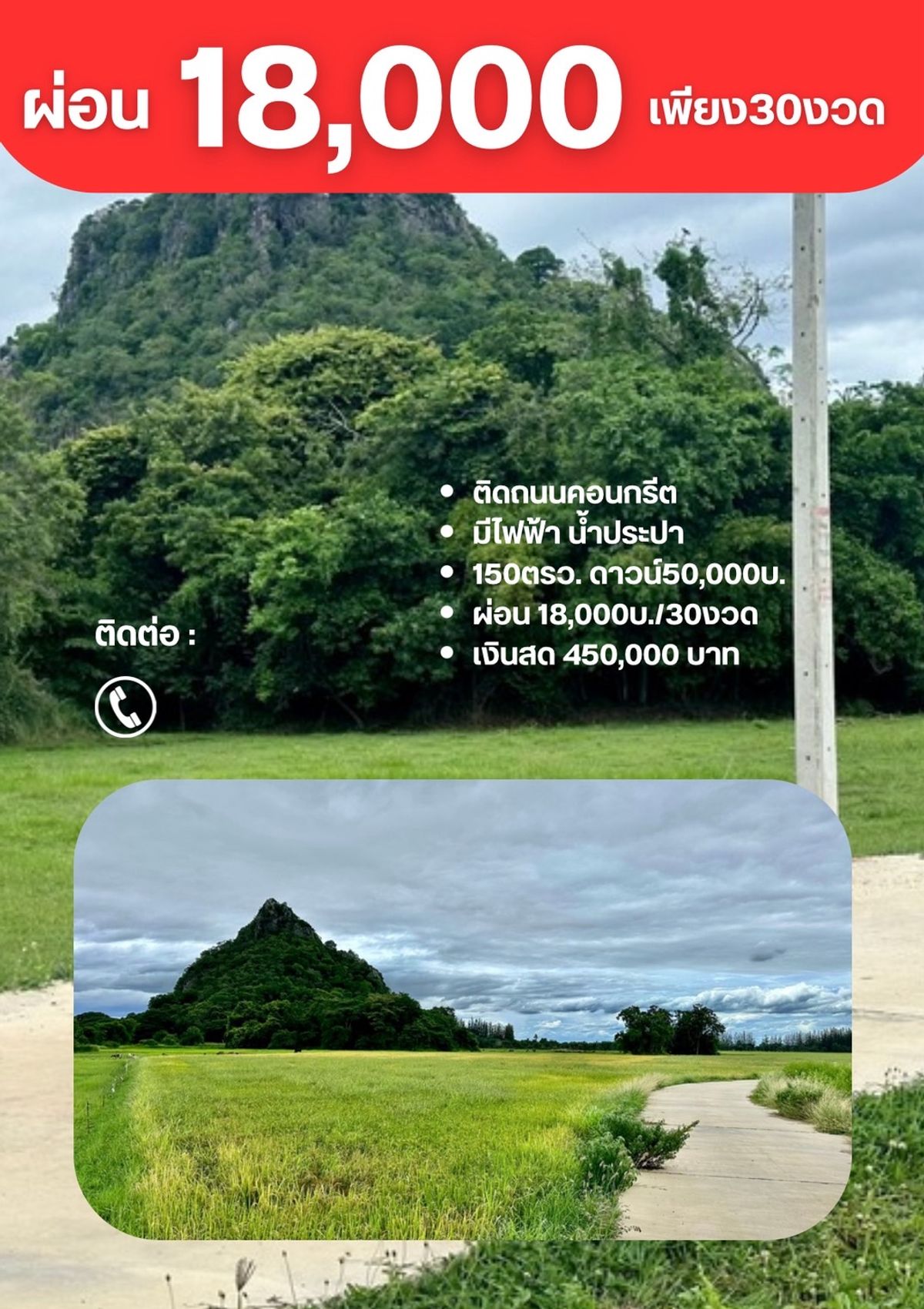 ที่ดิน ท่ายาง จ. เพชรบุรี ขนาด 150 ตรวา มีสองล๊อค สด 450,000 บาท ผ่อนดาวน์ 50000 บาท 18000x30 งวด วิวทุ่งนา ภูเขา ติดถนนคอนกรีตค่ะ ที่ดิน มีไฟฟ้า น้ำปะปาค่ะ ไปปั๊ม ปตท ท่ายาง เพียง 7 นาที ไปถนนเพชรเกษมเพียง 3 นาที ไปทะเล (หาดเพชร) เพียง 13 นาที สนใจติดต่อ คลิกเพื่อดูเบอร์โทรติดต่อ เหม่ย