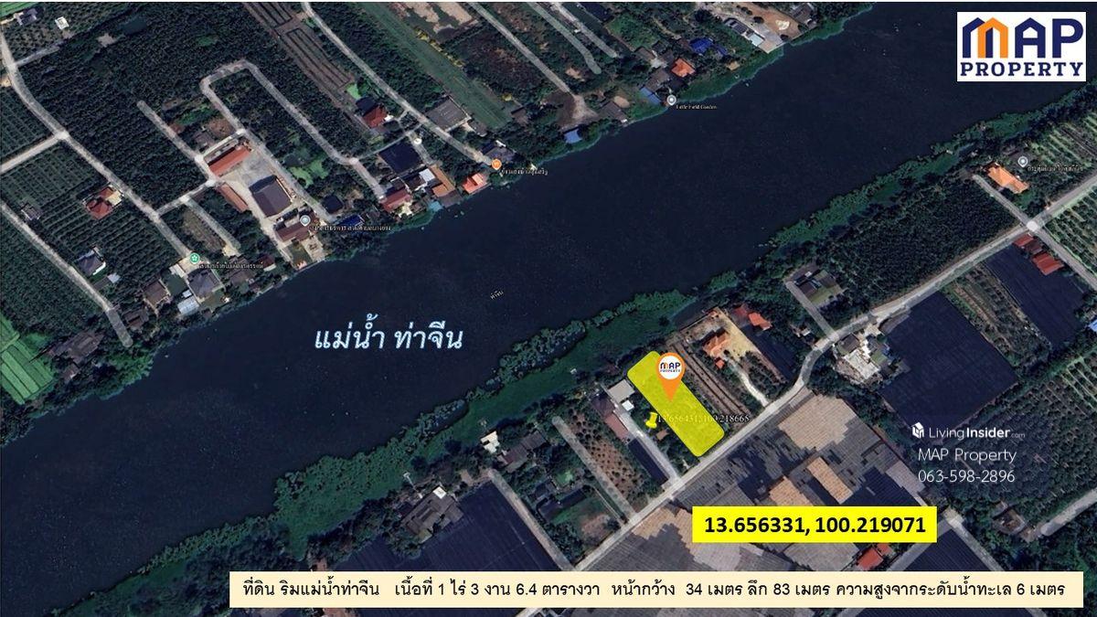 ที่ดินผังเมืองสีเขียว ติดริมแม่น้ำท่าจีน เนื้อที่ 1-3-6 ไร่ รูปแปลงสี่เหลี่ยมสวยมากขนาด 34 X 83 ม. -ด้านหน้าติดถนนคอนกรีต 6 ม. ด้านหลังติดแม่น้ำ 34 ม. มีที่งอกเล็กน้อย วิวกว้าง 180 องศา -บรรยากาศเงียบ
