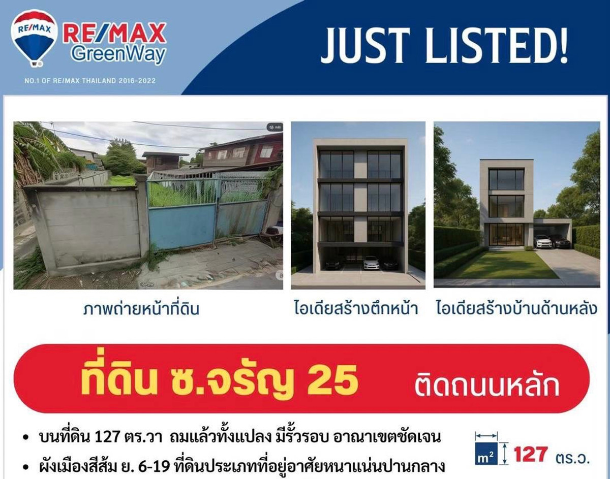 ขายที่ดิน ซอยจรัญสนิทวงศ์ 25 ติดถนนหลักในซอย เป็นทางสาธารณประโยชน์ ใกล้สถานีรถไฟฟ้า ที่ดินถมแล้ว ล้อมรั้วคอนกรีตทั้งแปลง พร้อมใช้งานทันที ขนาด 127 ตารางวา หน้ากว้าง 10 เมตร ลึก 55 เมตร ห่าง MRT จรัญฯ13 เพียง 1.7 กม. เข้า-ออกสะดวก เหมาะสร้างบ้าน, โฮมออฟฟิศ หรือสำนักงานขนาดเล็ก รหัส : 068010 ราคาปกติ : 9,525,000.00 รายละเอียดทั้งหมด : ประเภท : ที่ดินเปล่า ที่ตั้ง : ซอยจรัญสนิทวงศ์ 25 แขวงบางขุนศรี เขตบางกอกน้อย กรุงเทพมหานคร 10700 เนื้อที่ : 127 ตารางวา (หน้ากว้าง 10 เมตร x ลึก 55 เมตร ) ทิศหน้าทรัพย์ : เหนือ ทำเล : เพชรเกษม (ช่วงต้น) / ราชพฤกษ์ / จรัญสนิทวงศ์ ขายที่ดิน จรัญสนิทวงศ์ 25 ห่างจากถนนจรัญสนิทวงศ์ เพียง 700 เมตร ใกล้รถไฟฟ้าเพียง 1.7 กม. ผังเมืองสีส้ม เหมาะสร้างสำนักงานในฝัน พร้อมบ้านพักสวนส่วนตัว และ ที่จอดรถบนพื้นที่กว้างขวาง ราคาขายตารางวาละ 75,000 บาท ราคารวม 9,525,000 บาท A.ลักษณะที่ดิน ทางกายภาพ และ สภาพแวดล้อม - ที่ดินขนาด 127 ตารางวา ติดถนนเส้นหลักซอยจรัญสนิทวงศ 25 (ไม่เข้าซอยย่อย) - ติดถนนซอยจรัญสนิทวงศ์ 25 ห่างจากถนนจรัญสนิทวงศ์ เพียง 700 เมตร - รูปที่ดินเป็นสี่เหลี่ยมผืนผ้า หน้ากว้าง 10 เมตร ลึก 55 เมตร - ถมแล้วทั้งแปลง ล้อมรั้วคอนกรีตทั้ง 4 ด้าน อาณาเขตชัดเจน ไม่มีต้นไม้ใหญ่ที่ต้องจัดการ ทำให้ประหยัดทั้งเวลา และค่าดำเนินการเคลียร์ที่ดิน - ผังเมืองสีส้ม (ประเภท ย.5) เหมาะสำหรับสร้างที่อยู่อาศัย สำนักงาน หรือโครงการเชิงพาณิชย์ และ พักอาศัยเองได้ ประหยัดค่าใช้จ่ายระยะยาวในการเดินทางไปทำงาน - ด้านซ้ายติดซอยเล็กและบ้านเดี่ยวหลังใหญ่ ด้านขวาติดบ้านเดี่ยว 2 ชั้น ฝั่งตรงข้ามที่ดิน เป็นอาคารพาณิชย์ 3.5 ชั้น - ห่างจากสถานีรถไฟฟ้าจรัญฯ 13 (สายสีน้ำเงิน) เพียง 1.7 กม. B.โดดเด่นด้วยแนวคิดอสังหาริมทรัพย์รูปแบบใหม่ ออกแบบพื้นที่ให้ตอบโจทย์ชีวิตยุคใหม่ โดยผสาน "โชว์รูม – สำนักงาน – บ้านพักอาศัย" ไว้ในพื้นที่เดียว ออกแบบสไตล์โมเดิร์น โปร่งโล่ง ใช้งานได้จริง ไอเดียในสร้างสิ่งปลูกสร้างมีดังนี้ค่ะ - อาคารหน้า 3-4 ชั้น พื้นที่ใช้สอย ~420 ตร.ม. เหมาะทำออฟฟิศ โชว์รูม หรือธุรกิจส่วนตัว - หลังอาคารหน้า เป็นลานจอดรถกลางแปลง รองรับรถได้ 5 คัน พร้อมสวนพักผ่อนส่วนกลางกว่า 100 ตร.ม. - ด้านหลังเป็นบ้านเดี่ยว 3 ชั้น พื้นที่ใช้สอย ~300 ตร.ม. - มี 4 ห้องนอน 4 ห้องน้ำ พร้อมห้องครัวและพื้นที่ครอบครัวครบครัน - การแยกโซนใช้งานช่วยเพิ่มความเป็นส่วนตัว และจัดสรรฟังก์ชันได้ยืดหยุ่น ________________________________________ C. ทำเลศักยภาพ เหมาะสำหรับนักลงทุนและเจ้าของกิจการ - เข้า-ออกได้จากทั้งถนนจรัญสนิทวงศ์ และถนนพรานนก - ใกล้โรงพยาบาลศิริราช, ตลาดพรานนก, เซ็นทรั