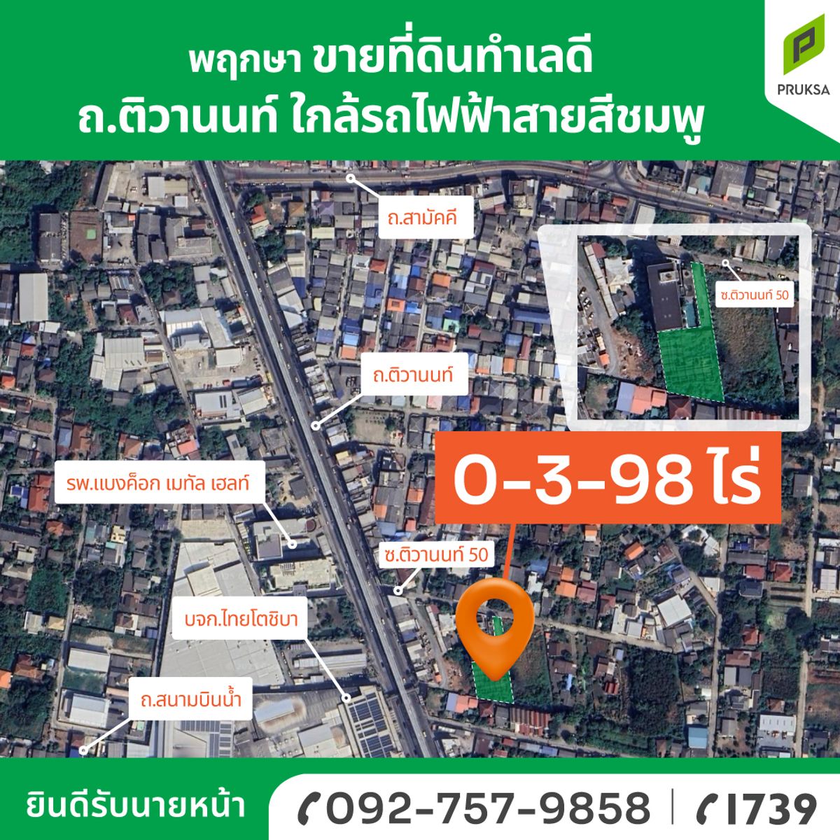 ที่ดินทำเลดี ในซอยติวานนท์ 50 ยินดีรับนายหน้า สนใจทักแชทมาสอบถามได้ค่ะ ซอยติวานนท์ 50 (รหัสทรัพย์ A04) เนื้อที่ 0-3-98.1 ไร่ หน้ากว้างที่ดินติดซอย 7 เมตร ผังเมืองรวม นนทบุรี สีน้ำตาล ย.7-6 ใกล้เซ็นทรั