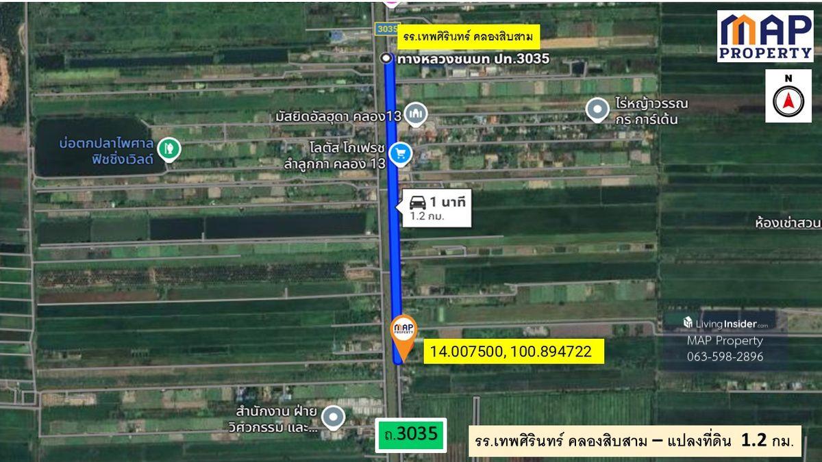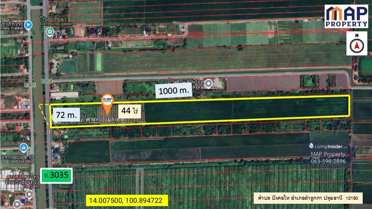 ที่ดินสวนเกษตรผสมผสาน เนื้อที่ 44 ไร่ -ติดถนนคลอง 13(3035) ต.พืชอุดม อ.ลำลูกกา จ.ปทุมธานี -หน้ากว้างติดถนน 72 เมตร ยาว 1000 เมตร -ถมแล้วบางส่วน แบ่งพื้นที่เป็น: -สวนไม้ประดับ -แปลงผักยกร่อง -พื้นที่นา