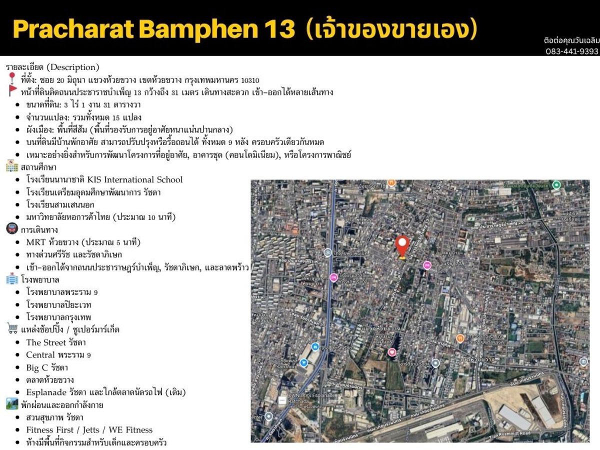 🎉ขายที่ดินติดวงแหวนกาญจนาภิเษก กรุงเทพกีฑา🎉 📌ที่ตั้ง : ซอย 20 มิถุนา แขวงห้วยขวาง เขตห้วยขวาง กรุงเทพมหานคร 10310 📌พิกัด : 13.778575, 100.580026 📌Gm : https://maps.app.goo.gl/7gC5Sh2YxkeZW2uT6 รายละเอียด (Description) 📍 ที่ตั้ง: ซอย 20 มิถุนา แขวงห้วยขวาง เขตห้วยขวาง กรุงเทพมหานคร 10310 🚩 หน้าที่ดินติดถนนประชาราชบำเพ็ญ 13 กว้างถึง 31 เมตร เดินทางสะดวก เข้า-ออกได้หลายเส้นทาง ♦️ ขนาดที่ดิน: 3 ไร่ 1 งาน 31 ตารางวา ♦️ จำนวนแปลง: รวมทั้งหมด 19 แปลง ♦️ ผังเมือง: พื้นที่สีส้ม (พื้นที่รองรับการอยู่อาศัยหนาแน่นปานกลาง) ♦️ บนที่ดินมีบ้านพักอาศัย สามารถปรับปรุงหรือรื้อถอนได้ ทั้งหมด 9 หลัง ครอบครัวเดียวกันหมด ♦️ เหมาะอย่างยิ่งสำหรับการพัฒนาโครงการที่อยู่อาศัย, อาคารชุด (คอนโดมิเนียม), หรือโครงการพาณิชย์ 🏫 สถานศึกษา ♦️ โรงเรียนนานาชาติ KIS International School ♦️ โรงเรียนเตรียมอุดมศึกษาพัฒนาการ รัชดา ♦️ โรงเรียนสามเสนนอก ♦️ มหาวิทยาลัยหอการค้าไทย (ประมาณ 10 นาที) 🚇 การเดินทาง ♦️ MRT ห้วยขวาง (ประมาณ 5 นาที) ♦️ ทางด่วนศรีรัช และรัชดาภิเษก ♦️ เข้า-ออกได้จากถนนประชาราษฎร์บำเพ็ญ, รัชดาภิเษก, และลาดพร้าว 🏥 โรงพยาบาล ♦️ โรงพยาบาลพระราม 9 ♦️ โรงพยาบาลปิยะเวท ♦️ โรงพยาบาลกรุงเทพ 🛒 แหล่งช้อปปิ้ง / ซูเปอร์มาร์เก็ต ♦️ The Street รัชดา ♦️ Central พระราม 9 ♦️ Big C รัชดา ♦️ ตลาดห้วยขวาง ♦️ Esplanade รัชดา และใกล้ตลาดนัดรถไฟ (เดิม) 🏞️ พักผ่อนและออกกำลังกาย ♦️ สวนสุขภาพ รัชดา ♦️ Fitness First / Jetts / WE Fitness ♦️ ห้างมีพื้นที่กิจกรรมสำหรับเด็กและครอบครัว (ขาย 458,850,000 บาท หรือ ตาราวาละ 350,000 บาท) ================================= คุณวันเฉลิม ศิริธรรมานุกุล Tel : คลิกเพื่อดูเบอร์โทรติดต่อ line ID : Duke_04