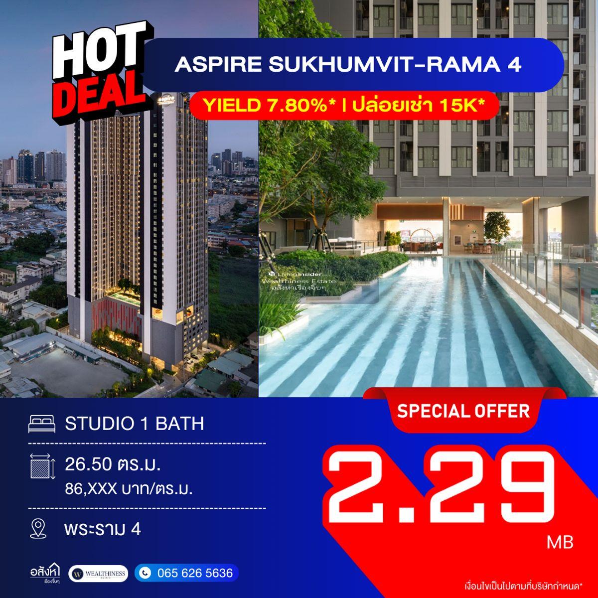 ✨ 𝙃𝙤𝙩 𝘿𝙚𝙖𝙡! 𝘼𝙨𝙥𝙞𝙧𝙚 𝙎𝙪𝙠𝙝𝙪𝙢𝙫𝙞𝙩‑𝙍𝙖𝙢𝙖 𝟰 𝙎𝙩𝙪𝙙𝙞𝙤 𝟮𝟲  𝙎𝙦.𝙢. 𝙋𝙤𝙤𝙡 𝙫𝙞𝙚𝙬 𝙋𝙧𝙞𝙘𝙚 𝟮.𝟮𝟵𝟱 𝙈𝙗. รายละเอียด โครงการ Aspire Sukhumvit‑Rama 4 ห้องสตูดิโอ ขนาด 26.50  ตร.ม. พร้อมวิวสระว่ายน้ำ ปล่อยเช่าได้ประมาณ 15,000 ฿/เ