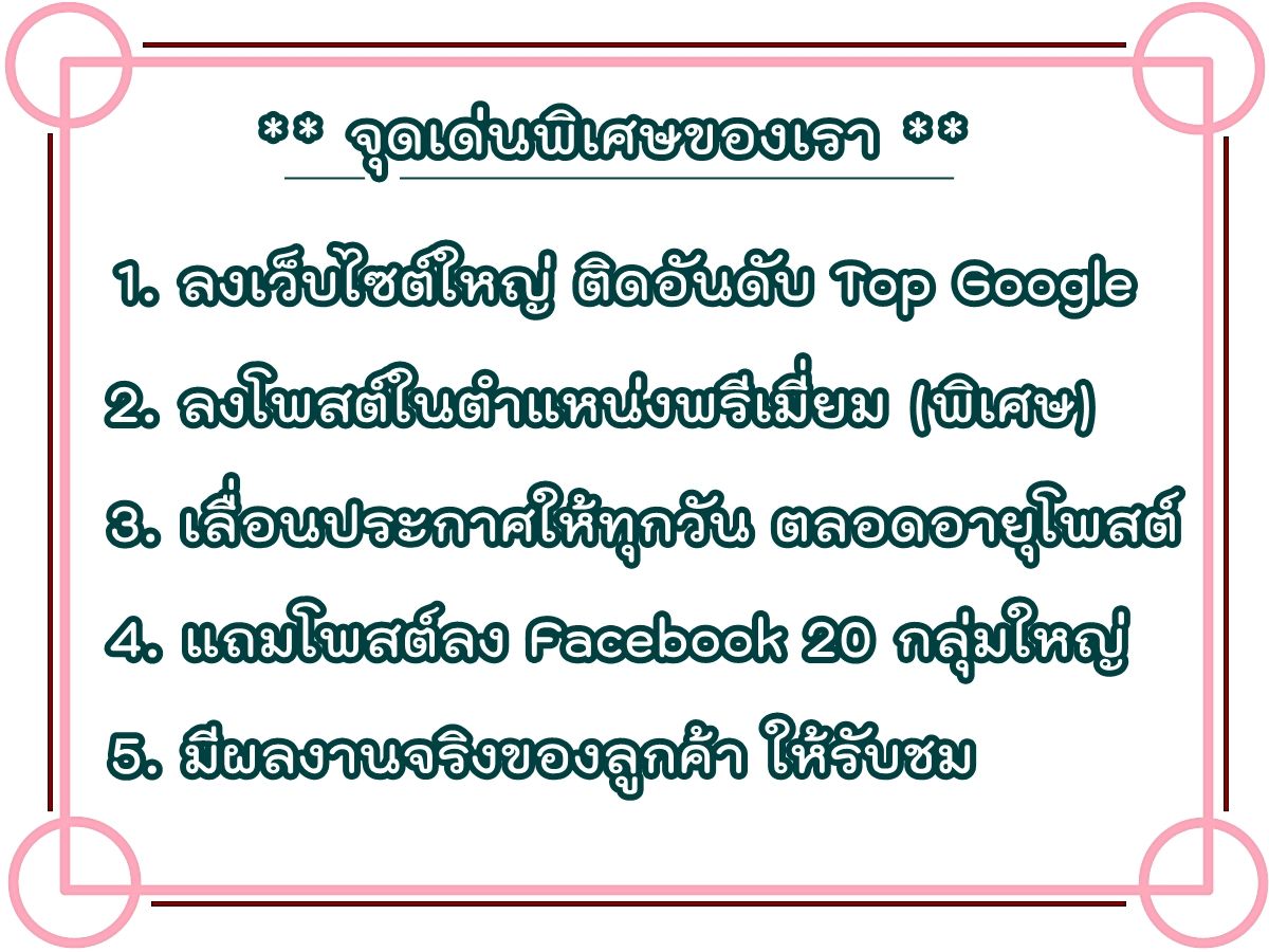 บริการงานโพสต์อสังหาริมทรัพย์ ขาย-ให้เช่า-เซ้ง ทรัพย์ทุกประเภท ผ่านเว็บไซต์ชั้นนำ ติดอันดับ Top Google สูงที่สุด ลง Facebook 20 กลุ่มใหญ่ ตรงกลุ่มเป้าหมายได้เต็ม 100% . Website : http://www.yongservice.com . ********************************* . ** ลงโพสต์รวม 15 เว็บไซต์ ติดอันดับ Top Google สูงที่สุด ** . --- โปรโมชั่นที่ 1 เว็บไซต์ DD Property --- . --- โปรโมชั่นที่ 2 เว็บไซต์ LivingInsider --- . --- โปรโมชั่นที่ 3 เว็บไซต์ Property Hub --- . --- โปรโมชั่นที่ 4 เว็บไซต์ Baan Finder --- . --- โปรโมชั่นที่ 5 เว็บไซต์ Terra BKK --- . --- โปรโมชั่นที่ 6 เว็บไซต์ Baania --- . --- โปรโมชั่นที่ 7 เว็บไซต์ FazWaz --- . --- โปรโมชั่นที่ 8 เว็บไซต์ Thai Home Town --- . --- และอีก 7 เว็บไซต์ ชั้นนำ มียอดเข้าชมสูงที่สุด --- . --- แถมพิเศษ!! ลง Facebook อีก 20 กลุ่มใหญ่ --- . ********************************* . ** ลูกค้าใหม่ (ใช้บริการครั้งแรก) ค่าบริการ 1,000 บาท / เดือน / 1 ทรัพย์ . ** ลูกค้าเก่า และ ลูกค้าที่แนะนำมา รับสิทธิ์พิเศษ เริ่มต้นที่ 45 วัน . ** (ต่ออายุ) ประกาศเดิม ที่ลงอยู่ โปรพิเศษ 2 เดือนเต็ม . ********************************* . ** ขั้นตอนให้บริการ ** 1. ลูกค้า ส่งข้อมูลทรัพย์ + รูปภาพ 10-12 รูป 2. หลังรับข้อมูล แจ้งคิวงาน วันเริ่มทำโพสต์ 3. วันที่เริ่มงาน แจ้งการชำระค่าบริการ 4. หลังรับโอน เริ่มทำโพสต์ตัวอย่าง (เพื่อตรวจ จนสมบูรณ์ 100%) 5. หลัง (คอนเฟิร์ม) โพสต์แล้ว (โพสต์ลง 15 เว็บไซต์ ให้ทันที) 6. หลังเสร็จงาน ส่งลิ้งค์เข้าเมล์ ให้ตรวจสอบ 7. เลื่อนประกาศทุกวัน ตลอดอายุโพสต์ . ********************************* . ** จุดเด่นพิเศษของเรา ** 1. เว็บไซต์ที่ลงโพสต์ คือเว็บใหญ่ ติดอันดับเว็บ Top Google 2. มียอดเข้าดูสูงที่สุด ตรงกลุ่มเป้าหมาย เต็ม 100% 3. แถม!! โพสต์ลงกลุ่ม Facebook อีก 20 กลุ่มใหญ่ 4. เลื่อนประกาศให้อยู่หน้าแรกทุกวัน ตลอดอายุโพสต์ 5. ทำงานทุกขั้นตอนด้วยมือ ไม่ใช้โปรแกรมโพสต์ 6. เราเป็นเจ้าเดียว ที่ลงโพสต์ในเว็บไซต์ใหญ่ ให้จริง 7. รับประกันผลงาน กว่า 12 ปี ปิดงานขายเช่า ได้รวดเร็ว . ********************************* . บริการโพสต์อสังหา by Yongservice Call : คลิกเพื่อดูเบอร์โทรติดต่อ Line : yongservice Line : @yongservice . Website : http://www.yongservice.com