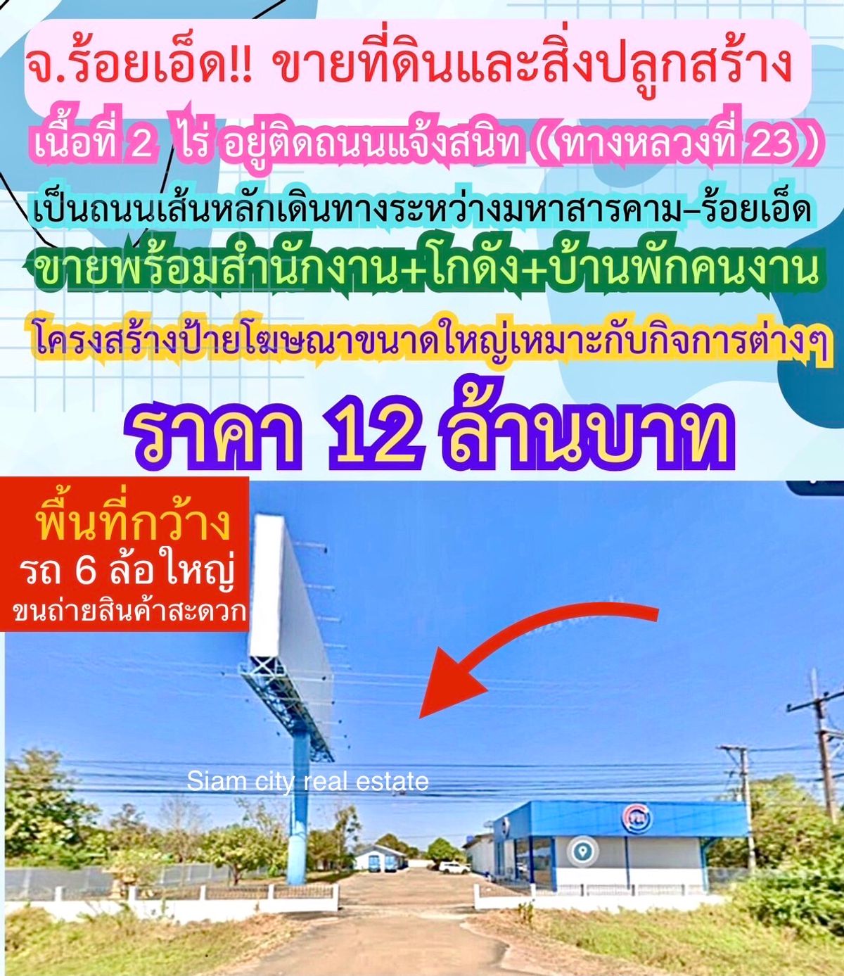 ขายที่ดิน พร้อมสิ่งปลูกสร้าง เป็นสำนักงาน และโกดังสินค้า พร้อมบ้านพักพนักงาน 🌈 พร้อมทำกิจการต่อได้ทันที ระบบ น้ำ ไฟ พร้อม 🚩 บนทำเลดี ติดถนน แจ้งสนิท ( ทางหลวง 23 ) ต.สีแก้ว อ.เมือง จ.ร้อยเอ็ด 🚩 บนเนื้อที่ 2 ไร่ 🚩 ขนาดอาคาร 12 x 45 เมตร 🚩 พื้นที่อาคาร 540 ตร.ม. 🚩 โครงเสาเหล็กของป้ายสูง 25 เมตร 🚩 ขนาดป้าย 11.5 x 20 เมตร 👉 ในราคา 12 ล้านบาท 🍧 เหมาะสำหรับ ♻️ ทำเป็นสำนักงาน / บริษัท ♻️ โกดัง คลังสินค้า / ศูนย์กระจายสินค้า ♻️ โชว์รูม ♻️ ปั๊มน้ำมัน ♻️ ซื้อไว้ลงทุน ☎️ สนใจติดต่อ คุณสุธาทิพย์ โทร/ไลน์ คลิกเพื่อดูเบอร์โทรติดต่อ