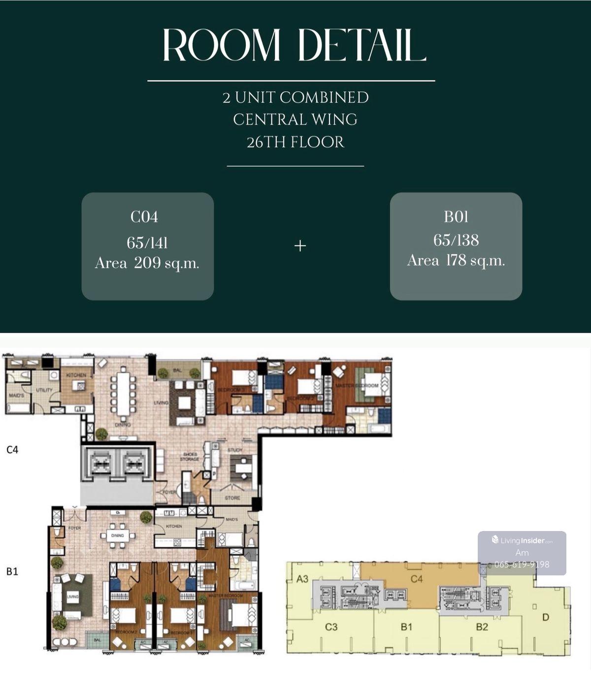 Athenee Residence Combine units Sell/Rent: 387.57sqm (Combine Unit C4 209.43sqm + Unit B1 178.14sqm.) 2X Fl Panoramic Wireless and Sukhumvit Road view - 6bed 6bath 1 powder room - 2 Spacious Living Ro