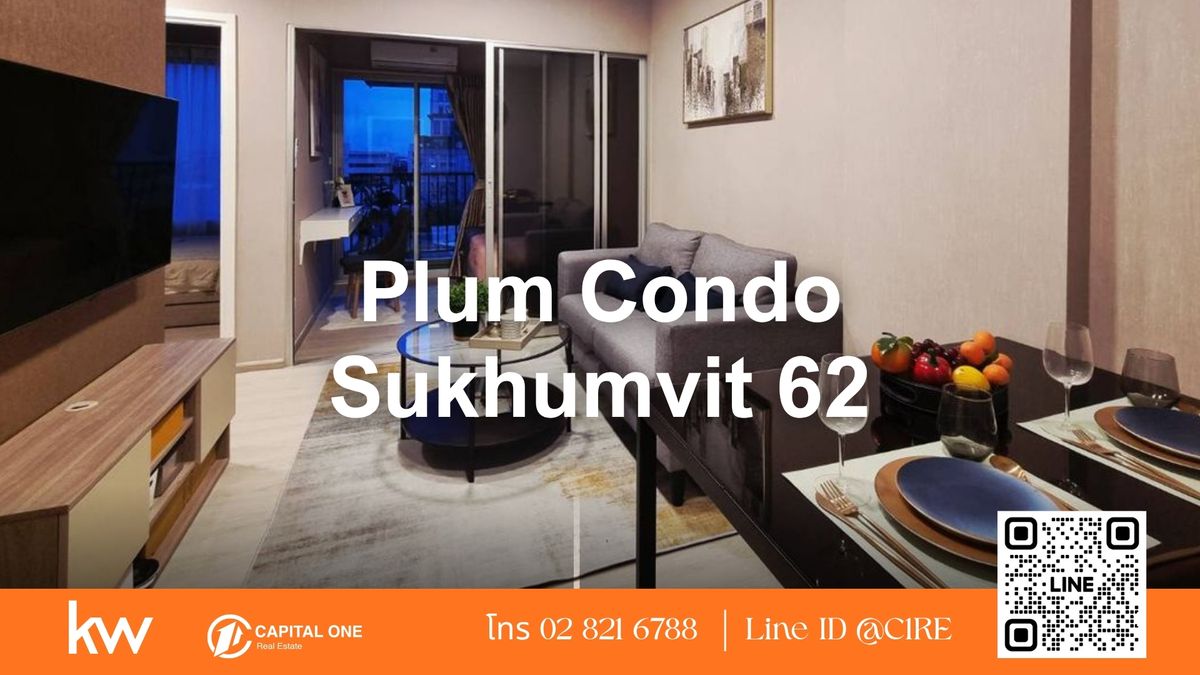 คอนโด: พลัมคอนโด สุขุมวิท 62 (Plum Condo Sukhumvit 62) – ห้องใหม่ มือหนึ่ง ไม่เคยปล่อยเช่า – ขนาดห้อง 36 ตร.ม. | 2 ห้องนอน | 1 ห้องน้ำ | 1 ห้องครัว – ชั้น 8 วิวโล่ง ทิศตะวันออก ไม่โดนตึกบัง ลมเข้าเย็นสบาย – เฟอร์นิเจอร์ครบ พร้อมเครื่องใช้ไฟฟ้าครบชุด (แอร์, ทีวี, ตู้เย็น, ไมโครเวฟ, เครื่องซักผ้า, เครื่องทำน้ำอุ่น) – เดินออกจากห้องถึงส่วนกลางได้โดยตรง สะดวกมาก สิ่งอำนวยความสะดวกในโครงการ – ฟิตเนส – สระว่ายน้ำ – Co-working space – ห้องประชุม – ห้องสมุด – ระบบรักษาความปลอดภัย 24 ชม. การเดินทางและสถานที่ใกล้เคียง – เดินเพียง 5 นาที (ประมาณ 400 ม.) ถึง BTS บางจาก – ใกล้จุดขึ้นลงทางด่วนสุขุมวิท 62 เดินทางเข้าเมืองง่าย – 5 นาทีถึง Tesco Lotus อ่อนนุช – 8 นาทีถึง Century The Movie Plaza สุขุมวิท – 10 นาทีถึง Gateway เอกมัย – ใกล้โรงเรียนนานาชาติ Anglo Singapore และ Bangkok Prep – รายล้อมด้วยร้านอาหาร คาเฟ่ และ 7-Eleven ภายในซอย ค่าเช่า: – 20,000 บาท/เดือน – สัญญาขั้นต่ำ 1 ปี – มัดจำ 2 เดือน + ล่วงหน้า 1 เดือน – สนใจนัดชม หรือสอบถามข้อมูลเพิ่มเติม – Line ID: @c1property – โทร: คลิกเพื่อดูเบอร์โทรติดต่อ