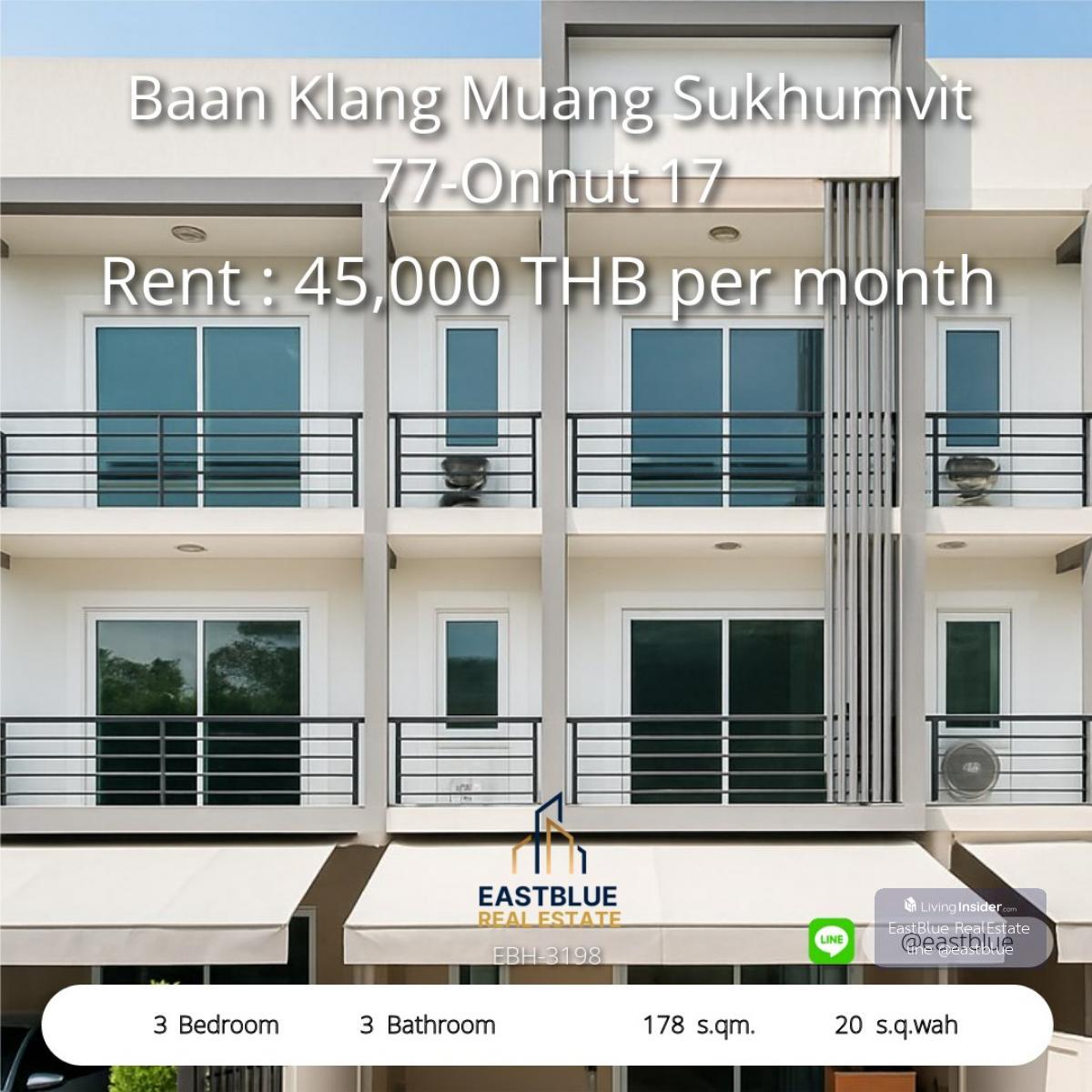 Project : Baan Klang Muang Sukhumvit 77-Onnut 17 ID : EBH-3198 3 Bed 3 Baht House Area :178 sqm Land Area :20 sq.wah Rental Price : 45,000 THB per month Selling Price : THB . ิติดต่อ Contact, Appointment for viewing. call: คลิกเพื่อดูเบอร์โทรติดต่อ WhatsApp: คลิกเพื่อดูเบอร์โทรติดต่อ - Eastblue เราคือทีมตัวแทนอสังหาริมทรัพย์มืออาชีพ ที่ได้รับความไว้วางใจด้วยยอดขายรวมมูลค่าหลายพันล้านบาท พร้อมทีมที่ปรึกษาผู้เชี่ยวชาญด้านการซื้อ ขาย และการลงทุนในอสังหาริมทรัพย์ . ดูทรัพย์อื่นๆมากกว่า 50,000 รายการ ,explore over 50,000 listings on our website: https://www.eastblueth.com ❗️❗️not accept co-agent❗️❗️ . Baan Klang Muang Sukhumvit 77-Onnut 17 • 3 ห้องนอน 3 ห้องน้ำ 3 ชั้น ที่จอดรถ 3 คัน (2 ในบ้าน 1 หน้าบ้าน) • พื้นที่ใช้สอย 178 ตรม. ที่ดิน 20 ตร.ว. • บ้านพร้อมอยู่ เฟอร์นิเจอร์บิ้วอินครบทุกห้อง • แอร์ทุกห้อง, TV ทุกห้อง, เครื่องทำน้ำอุ่น 2 เครื่อง • เครื่องใช้ไฟฟ้าครบ ตู้เย็น, เตาไมโครเวฟ, เตาแก๊ส, เครื่องดูดอากาศ, เครื่องซักผ้า • มีห้องอเนกประสงค์, ห้องนั่งเล่น, ห้องทานข้าว, ห้องครัว และห้องเก็บของใต้บันได จุดเด่นโครงการและสิ่งอำนวยความสะดวก • ระบบรักษาความปลอดภัยตลอด 24 ชั่วโมง • สวนส่วนกลางและพื้นที่สีเขียวรอบหมู่บ้าน • คลับเฮาส์และฟิตเนสสำหรับสมาชิก สถานที่ใกล้เคียง • BTS อ่อนนุช 1.9 กม. • โรงพยาบาลสุขุมวิท 2.7 กม. • โรงเรียนนานาชาติ Wells 4.5 กม. • ศูนย์การค้าพาราไดซ์ พาร์ค 3.1 กม. • เมกะบางนา 14 กม. ราคาเช่า 45,000 บาท/เดือน (ไม่รับสัตว์เลี้ยง) เหมาะสำหรับผู้พักอาศัย ทำออฟฟิศ และสามารถจดทะเบียนบริษัทได้ #บ้านให้เช่า #BaanKlangMuang #สุขุมวิท77 #อ่อนนุช #ทาวน์โฮมให้เช่า