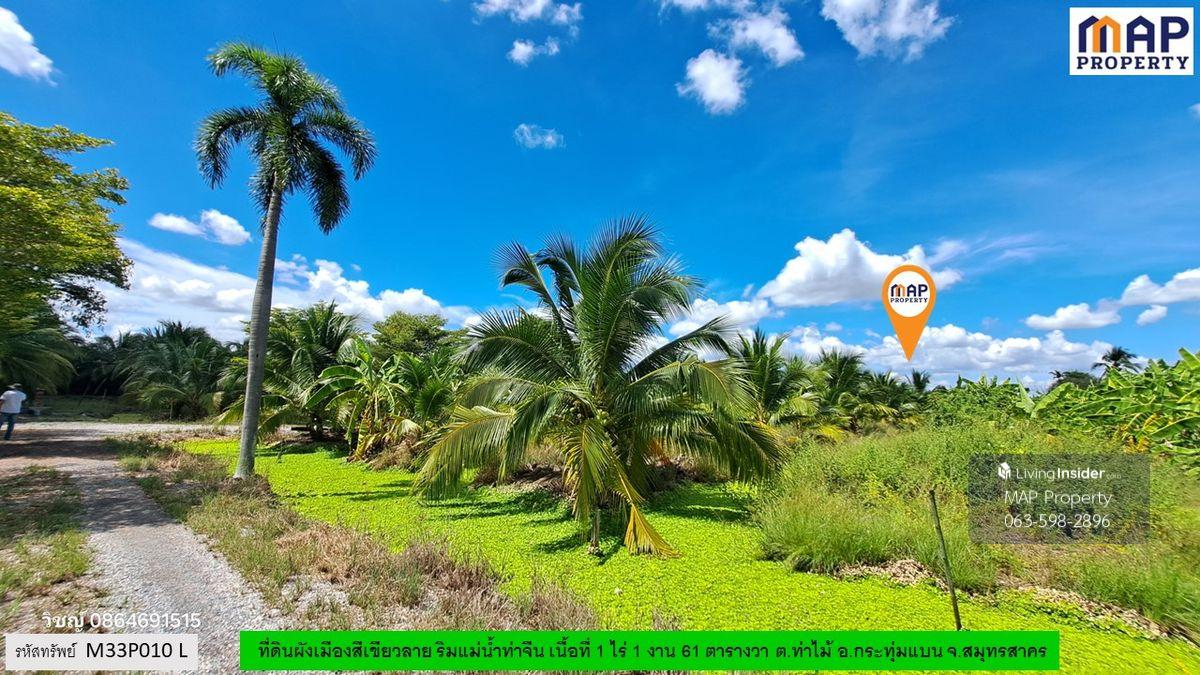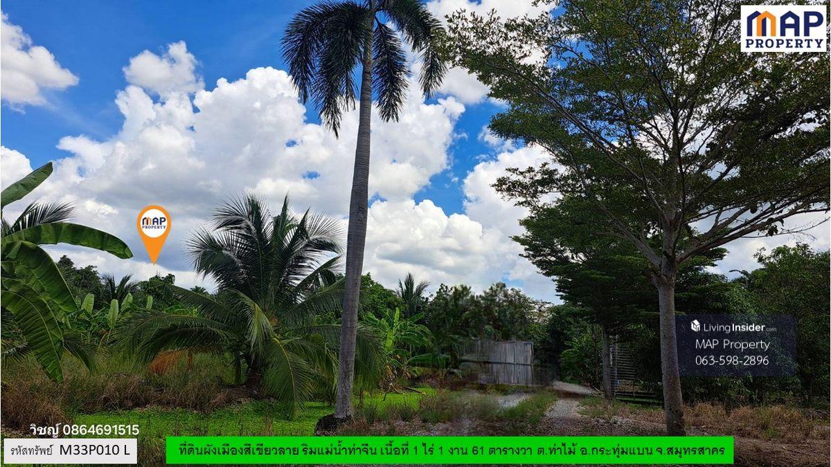 ที่ดินผังเมืองสีเขียวลาย ริมแม่น้ำท่าจีน ต.ท่าไม้ อ.กระทุ่มแบน จ.สมุทรสาคร -เนื้อที่ 1-1-61 ไร่ ติดแม่น้ำท่าจีนกว้าง 28 ม. มีที่งอกริมแม่น้ำ ด้านหลังติดถนนยาว 24 ม. บรรยากาศธรรมชาติเงียบสงบ เหมาะสำหรั