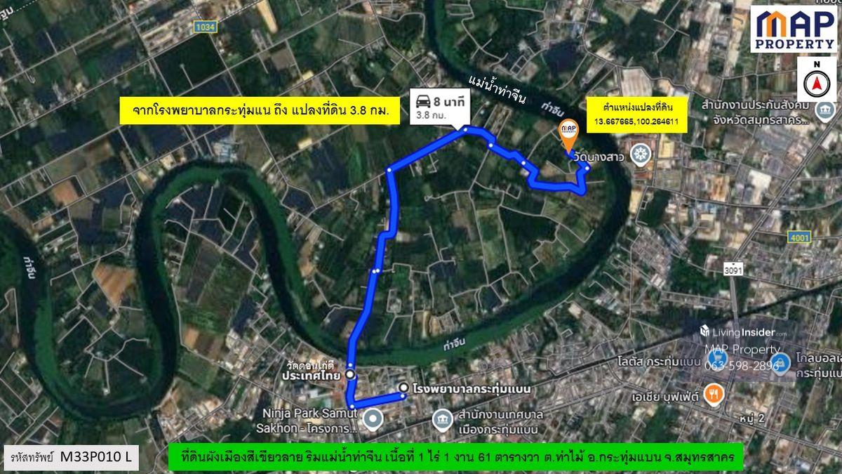 ที่ดินผังเมืองสีเขียวลาย ริมแม่น้ำท่าจีน ต.ท่าไม้ อ.กระทุ่มแบน จ.สมุทรสาคร -เนื้อที่ 1-1-61 ไร่ ติดแม่น้ำท่าจีนกว้าง 28 ม. มีที่งอกริมแม่น้ำ ด้านหลังติดถนนยาว 24 ม. บรรยากาศธรรมชาติเงียบสงบ เหมาะสำหรับ: ทำบ้านอยู่อาศัย ใกล้ตลาดและหน่วยงานราชการ เดินทางสะดวกมาก: -จากโรงพยาบาลกระทุ่มแบน 3.8 กม. -ไปตลาดกระทุ่มแบน 5.2 กม. ราคาไร่ละ 7 ล้านบาท รวมค่าใช้จ่ายในการโอน ติดต่อ วิชญ์ 086.469.1515
