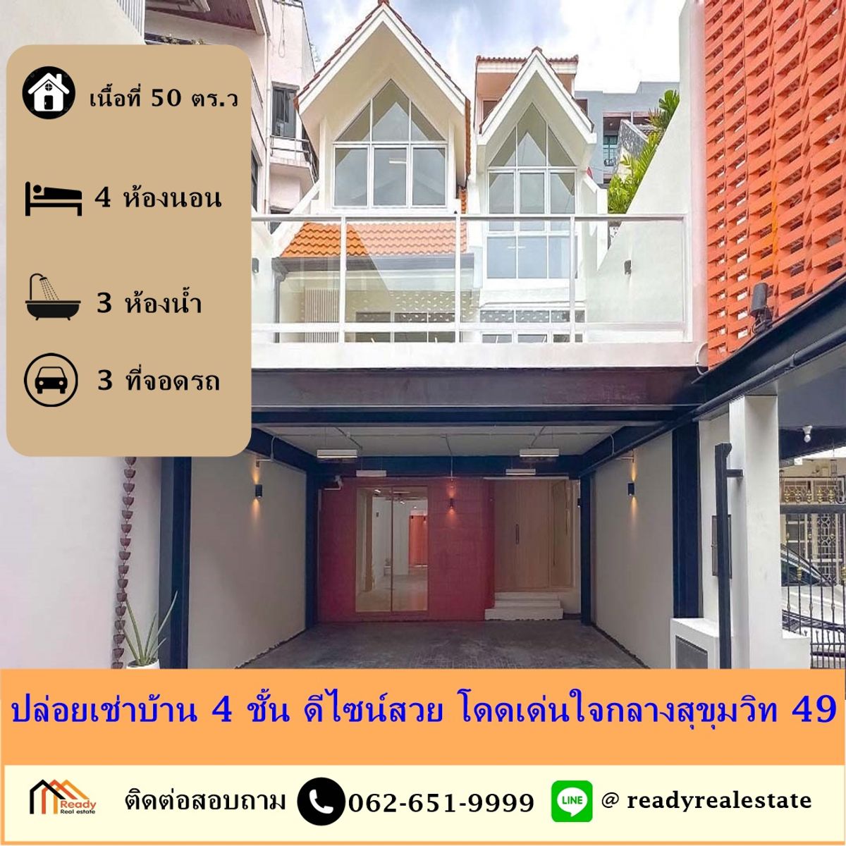 ให้เช่าบ้าน 4 ชั้น ดีไซน์สวย โดดเด่นใจกลางสุขุมวิท 49 | เดินถึง BTS ทองหล่อ | เหมาะทั้งทำธุรกิจและอยู่อาศัย บ้านเดี่ยว 4 ชั้น รีโนเวทใหม่ เนื้อที่ 50 ตารางวา พื้นที่ใช้สอย 500 ตารางเมตร 4 ห้องนอน 3 ห้องน้ำ 3 ที่จอดรถ **การตกแต่ง** >ชั้น 1–2 เหมาะสำหรับทำออฟฟิศ คลินิก สตูดิโอ หรือธุรกิจหลากรูปแบบ >ชั้น 3–4 เป็นโซนพักอาศัยส่วนตัว เงียบสงบ >ประตู Smart Access รองรับลายนิ้วมือ, รหัส, Keycard >รั้วไฟฟ้า นำเข้าจากสเปน แข็งแรง ปลอดภัย >ครัวบิ้วอินดีไซน์โมเดิร์น พร้อมเครื่องใช้ไฟฟ้าคุณภาพเยี่ยม >แอร์ Carrier 6 เครื่อง เย็นทั่วถึงทั้งหลัง >จอดรถในบ้านได้ 3 คัน มี EV Charger พร้อมใช้งาน >จอดรถเพิ่มเติมด้านนอกซอยได้สะดวก ราคาให้เช่าเดือนละ 180,000,000บาท ที่ตั้ง: ซอยสุขุมวิท 49 แขวงคลองตันเหนือ เขตวัฒนา กรุงเทพมหานคร 10110 พิกัด : https://maps.app.goo.gl/uiKrzKFy3X758AEs8 จุดเด่น >บ้านเดี่ยวรีโนเวทใหม่ ดีไซน์โดดเด่นไม่ซ้ำใคร >ผนังอิฐแดงจัดวางอย่างมีศิลปะ ผสานกระจกใสบานใหญ่ โปร่ง โล่ง สว่าง >สร้างสรรค์โดยสถาปนิกสาย Chic & Chill ให้ความรู้สึกเรียบเท่ มีรสนิยม >บ้านหลังนี้เหมาะสำหรับเจ้าของธุรกิจที่ต้องการพื้นที่ทำงานและพักอาศัย >เดินเพียง 600–700 เมตรถึง BTS ทองหล่อ >รายล้อมด้วยแหล่งไลฟ์สไตล์ครบครัน อาทิเช่น คลินิกเสริมความงาม- สุขภาพ ,คาเฟ่,คอนโดหรู,โรงแรมบูติก สนใจสอบถามรายละเอียดเพิ่มเติม คุณออย เบอร์โทรศัพท์ คลิกเพื่อดูเบอร์โทรติดต่อ / คลิกเพื่อดูเบอร์โทรติดต่อ Line: @ readyrealestate