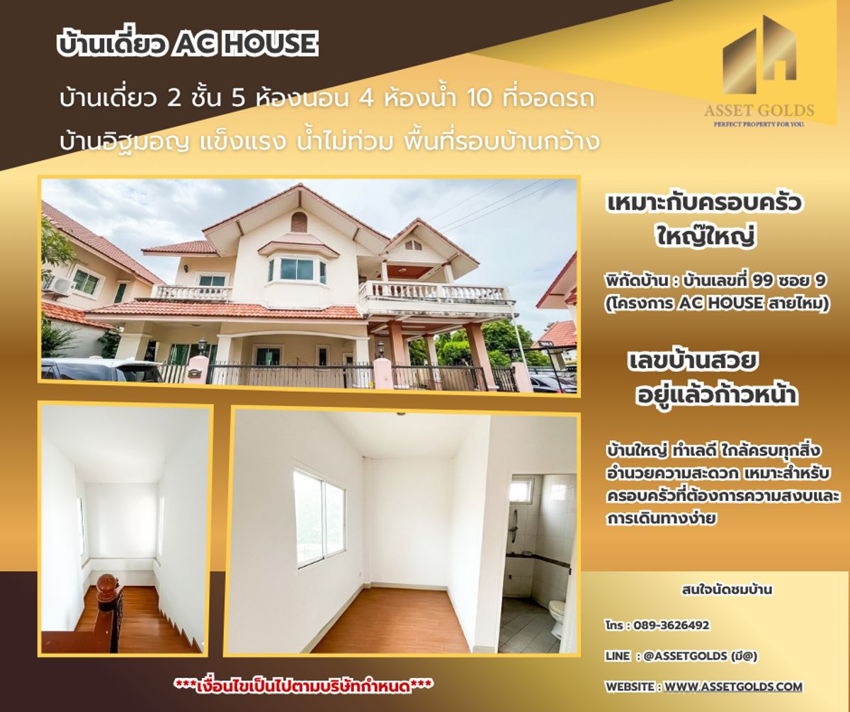 ขายด่วน ‼️ โปรโมชั่นพิเศษ 💒 บ้านเดี่ยว AC House สายไหม – หลังมุม 80 ตร.ว. 🚆 ใกล้ BTS สายสีเขียว เดินทางสะดวก ┏━━━━━━━━━━━┓ 💥 ราคาปกติ 5,890,000.- บาท 🔥 พิเศษ เหลือเพียง 5,490,000.- บาท 📅 ภายในวันที่ 31 ธันวาคม 2568 นี้ เท่านั้น 📑 ค่าโอนคนละครึ่ง ┗━━━━━━━━━━━┛ 👉 รายละเอียดบ้าน • บ้านเดี่ยว 2 ชั้น | 5 ห้องนอน | 4 ห้องน้ำ | 10 ที่จอดรถ • บ้านอิฐมอญ แข็งแรง 🧱 • บ้านหันหน้าทิศเหนือ ไม่มีเสาไฟฟ้าบังวิว • น้ำไม่ท่วม (พื้นที่เนิน + บ้านยกสูงจากถนน) • หลังบ้าน–ข้างบ้าน พื้นที่กว้าง ทำสวนได้ 🌳 🔒 ความปลอดภัย & ส่วนกลาง • รปภ. ดูแล 24 ชม. 👮♂️ • นิติแข็งแรง ดูแลโครงการดี • ค่าส่วนกลางเพียง 1,200 บาท/เดือน 📍 สถานที่สำคัญใกล้เคียง 🛍️ ตลาด / ห้าง • Foodland สายไหม → 800 ม. / 3 นาที • ตลาดเอ.ซี. สายไหม → 2 กม. / 5 นาที • ตลาดวงศกร → 3 กม. / 7 นาที • Big C สายไหม → 3.5 กม. / 8 นาที • Lotus’s Go Fresh สายไหม → 3.8 กม. / 8 นาที • ICON 56 Saimai (Community Mall) → 4 กม. / 10 นาที 🏥 โรงพยาบาล • รพ.สายไหม → 3 กม. / 7 นาที • รพ.CGH สายไหม → 4 กม. / 10 นาที • รพ.สินแพทย์ รามอินทรา → 10 กม. / 18 นาที • รพ.ภูมิพลอดุลยเดช → 12 กม. / 20 นาที 🏫 โรงเรียน • รร.สารสาสน์วิเทศสายไหม → 2 กม. / 5 นาที • รร.ฤทธิยะวรรณาลัย → 6 กม. / 12 นาที • รร.จ่าอากาศ → 7 กม. / 14 นาที 🚆 รถไฟฟ้า / ทางด่วน • BTS สะพานใหม่ → 7 กม. / 15 นาที • BTS คูคต → 9 กม. / 20 นาที • ทางด่วนรามอินทรา–อาจณรงค์ → 10 กม. / 15 นาที • ทางด่วนดอนเมืองโทลล์เวย์ → 12 กม. / 18 นาที 🎯 พิกัดบ้าน : บ้านเลขที่ 99 ซอย 9 (โครงการ AC House สายไหม) Google Maps : https://maps.app.goo.gl/RDXWMq77AMYLaBmV7?g_st=ipc 🍀 บ้านใหญ่ ทำเลดี สงบ เดินทางสะดวก ใกล้ครบทุกสิ่งอำนวยความสะดวกครบครัน 🍀 📞 สนใจนัดชมบ้าน โทร : คลิกเพื่อดูเบอร์โทรติดต่อ LINE 🆔 : @assetgolds (มี@) 🌐 Website : www.assetgolds.com เงื่อนไขเป็นไปตามบริษัทกำหนด