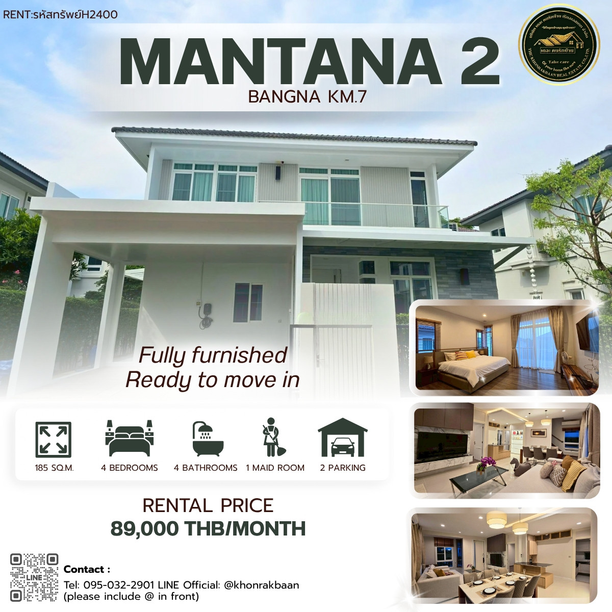 RENT: รหัสทรัพย์ H2400 ✨ ให้เช่า บ้านเดี่ยว มัณฑนา 2 บางนา กม.7 ใกล้เมกาบางนา ✨ 🏠 บ้าน 2 ชั้น เฟอร์นิเจอร์ครบ พร้อมเข้าอยู่ 💰 ค่าเช่า: 89,000 บาท/เดือน 🚗 จอดรถได้ 2 คัน + รองรับ EV Charger 📐 รายละเอียดบ้าน ที่ดิน 62 ตร.ว. พื้นที่ใช้สอย 185 ตร.ม. 4 ห้องนอน 🛏️ 4 ห้องน้ำ 🛁 1 ห้องแม่บ้าน 👩🍳 ส่วนกลางหมู่บ้าน คลับเฮ้าส์, ฟิตเนส, สระว่ายน้ำระบบเกลือ + สระเด็ก + จากุซซี่, ห้องเลานจ์, สวนส่วนกลาง, สนามเด็กเล่น, ระบบรักษาความปลอดภัย 24 ชม. + CCTV + ระบบ Magnetic ภายในบ้านทุกหลัง 📍 สถานที่ใกล้เคียง Mega Bangna, IKEA Bangna 🛍️ รร.นานาชาติ Concordian, SISB Suvarnabhumi, D-PREP, รร.ราชวินิตบางแก้ว 🎓 Top Golf, สนามกอล์ฟเมืองแก้ว ⛳ 💰 ค่าเช่า: 89,000 บาท/เดือน RENT: Property Code H2400 ✨ For Rent – Mantana 2 Bangna KM.7, near Mega Bangna ✨ 🏠 2-storey house, fully furnished, ready to move in 🚗 Parking for 2 cars + EV Charger point 📐 House Details Land area: 62 sq.wah Usable area: 185 sq.m. 4 Bedrooms 🛏️ 4 Bathrooms 🛁 1 Maid room 👩🍳 Clubhouse, Fitness, Saltwater Swimming Pool + Kids Pool + Jacuzzi, Lounge, Central Park, Playground, 24-hour Security + CCTV + Magnetic System in every house 📍 Nearby Places Mega Bangna, IKEA Bangna 🛍️ Concordian International School, SISB Suvarnabhumi, D-PREP, Ratwinit Bangkaeo 🎓 Top Golf, Muang Kaew Golf Course ⛳ 💰 Rent: 95K ---------------------------------------------------------- 🏢 The Khonrakbaan Real Estate Co., Ltd 📍บริการหลังการเช่าตลอดสัญญา | Full after-rent support throughout the lease ⚠️ ปล่อยเช่าราคาเจ้าของ | Rent at owner’s price ⚠️ 💁♀️ รับจัดหาออเดอร์ / รับฝากเช่า / ปล่อยเช่า | Property sourcing / consignment / leasing services 📅 นัดหมายล่วงหน้า 1 วัน | Appointment required 1 day in advance 👇 Contact BEE (Thai/Eng) 👇 📞 Tel: คลิกเพื่อดูเบอร์โทรติดต่อ 📱 WhatsApp: คลิกเพื่อดูเบอร์โทรติดต่อ 💬 LINE Official: @khonrakbaan (ใส่ @ ด้านหน้าด้วยนะคะ) ---------------------------------------------------------- 👇 ติดต่อ คุณพลอย 👇 📞 Tel: คลิกเพื่อดูเบอร์โทรติดต่อ , คลิกเพื่อดูเบอร์โทรติดต่อ 📱 Wechat: @thekhonrakbaan 💬 LINE Official: @thekhonrakbaan (ใส่ @ ด้านหน้าด้วยนะคะ) -------------------------------------------------
