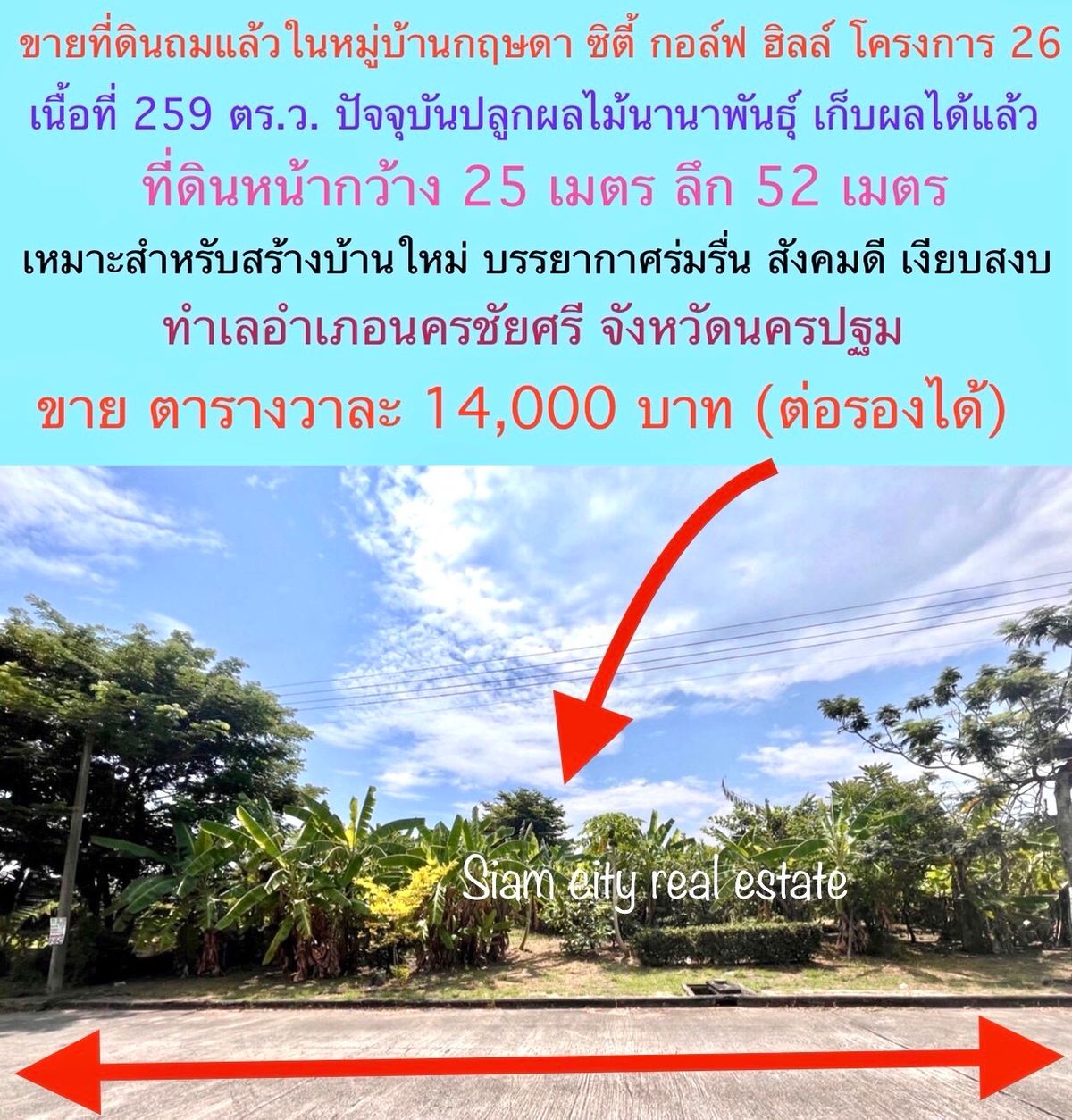 ขายที่ดิน ราคาถูกและดี ในโครงการหมู่บ้าน กฤษดานคร 26 ( ซิตี้ กอล์ฟ ฮิลล์ ) ต.บางกระเบา อ.นครชัยศรี จ.นครปฐม ⛳️ ทำเลดี ติดถนน บรมราชชนนี เดินทางสะดวก 🔮 ที่ดินรูปสี่เหลี่ยม หน้ากว้างที่ดิน 25 เมตร ลึก 52 เมตร โดยประมาณ 🔮 เนื้อที่ 259 ตร.ว. 👉 ขาย ตร.ว. ละ 14,000 บาท = 3,600,000 บาท ( สนใจจริง ต่อรองได้ ) 🚩 ขายที่ดินเปล่า ถมเรียบร้อยแล้ว สำหรับสร้างบ้านพักอาศัย 🚩 ที่ดินอยู่ต้นโครงการหมู่บ้าน บรรยากาศร่มรื่น และมีความปลอดภัย 🚩 เหมาะกับการสร้างบ้านพักอาศัย ได้ความเป็นส่วนตัวสูง สภาพแวดล้อมดี และเงียบสงบ 🚩 ที่ดินปลูกผลไม้นานาพันธุ์ไว้แล้ว เก็บผลผลิตได้เลย ✳️ สถานที่ใกล้เคียง 🏁 สนามกอล์ฟ กฤษดา ซิตี้ กอล์ฟ ฮิลล์ 🏁 โลตัสนครชัยศรี 🏁 พิพิธภัณฑ์หุ่นขี้ผึ้งไทย 🏁 เซ็นทรัลพลาซ่า ศาลายา 🏁 ไทวัสดุ 🏁 สำนักงานที่ดิน นครชัยศรี 🏁 มหาวิทยาลัยมหิดล 🏁 โรงพยาบาลศูนย์การแพทย์กาญจนาภิเษก 🏁 โรงพยาบาลนครชัยศรี ⭐️ การเดินทาง ✅ เข้า-ออกได้ 2 ทาง ถนนบรมราชชนนี และถนน เพชรเกษม ☎️ สนใจติดต่อ คุณสุธาทิพย์ โทร./ไลน์ คลิกเพื่อดูเบอร์โทรติดต่อ