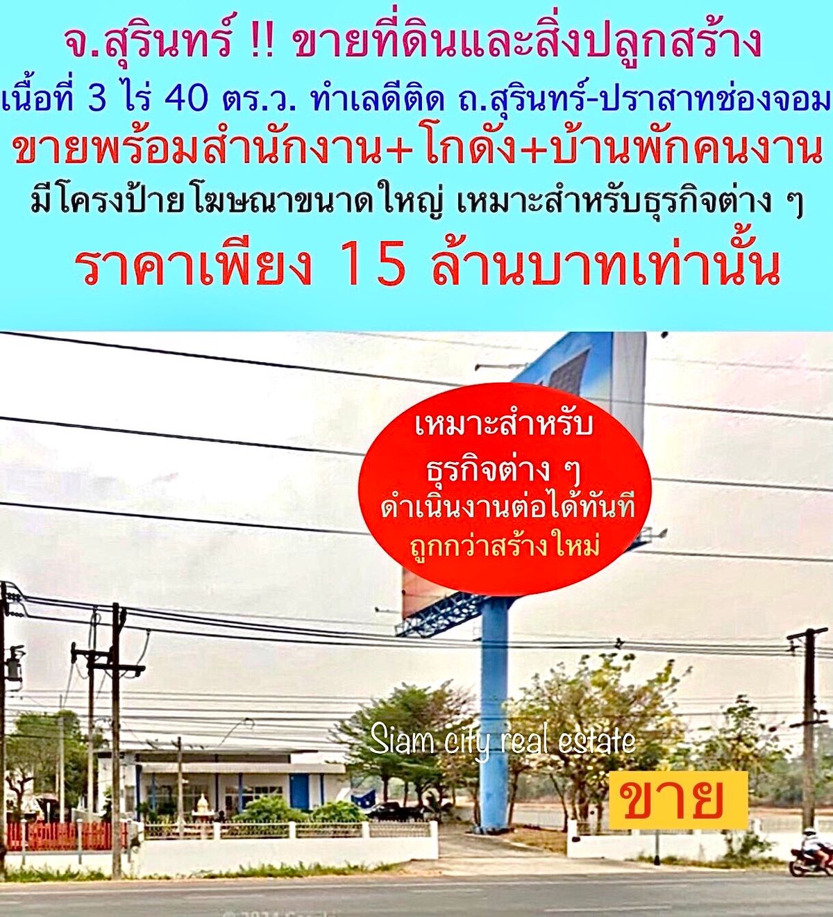 ขายที่ดินแปลงสวย พร้อมสิ่งปลูกสร้าง เป็นสำนักงาน พร้อมโกดังสินค้า และบ้านพักพนักงาน 🏡 บนทำเลทอง ถ.สุรินทร์-ปราสาท ช่องจอม ต.เฉนียง อ.เมือง จ.สุรินทร์ ⛺️ พร้อมดำเนินกิจการต่อได้เลย ถูกกว่าสร้างใหม่ 🔖 สุดคุ้ม❗️ ในราคา 15 ล้านบาทเท่านั้น ⚜️ ขนาดที่ดิน 3 ไร่ 40 ตร.ว. ⚜️ หน้ากว้างที่ดิน 34 เมตร ลึก 168 เมตร ⚜️ อาคาคอนกรีตชั้นเดียว ⚜️ ขนาดอาคาร 10 เมตร x 25.50 เมตร ⚜️ พื้นที่อาคาร 244 ตร.ม. ⚜️ ป้ายโฆษณา เห็นทั้ง 2 ด้าน ขนาด 11.5 เมตร x 20 เมตร ⚜️ บ้านพักพนักงาน ♻️ เหมาะสำหรับ 💎 ทำสำนักงาน / บริษัท 💎 โกดังสินค้า / คลังสินค้า 💎 โชว์รูม 💎 ปั๊มน้ำมัน 💎 ซื้อไว้ลงทุน ☎️ สนใจติดต่อ คุณสุธาทิพย์ โทร./ไลน์ คลิกเพื่อดูเบอร์โทรติดต่อ