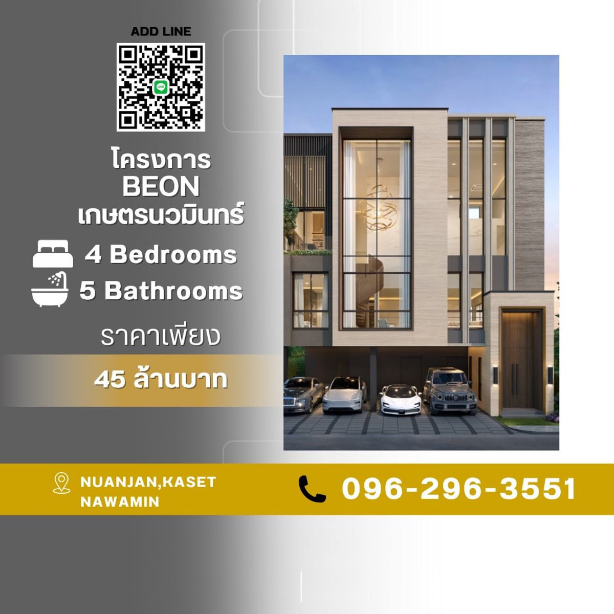 🏡 BEON Kaset-Nawamin – บ้านหรู 3 ชั้น ดีไซน์โมเดิร์นเหนือระดับ บนทำเลศักยภาพย่านเกษตร–นวมินทร์ 📐 พื้นที่ใช้สอย: ประมาณ 450 ตร.ม. 🛏️ 4 ห้องนอน | 🛁 5 ห้องน้ำ 💰 ราคาขาย: 45,000,000 บาท 📍 ทำเล: โครงการ BEON Kaset-Nawamin, กรุงเทพฯ สัมผัสประสบการณ์การอยู่อาศัยเหนือระดับในบ้านเดี่ยว 3 ชั้นสไตล์โมเดิร์น ฟังก์ชันครบทุกการใช้งาน พื้นที่ภายในกว้าง โปร่งโล่ง เชื่อมต่อธรรมชาติรอบบ้าน ตกแต่งด้วยวัสดุคุณภาพระดับพรีเมียม เหมาะสำหรับครอบครัวที่ต้องการทั้งความสงบและความสะดวกในเมือง 🏠 รายละเอียดบ้าน 🏗️ บ้านเดี่ยว 3 ชั้น 🛏️ 4 ห้องนอน ขนาดใหญ่ (ทุกห้องมีห้องน้ำในตัว) 🛁 5 ห้องน้ำ พร้อมสุขภัณฑ์ระดับพรีเมียม 🛋️ ห้องรับแขกขนาดใหญ่เชื่อมต่อโซนรับประทานอาหาร 🍳 ครัวไทยและครัวฝรั่งแยกส่วน 🚗 ที่จอดรถส่วนตัวได้ 3–4 คัน 🌿 สวนส่วนตัว และพื้นที่นั่งเล่นกลางแจ้ง 🌤️ เพดานสูง โปร่ง รับแสงธรรมชาติรอบบ้าน 🌟 สิ่งอำนวยความสะดวกในโครงการ 🏊♂️ คลับเฮาส์สุดหรู พร้อมสระว่ายน้ำระบบเกลือ 🏋️♀️ ฟิตเนสครบครัน 🌳 สวนส่วนกลางร่มรื่น 🔐 ระบบรักษาความปลอดภัย 24 ชม. / กล้อง CCTV / เข้า–ออกด้วยคีย์การ์ด 💵 ราคาขาย: 45,000,000 บาท 📞 ติดต่อสอบถาม / นัดชมบ้าน 📱 โทร / ไลน์ / WhatsApp: คลิกเพื่อดูเบอร์โทรติดต่อ 💬 Line ID: @switchedon7 🔗 https://line.me/ti/p/IllNXQG3We