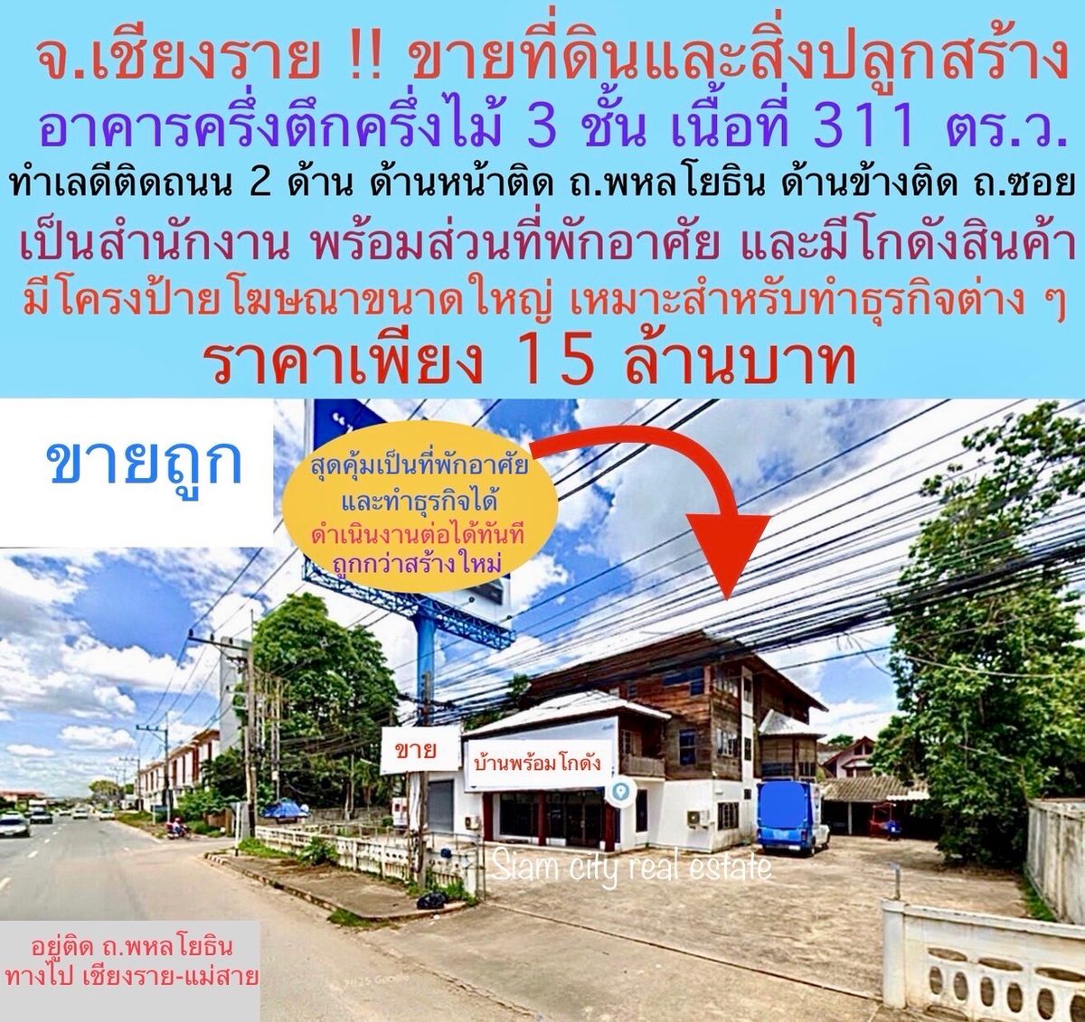 ขายบ้านไม้สัก เป็นอาคารครึ่งตึกครึ่งไม้ 3 ชั้น 🏘 เป็นสำนักงาน พร้อมส่วนที่พักอาศัย และโกดังสินค้า 🏘 ทำเลดี ติดถนน พหลโยธิน ( ทางไป เชียงราย - แม่สาย ) ต.บ้านดู่ อ.เมือง จ.เชียงราย ⭐️ พร้อมดำเนินกิจการต่อได้เลย ถูกกว่าสร้างใหม่ ❣️ สุดคุ้ม❗️ ในราคา 15 ล้านบาท 💠 ขนาดที่ดิน 311 ตร.ว. 💠อาคารครึ่งตึกครึ่งไม้สัก 3 ชั้น โครงสร้างแข็งแรง 💠 5 ห้องนอน 💠 5 ห้องน้ำ 🪜 ชั้นล่างเป็นสำนักงานและโกดังสินค้า ⭐️ มีห้องพัก 1 ห้อง มีห้องน้ำ 2 ห้อง แบ่งเป็น ➖ ห้องน้ำออฟฟิศ1ห้อง ➖ ห้องน้ำในห้องพัก1ห้อง 🪜 ชั้น 2 มีห้องพัก 2 ห้อง - มีห้องห้องน้ำในตััว 1 ห้อง - ห้องน้ำแยก 1 ห้อง 🪜 ชั้น 3 มีห้องพัก 2 ห้อง มีห้องน้ำ 1 ห้อง 💠 ขนาดอาคาร 22 เมตร x 22.5 เมตร 💠 พื้นที่อาคาร 679 ตร.ม. 💠 ป้ายโฆษณา เห็นทั้ง 2 ด้าน ขนาด 10 เมตร x 20 เมตร 💠 รองรับที่จอดรถได้หลายคัน 🚩 เหมาะสำหรับ 🏁 ทำกิจการต่าง ๆ / และพักอาศัย 🏁 ทำสำนักงาน / บริษัท 🏁 ทำร้านอาหาร / คาเฟ่ ในสไตล์บ้านไม้สัก กาแฟสด 🏁 ซื้อไว้ลงทุน ☎️ สนใจติดต่อ คุณสุธาทิพย์ โทร./ไลน์ คลิกเพื่อดูเบอร์โทรติดต่อ