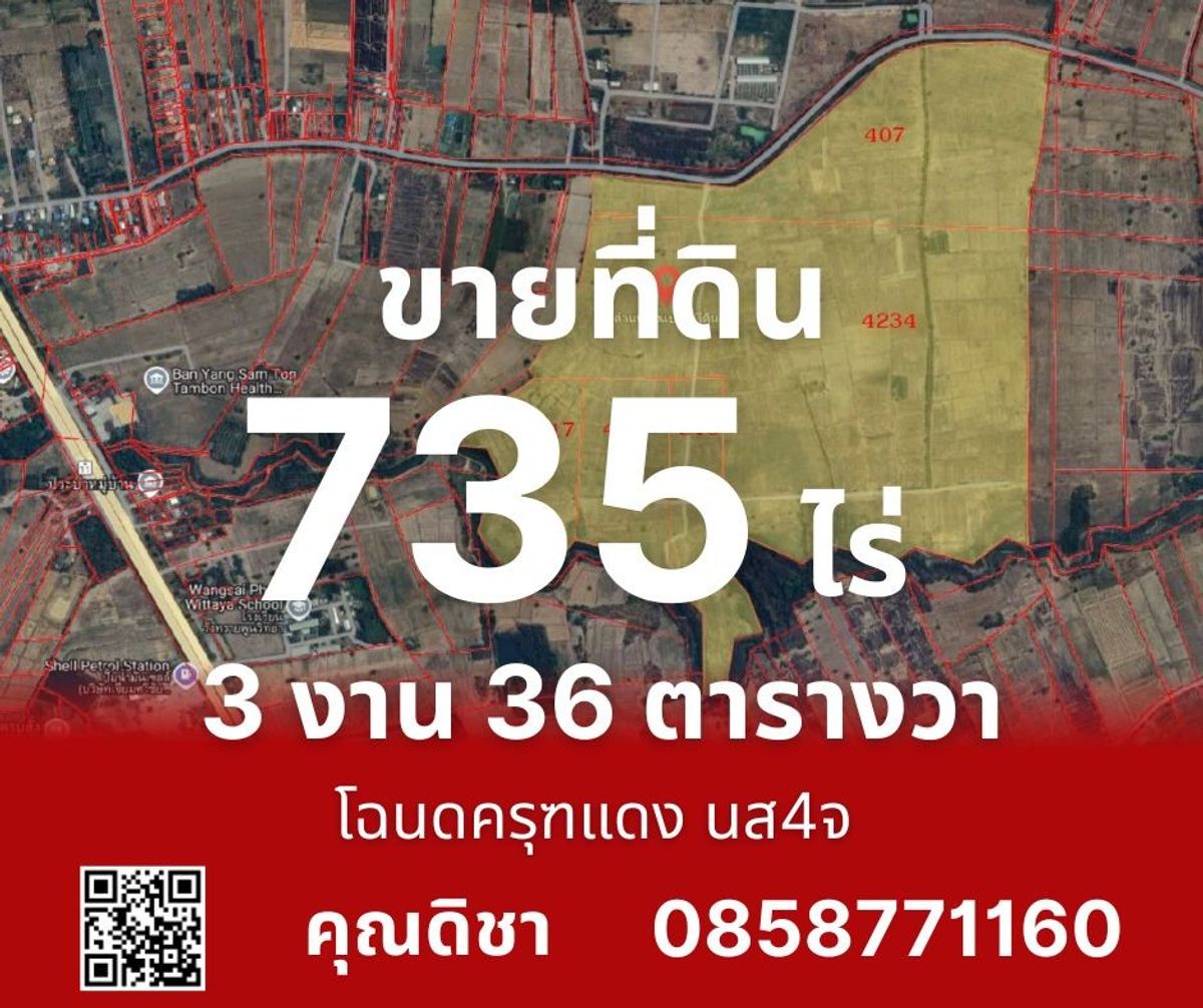 ขายที่ดิน โฉนดครุฑแดง นส4จ เนื้อที่ 735 ไร่ ติดถนนลาดยาง 📌รายละเอียด 📍เป็นที่ดินเปล่า เหมาะสำหรับปลูกสร้างโรงงาน โปรเจ็คใหญ่ โซล่าฟาร์ม 📍▪เนื้อที่ 735 ไร่ 3 งาน 36 ตารางวา หน้ากว้าง 1,631 เมตร 📍ราคาไร