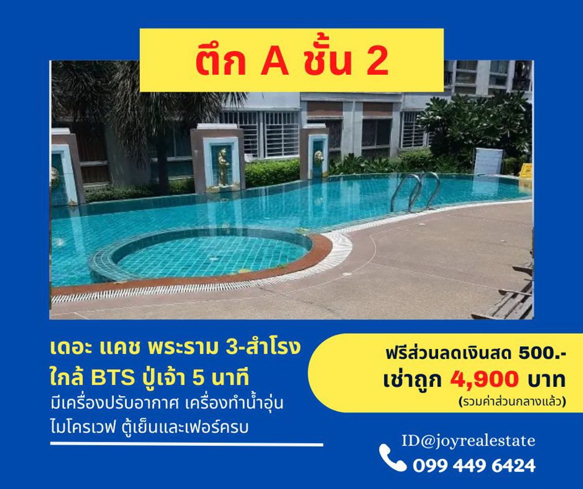 ให้เช่าคอนโด เดอะ แคช พระราม 3-สำโรง ตึก A ชั้น 2 ฟรีส่วนลด 500 เช่าถูก 4,900 บาท ห้องสตูดิโอ 1 ห้องน้ำ ขนาด 30 ตรม. ฟรีบริการจัดหาห้อง คอนโด ตามราคาที่ต้องการ เครื่องใช้ไฟฟ้า -เครื่องปรับอากาศ -เครื่องทำน้ำอุ่น -ไมโครเวฟ -ตู้เย็น เฟอร์นิเจอร์ -เตียงพร้อมที่นอน 6 ฟุต -เคาน์เตอร์ซิงค์ล้างจาน -ชั้นวางทีวี -ตู้เสื้อผ้า -ผ้าม่าน -โซฟา สิ่งอำนวยความสะดวก -เจ้าหน้าที่รักษาความปลอดภัย 24 ชม. -ฟิตเนสและสระว่ายน้ำ สถานที่ใกล้เคียง -ใกล้สถานีรถไฟฟ้าปู่เจ้า -โรงพยาบาลสำโรงการแพทย์ -ห้างสรรพสินค้าอิมพีเรียลสำโรง โปรโมชั่นพิเศษรับส่วนลดเงินสดทันที 500 บาท เช่าถูก 4,900 บาท/เดือน (ราคารวมค่าส่วนกลางแล้ว) สนใจติดต่อ จอย คลิกเพื่อดูเบอร์โทรติดต่อ ID@joyrealestate รับฝากขาย/เช่า อสังหาริมทรัพย์ JOY Real Estate
