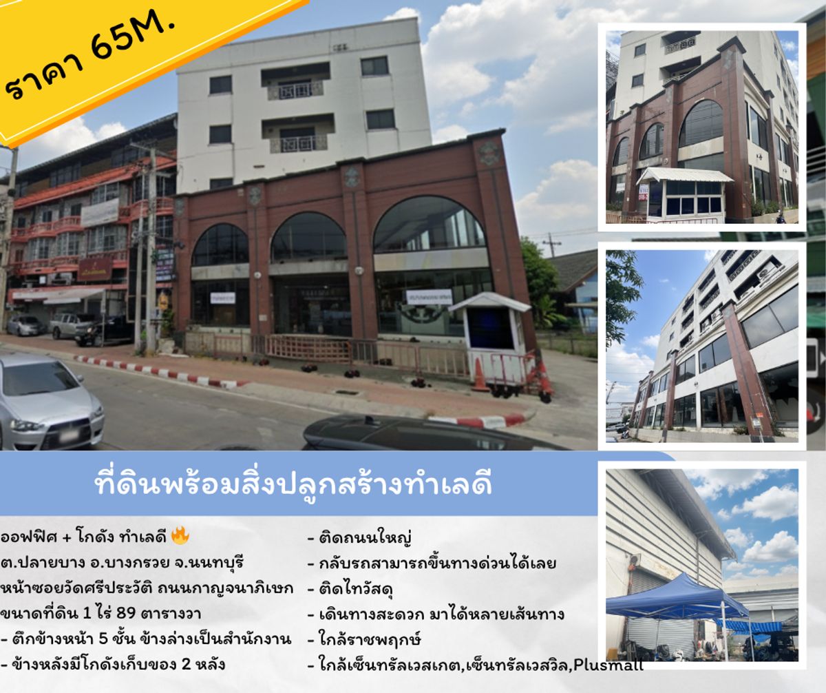 ต.ปลายบาง อ.บางกรวย จ.นนทบุรี หน้าซอยวัดศรีประวัติ ถนนกาญจนาภิเษก ขนาดที่ดิน 1 ไร่ 89 ตารางวา - ตึกข้างหน้า 5 ชั้น ข้างล่างเป็นสำนักงาน - ข้างหลังมีโกดังเก็บของ 2 หลัง - ติดถนนใหญ่ - กลับรถสามารถขึ้นท