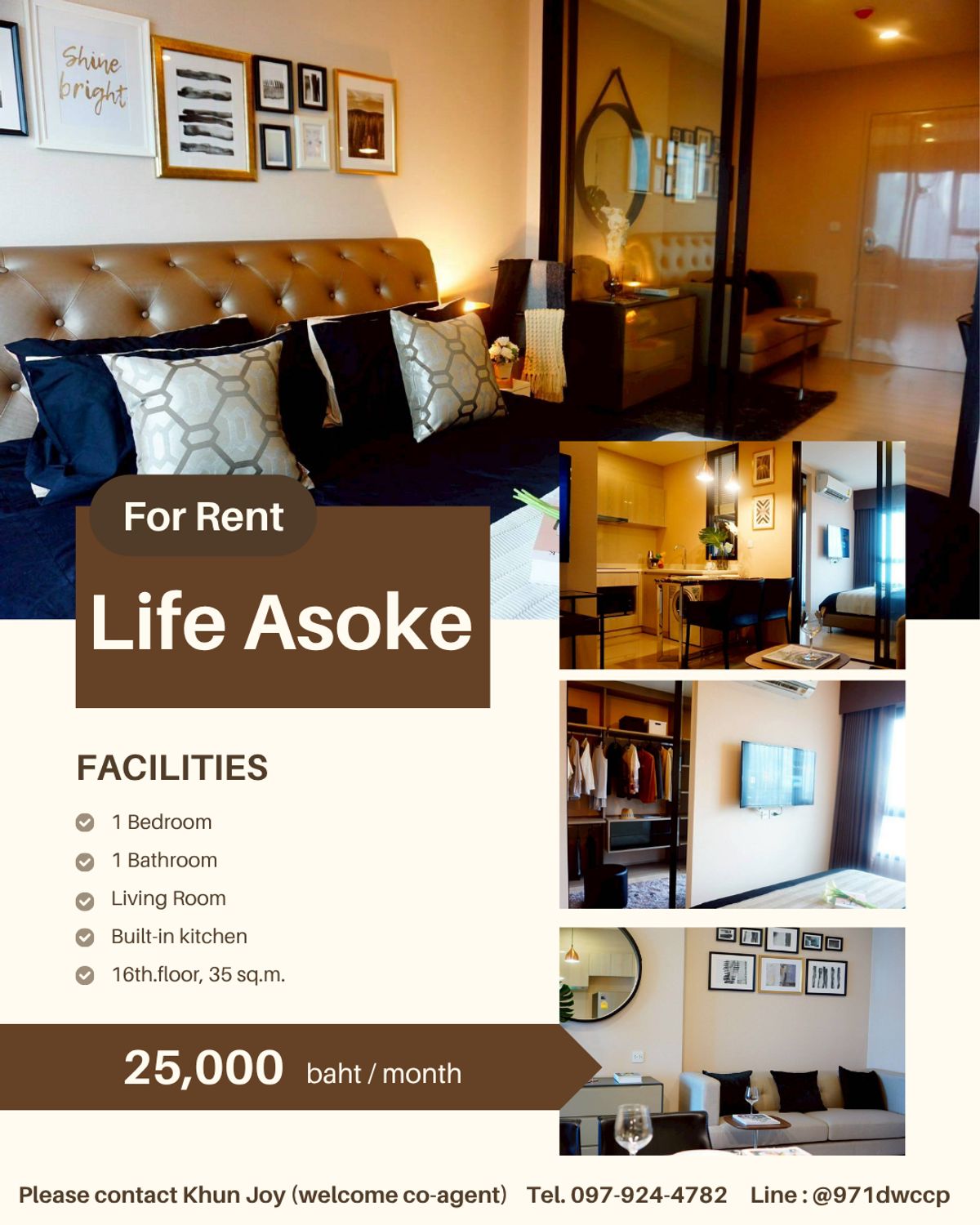 ðŸŦ*For Rent, Life Asoke**āđƒāļŦāđ‰āđ€āļŠāđˆāļē āđ„āļĨāļŸāđŒ āļ­āđ‚āļĻāļ 1 āļŦāđ‰āļ­āļ‡āļ™āļ­āļ™ 35 āļ•āļĢ.āļĄ. āļŠāļąāđ‰āļ™16 āđ€āļ”āļ·āļ­āļ™āļĨāļ° 25,000 āļš. Designer’s decorate / Superb location Asoke-Phetburi Junction / MRT Phetburi / Airport link Makkasan Urban luxury Style, great view with fully furnished & brand name appliances ✅Room Details: - 35 sq.m. - 16th.floor, North wing, Super tower view - 1 bedroom Plus, 1 living room, 1 bathroom ✅Full furnished with electrical appliances: - 6 feet bed and mattress - Walk-in closet - Sofa & coffee table - Dining table & chairs - Built-in kitchen - 2 air-conditioners, 2 sets of 49" SMART TV- Samsung Refrigerator - Electric stoves +cooker hood - Electrolux Microwave - Water heater - Washing machine ✅Facilities: - Infinity Edge Pool - 2 Fitness - Steam room - Lobby lounge - Mail box - BBQ area - Rooftop Gardens - Elevator Access control - CCTV - Access Control System - 24 hrs. securities ✅Nearby Places: - MRT Phetburi - Airport Link Makkasan - Singha complex - Terminal 21 - Central Rama9 - G tower, Grand Rama9 - Fortune Town - Show DC - Esplanade - Srinakarinwirot University - Bumrungrad International Hospital *Best suits for Expatriates, Young executives, University student & Globetrotters 💰For rent 25,000/month ☎ïļPlease contact Khun Joy (welcome co-agent) Tel. āļ„āļĨāļīāļāđ€āļžāļ·āđˆāļ­āļ”āļđāđ€āļšāļ­āļĢāđŒāđ‚āļ—āļĢāļ•āļīāļ”āļ•āđˆāļ­ line : @971dwccp