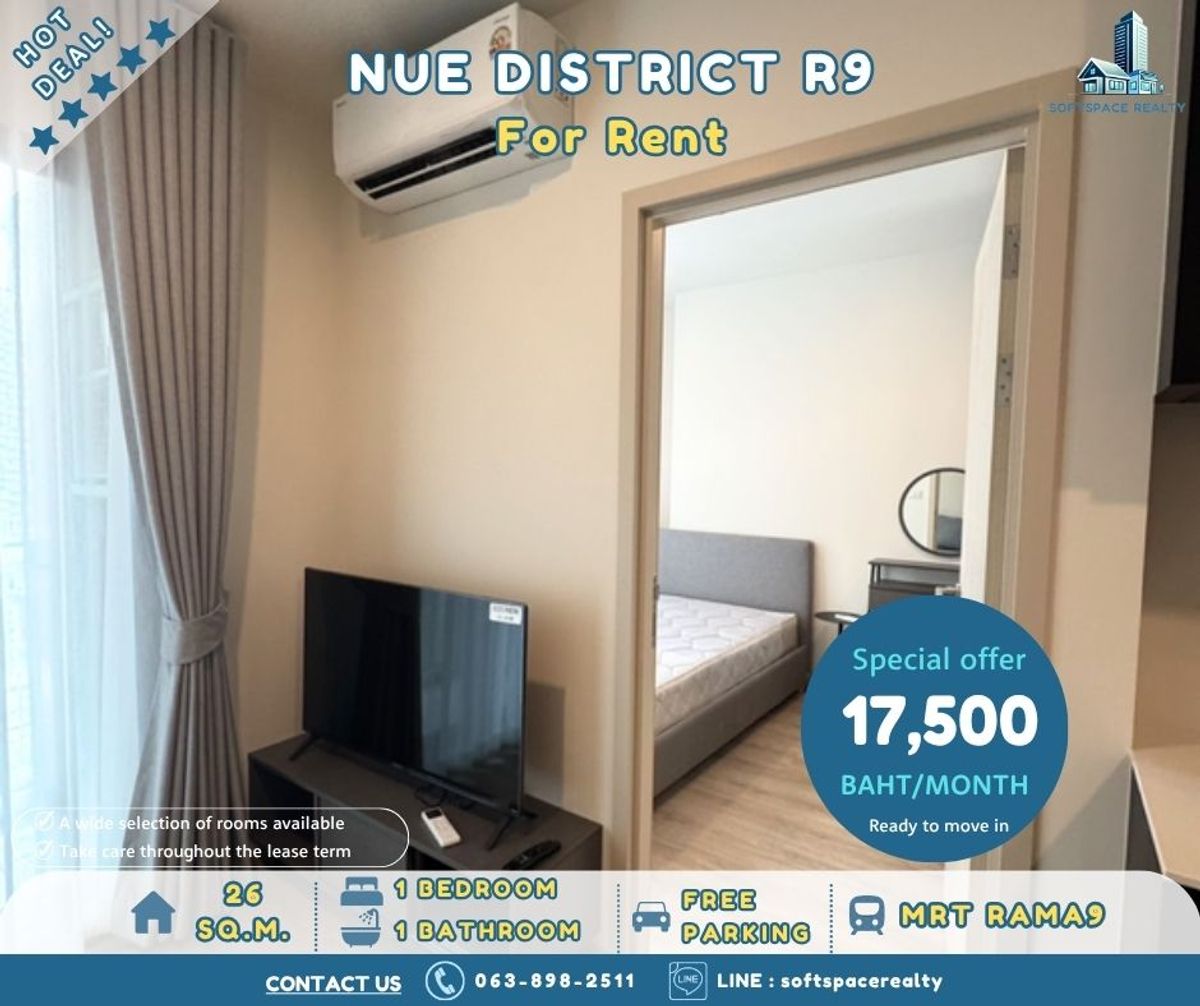 🌟 NUE DISTRICT RAMA 9 🌟 💰 เช่า | Rent: 17,500 THB/Month 📅 สัญญาเช่า 1 ปี | 1-Year Contract 🌸 รายละเอียดห้อง | Unit Details 📍 ทำเล: ใจกลางพระราม 9 • ขนาด: 26 ตร.ม. | 1 ห้องนอน 1 ห้องน้ำ • ชั้น: 11-20 •