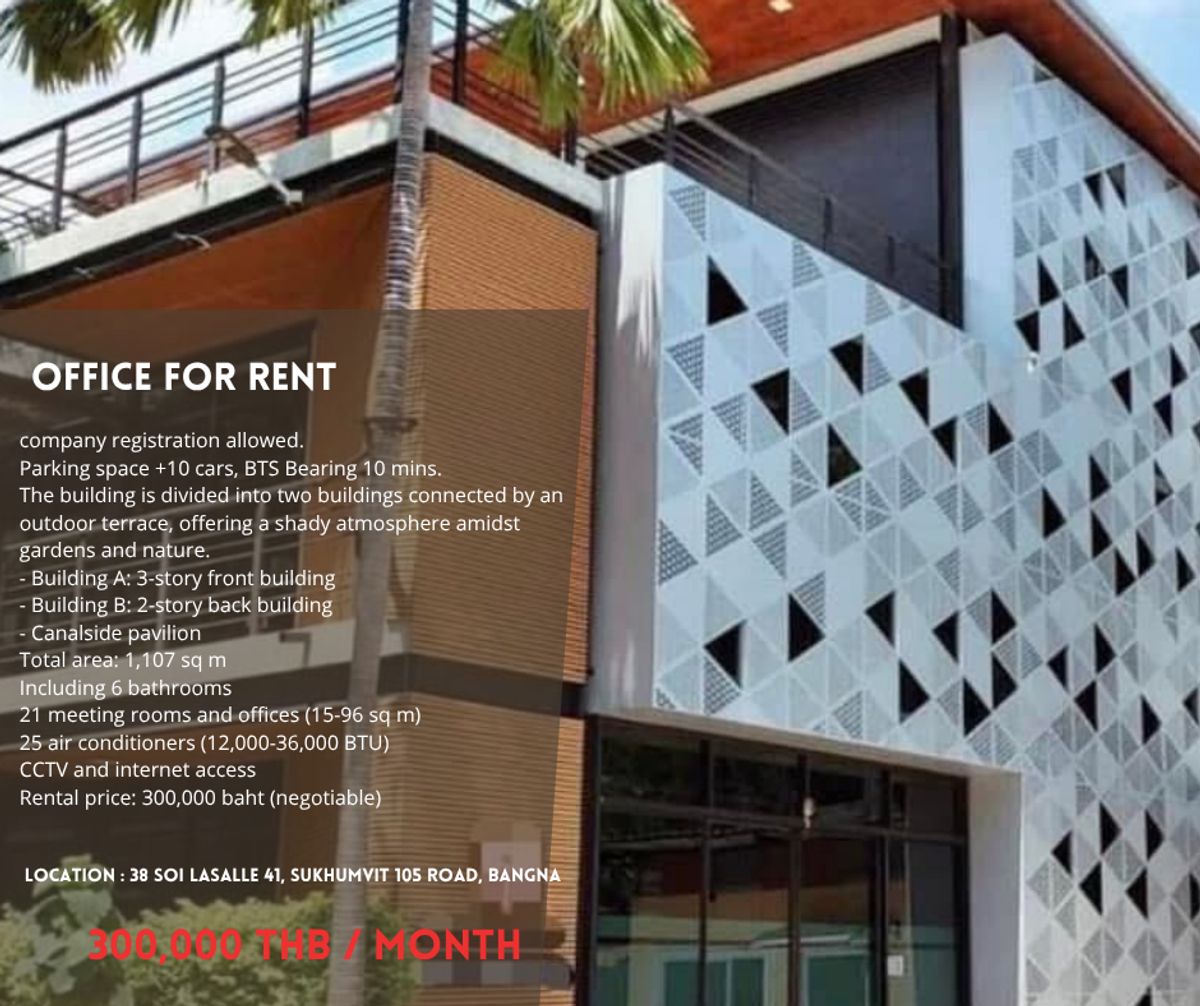 company registration allowed. Parking space +10 cars, BTS Bearing 10 mins. The building is divided into two buildings connected by an outdoor terrace, offering a shady atmosphere amidst gardens and nature. - Building A: 3-story front building - Building B: 2-story back building - Canalside pavilion Total area: 1,107 sq m Including 6 bathrooms 21 meeting rooms and offices (15-96 sq m) 25 air conditioners (12,000-36,000 BTU) CCTV and internet access Rental price: 300,000 baht (negotiable) 📍 Location : 38 Soi Lasalle 41, Sukhumvit 105 Road, Bangna Tel. คลิกเพื่อดูเบอร์โทรติดต่อ ( Anda ) WhatsApp คลิกเพื่อดูเบอร์โทรติดต่อ (Anda) Line @285gshuc #OFBR01