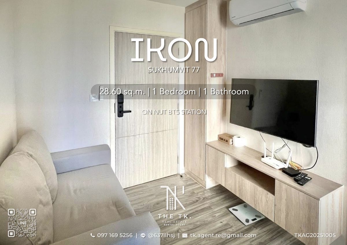 [THE TK.] คอนโดใกล้แหล่งการค้า เดินทางสะดวกให้เช่า "IKON Sukhumvit 77" ใกล้ BTS อ่อนนุช | ติดต่อคุณทีเค Line ID @637ilhsj Property Code…: TKAG20251005 Project……………..: IKON Sukhumvit 77 Monthly Rent……: THB 13,500 Unit Type………….: 1 Bedroom, 1 Bathroom Unit Size…………..: 28.6 sq.m. Floor………………...: 5 Building…………….: B Location……………: BTS พร้อมพงษ์ Fully furnished with electrical appliances. การเดินทาง 🚗 - Shuttle Service รับ-ส่งที่ BTS อ่อนนุช - วินมอเตอร์ไซต์ปากซอยสุขุมวิท 81 ถึงโครงการ เพียง 15 บาท - รถ 2 แถวบนถนนอ่อนนุช ลงหน้าอ่อนนุชพลาซ่าเข้ามาด้านหลัง ถึงโครงการ - เชื่อมซอยอ่อนนุช 10 และซอยสุขุมวิท 81 เข้าออกได้ 2 ช่องทาง แหล่งการค้า และร้านอาหาร 🍽️ - อ่อนนุชพลาซ่าอยู่หน้าโครงการ (มี Starbucks, Fitness24 และ Tops) - 7-11 และ Lotus Go Fresh อยู่เยื้องโครงการ - ใกล้ Century, Big c และ Lotus - มีร้านอาหารหลากลายในระแวก รายการเครื่องใช้ไฟฟ้า - เครื่องทำน้ำอุ่น mazuma - สมาร์ททีวี Samsung 43 นิ้ว - เครื่องซักผ้า Hitachi - ตู้เย็น Hitachi - เตาไฟฟ้า พร้อมเครื่องดูดควัน - เครื่องปรับอากาศ 2 ตัว - ไมโครเวฟ รายการเฟอร์นิเจอร์ - โซฟาเบด - ตู้เก็บของ และชั้นวาง TV บิ้วอิน - ตู้เก็บของ พร้อมเคาน์เตอร์ครัวบิ้วอิน - โต๊ะรับประทานอาหาร 2 ที่นั่ง - ตู้เสื้อผ้าบิ้วอิน - เตียงขนาด 5 ฟุต ประตู Digital Door Lock (กุญแจ พร้อมคีย์การ์ด) สิ่งอำนวยความสะดวก - ลิฟท์ - ที่จอดรถ - การรักษาความปลอดภัย 24 ชั่วโมง - ประตูอาคารระบบ keycard - กล้องวงจรปิด(CCTV) - สระว่ายน้ำ - ฟิตเนส - สวนหย่อม - รถรับส่ง สถานที่สำคัญใกล้เคียง - ใกล้ทางด่วนเฉลิมมหานคร - ทางด่วนรามอินทรา – อาจณรงค์ และทางด่วนบูรพาวิถี - ใกล้ BTS สถานีอ่อนนุช - อ่อนนุชพลาซ่า - Century The Movie Plaza - ตลาดอ่อนนุช - Habito Mal - The Phyll - Gateway เอกมัย - Major เอกมัย - The Beacon Place - Summer Hill - Wells International School - Bangkok Prep - Anglo Singapore International School - ร.พ.กล้วยน้ำไท - ร.พ.สุขุมวิท สัญญาขั้นต่ำ 1 ปี ค่าเช่าล่วงหน้า 1 เดือน ค่าประกันความเสียหาย 2 เดือน นัดชมห้องจริงติดต่อ THE TK. REAL ESTATE RENTAL AGENT 📞 PHONE...: คลิกเพื่อดูเบอร์โทรติดต่อ 💬 LINE ID...: @637ilhsj (https://lin.ee/vrFUNkB) ✉️ EMAIL…..: คลิกเพื่อดูอีเมล #คอนโดอ่อนนุช #IKONSukhumvi77 #คอนโดใกล้BTS #คอนโดให้เช่า #THETK #THETKRENTALAGENT