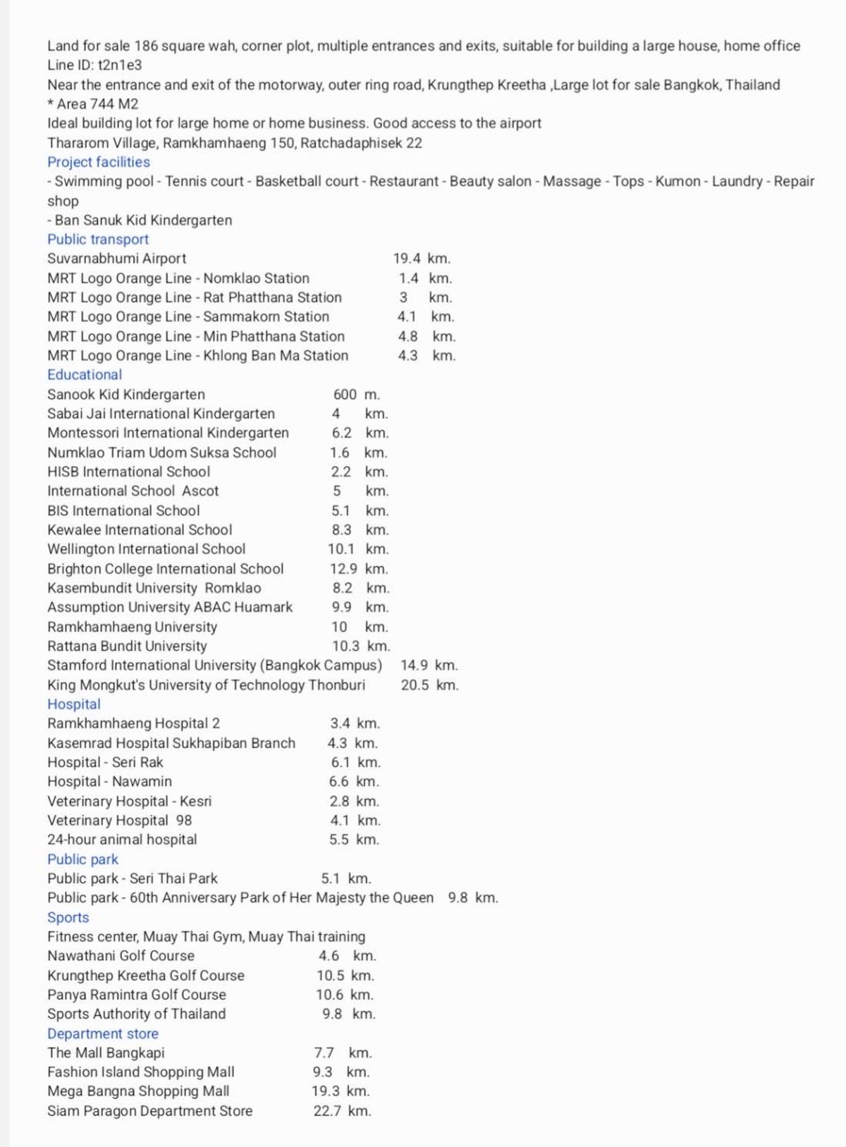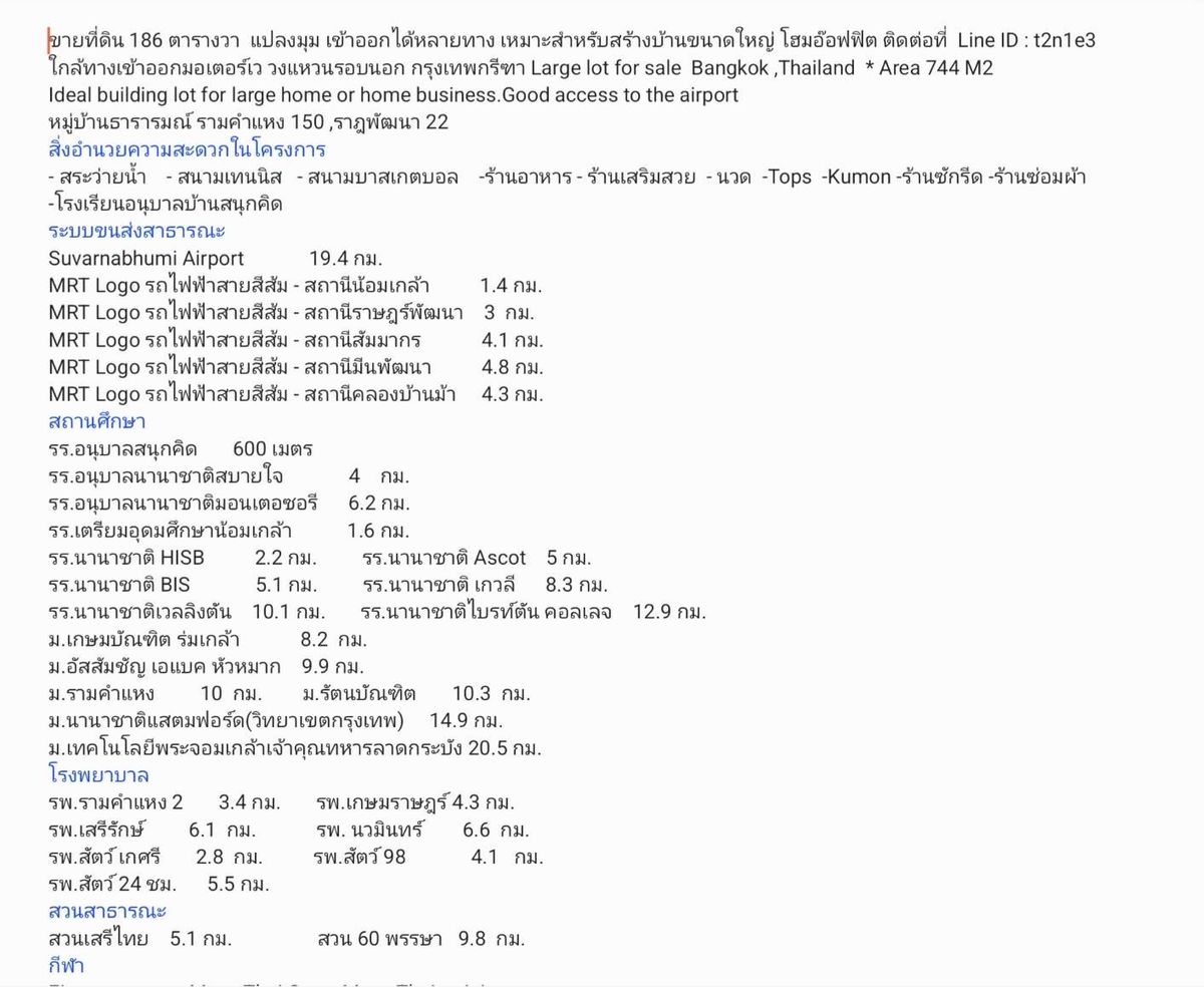 🏡 ขายที่ดินแปลงมุม 186 ตรว. หมู่บ้านธารารมณ์ รามคำแหง 150 – กรุงเทพกรีฑา 📍 ทำเลทอง เดินทางสะดวก ใกล้มอเตอร์เวย์ – วงแหวนรอบนอก – รถไฟฟ้าสายสีส้ม 📐 ขนาด 186 ตารางวา (744 ตร.ม.) 💰 เหมาะสำหรับสร้างบ้านเดี่ยวขนาดใหญ่, โฮมออฟฟิศ, บ้านพักตากอากาศในเมือง ✅ จุดเด่นทรัพย์ • 📌 แปลงมุม เข้า–ออกได้หลายทาง • 🚘 ใกล้ทางขึ้น–ลงมอเตอร์เวย์ และวงแหวนรอบนอก • 🏡 เหมาะกับสร้างบ้านขนาดใหญ่ / Home Office / ลงทุนเก็งกำไร • 🌳 หมู่บ้านเงียบสงบ ปลอดภัย บรรยากาศร่มรื่น 🏢 สิ่งอำนวยความสะดวกภายในหมู่บ้าน • สระว่ายน้ำ, สนามเทนนิส, สนามบาสเกตบอล • ร้านอาหาร, ร้านเสริมสวย, นวด, Tops, Kumon, ซักรีด • โรงเรียนอนุบาลบ้านสนุกคิด 🚆 ระบบขนส่ง • ✈️ สนามบินสุวรรณภูมิ 19.4 กม. • 🚆 รถไฟฟ้าสายสีส้ม – สถานีน้อมเกล้า 1.4 กม. • 🚆 สถานีราษฎร์พัฒนา 3 กม. / สถานีสัมมากร 4.1 กม. 🏫 โรงเรียนและมหาวิทยาลัยใกล้เคียง • HISB International School (2.2 กม.) • Ascot / BIS / Wellington / Brighton College • ม.รามคำแหง / ม.อัสสัมชัญ / ม.รัตนบัณฑิต / ม.เกษมบัณฑิต 🏥 โรงพยาบาลใกล้เคียง • รพ.รามคำแหง 2 (3.4 กม.) • รพ.เกษมราษฎร์ (4.3 กม.) • รพ.เสรีรักษ์ (6.1 กม.) • รพ.นวมินทร์ (6.6 กม.) 🏌️ กิจกรรมกีฬา • Nawathani Golf Course (4.6 กม.) • Krungthep Kreetha Golf Course (10.5 กม.) • Sports Authority of Thailand (9.8 กม.) 🛍️ แหล่งช้อปปิ้ง • เดอะมอลล์บางกะปิ 7.7 กม. • แฟชั่นไอส์แลนด์ 9.3 กม. • เมกาบางนา 19.3 กม. • สยามพารากอน 22.7 กม. 📲 สนใจติดต่อ Line ID: t2n1e3 ✨ ที่ดินแปลงมุมหายาก ทำเลดี เดินทางสะดวก เหมาะลงทุนและสร้างบ้านในฝัน 📌 พร้อมโอนทันที — รีบติดต่อก่อนหลุดมือ 🇬🇧 Land for Sale – Corner Plot 186 SQ.W. (744 SQ.M.) 📍 Thararom Village, Ramkhamhaeng 150 – Krungthep Kreetha ✅ Prime location, easy access to motorway, Orange Line MRT, and airport. • 📌 Corner plot with multiple access points • 🚘 Near Motorway & Outer Ring Road • 🏡 Perfect for large house, home office, or investment • 🌳 Quiet, safe, private neighborhood Nearby: • ✈️ Suvarnabhumi Airport 19.4 km • 🚆 MRT Orange Line (Nomklao) 1.4 km • 🏫 HISB, Ascot, Wellington International Schools • 🏥 Ramkhamhaeng Hospital, Kasemrad Hospital • 🏌️ Nawathani & Krungthep Kreetha Golf Course • 🛍️ The Mall Bangkapi, Fashion Island, Mega Bangna 📲 Contact Line ID: t2n1e3 🏡 Rare Corner Lot — Ideal Investment Opportunity in Bangkok