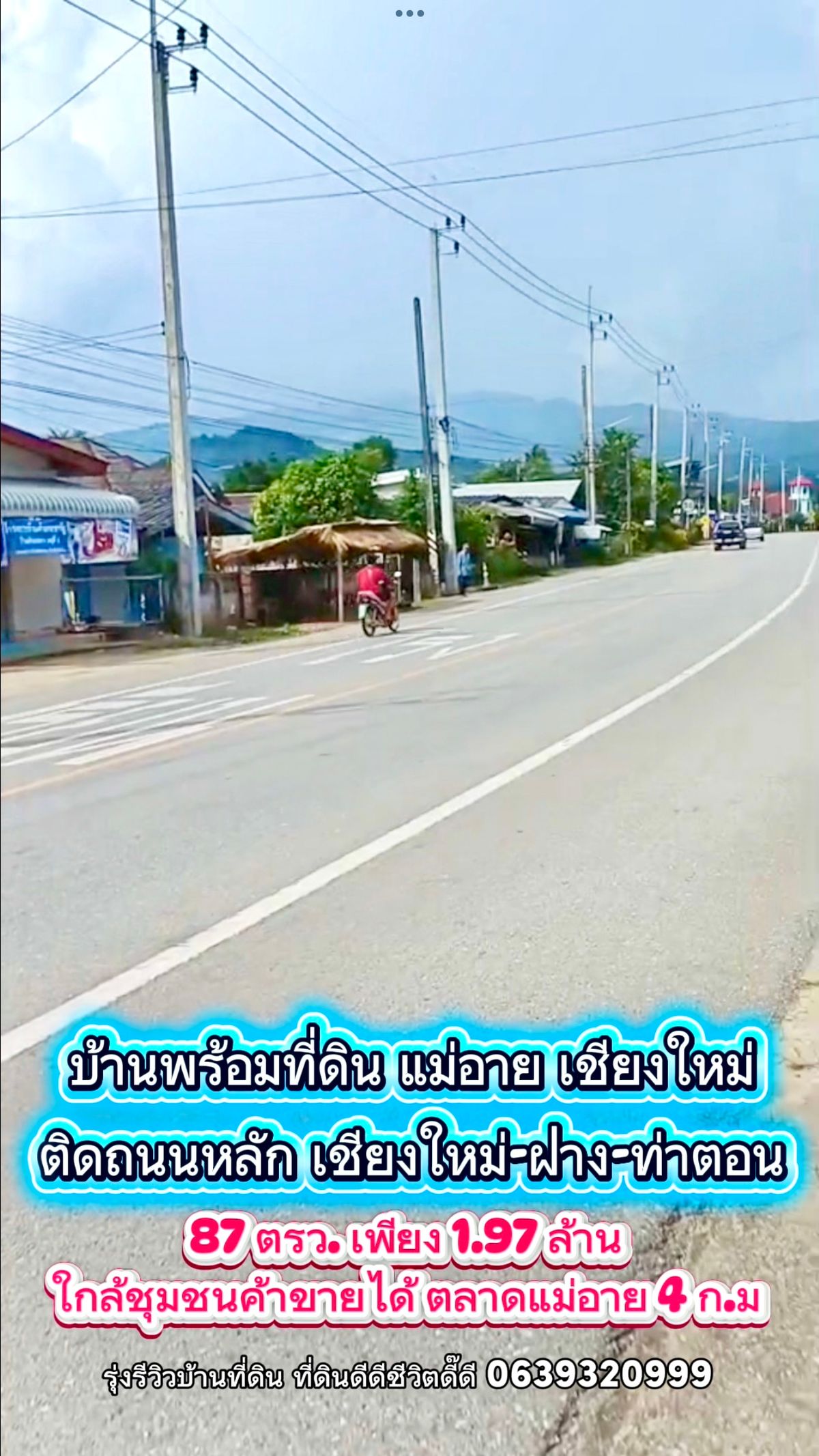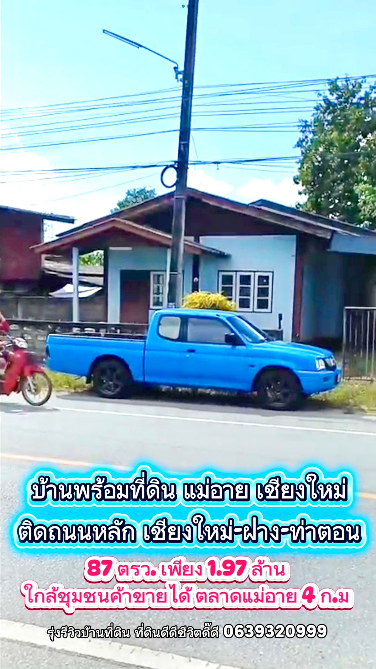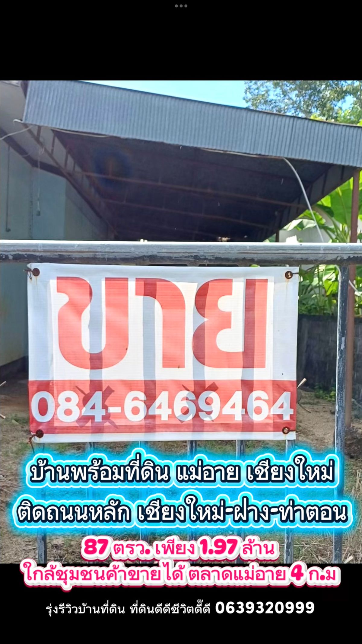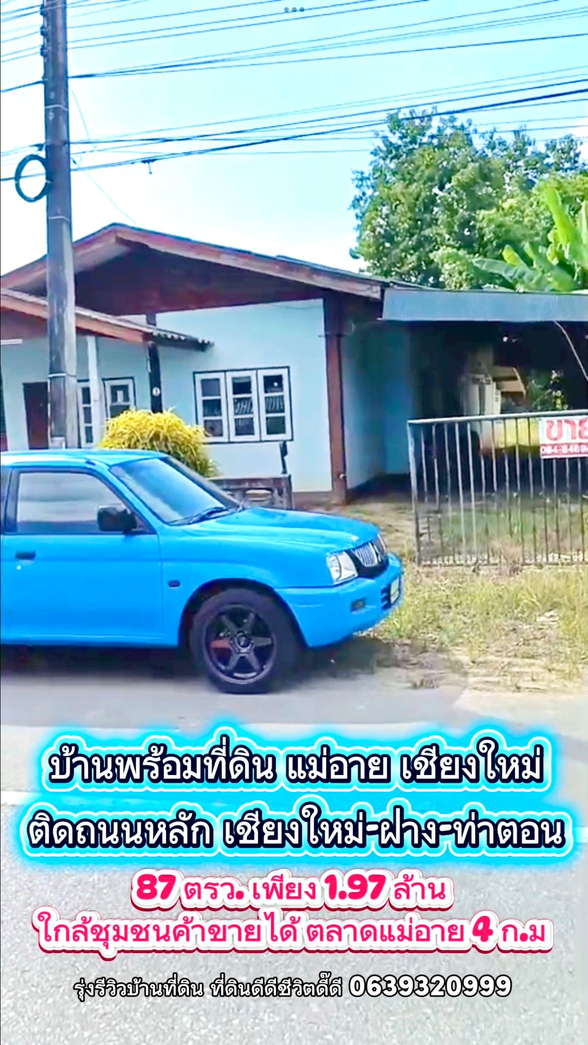 ใกล้หน้าหนาวแล้วพาขึ้นเหนือ ใครชอบบรรยากาศทางเหนือสนใจไปสร้างหลักปักฐาน มีที่ทำเลดีพร้อมบ้าน ติดถนนหลัก อำเภอแม่อาย จังหวัดเชียงใหม่ มาฝาก บ้านพร้อมที่ดิน ขนาด 87 ตรว. ตำบลแม่สาว อำเภอแม่อาย จังหวัดเชียงใหม่ ติดถนนหลัก เชียงใหม่-ฝาง-ท่าตอน ค้าขายได้ใกล้ชุมชน สถานที่สำคัญใกล้เคียงแหล่งท่องเที่ยว วัดแม่สาว 550 เมตร ที่ว่าการอำเภอแม่อาย 4 ก.ม ตลาดสด,โลตัส 5.3 ก.ม รพ. แม่อาย 6 ก.ม วัดท่าตอน 13 ก.ม พระเจดีย์แก้ว 14 ก.ม โครงการบ้านเล็กในป่าใหญ่ดอยผ้าห่มปก 17 ก.ม อุทยานแห่งชาติดอยผ้าห่มปก 22 ก.ม ลานกางเต็นท์กิ่วลม 22 ก.ม บ่อน้ำพุร้อนฝาง 22 ก.ม เชียงราย 100 ก.ม เชียงใหม่ 159 ก.ม บ้านพร้อมที่ดิน 87 ตรว. 1.97 ล้าน สอบถามเพิ่มเติม รุ่ง คลิกเพื่อดูเบอร์โทรติดต่อ #บ้านพร้อมที่ดิน #บ้านแม่อายเชียงใหม่ #ที่ดินติดถนนค้าขายได้ #ที่ดินแปลงเล็ก #ที่ดินภาคเหนือ #บ้านเชียงใหม่ #รุ่งรีวิวที่ดิน #ที่ดินดีดีชีวิตดี๊ดี