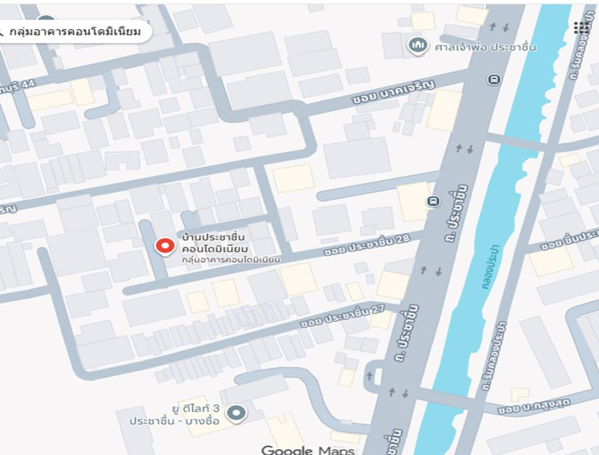 ขายคอนโด บ้านประชาชื่นคอนโดมิเนียม (ใกล้แยกประชานุกูล, MRT) ซอยประชาชื่น 28 (เข้าไปในซอยจากถนนประชาชื่น ประมาณ 120 เมตร) เลียบคลองประปา เขตบางซื่อ,เดินทางสะดวกด้วยรถประจำทาง, ห้องประมาณ 25 ตร.ม. ชั้น