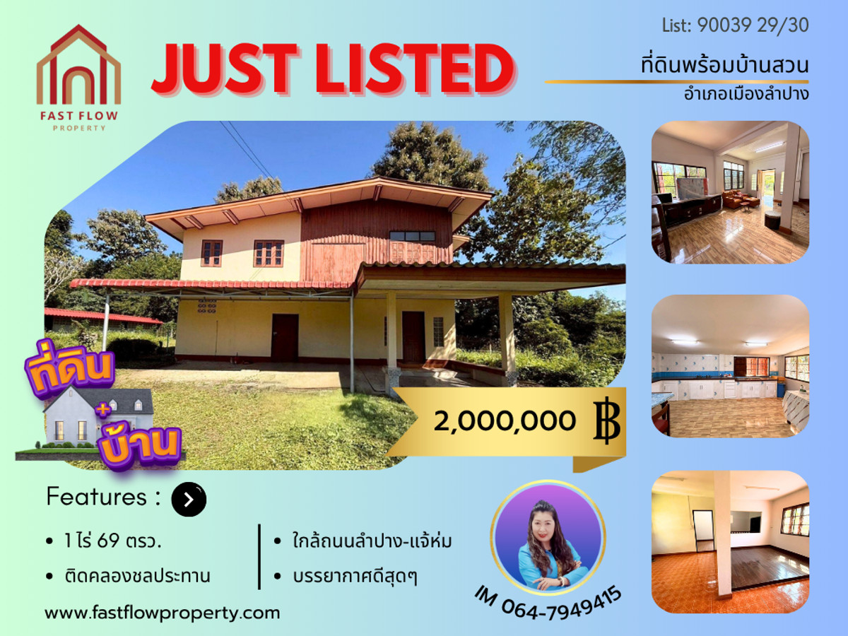 ขาย บ้านเดี่ยว 2 ชั้น ซอยคลองชลประทาน ซอย5 ใกล้ถนนลำปาง-แจ้ห่ม ทุ่งฝาย อำเภอเมืองลำปาง วัดนาป้อเหนือ IM สนใจติดต่อ รันญรัตน์ Fast Flow Property คลิกเพื่อดูเบอร์โทรติดต่อ, คลิกเพื่อดูเบอร์โทรติดต่อ เบอร์ Line : คลิกเพื่อดูเบอร์โทรติดต่อ Listing no : 90039 Property Detail: - ขาย บ้านเดี่ยว 2 ชั้นสร้างเอง บรรยากาศดี ท่ามกลางธรรมชาติ - ที่ดิน 1ไร่ 69 ตารางวา - พื้นที่ใช้สอยประมาณ 300 ตารางเมตร - หน้าบ้านหันทิศใต้ ลมดี อากาศถ่ายเทสะดวก - มี 3 ห้องนอน 2 ห้องน้ำ - ครัวไทยขนาดใหญ่ มีเคาน์เตอร์ครัวปูนอย่างดี - ชั้นล่างปูกระเบื้อง ชั้นบนกระเบื้องและไม้สัก - ขายบ้านเปล่า ตกแต่งต่อเติมได้ง่าย สถานที่ใกล้เคียง: - ถนนลำปาง-แจ้ห่ม - อบต.ทุ่งฝาย, วัดธาตุเสด็จ - มหาวิทยาลัยเทคโนโลยีราชมงคลล้านนา ลำปาง, มหาวิทยาลัยธรรมศาสตร์ ศูนย์ลำปาง - โรงพยาบาลมะเร็งลำปาง, โรงพยาบาลแม่เมาะ, โรงพยาบาลแจ้ห่ม - โฮมโปร ลำปาง, โลตัส เอ็กซ์เพลส, ห้างเสรี สรรพสินค้า ตำแหน่งที่ตั้ง https://maps.app.goo.gl/abZ4sgvrNkxXh2LQ8 ราคา 2,000,000 บาท บริการช่วยเหลือจัดหาสินเชื่อธนาคารฟรี! สามารถนัดเข้าชมสถานที่จริงได้ทุกวัน สนใจราคาคุยกันได้ ติดต่อ คุณรันญรัตน์ (อิม) คลิกเพื่อดูเบอร์โทรติดต่อ , คลิกเพื่อดูเบอร์โทรติดต่อ เบอร์ Line: คลิกเพื่อดูเบอร์โทรติดต่อ ติดต่อ Fast Flow Property Office Tel: คลิกเพื่อดูเบอร์โทรติดต่อ Line id: @fastflow FB page: facebook.com/fastflowproperty www.fastflowproperty.com บริการรับฝากขายอสังหาริมทรัพย์ทุกประเภท ฟรีค่าโฆษณา