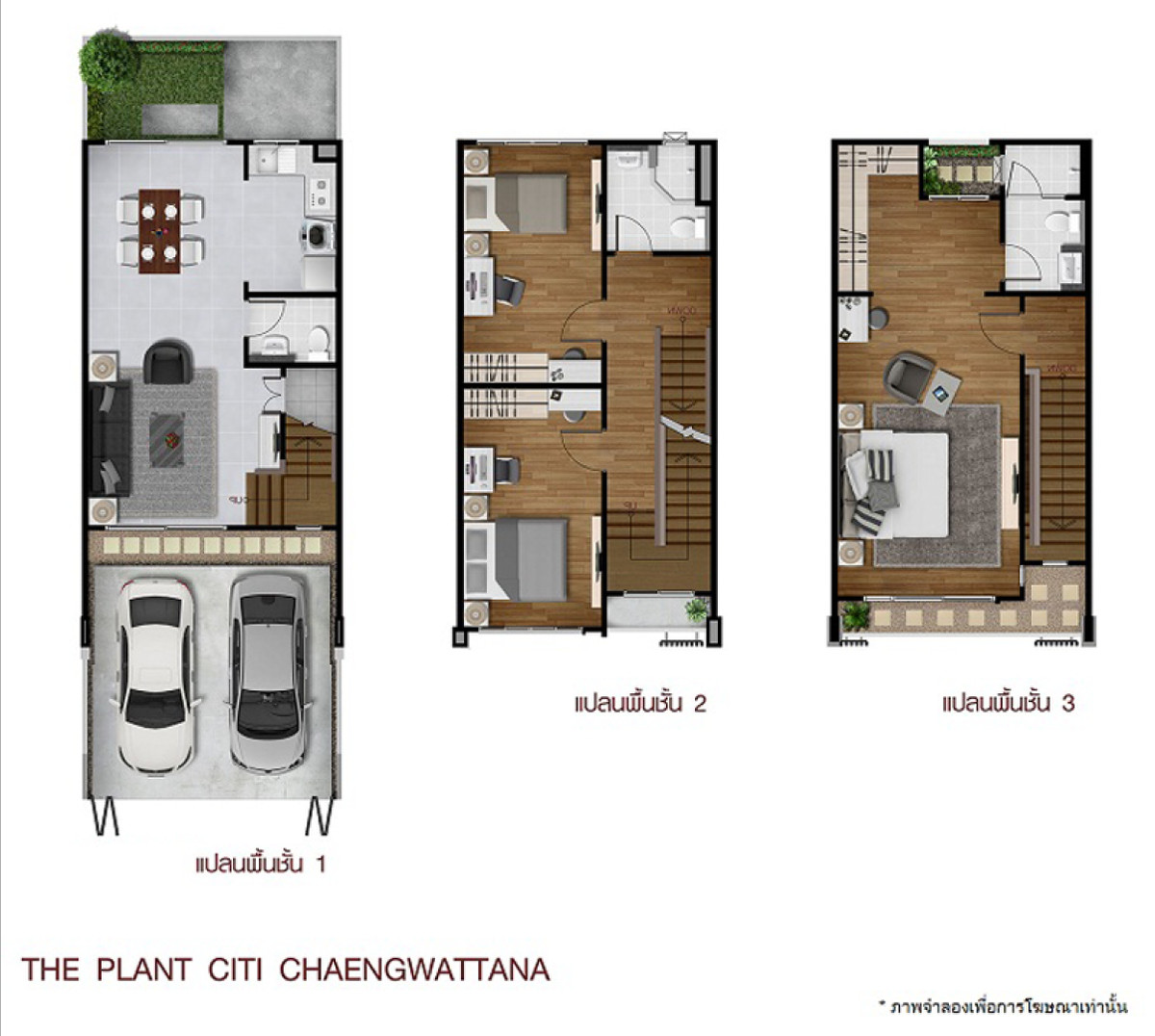 The plant citi แจ้งวัฒนะ Town home 3 ชั้น จอดรถ 2 คัน พื้นที่ใช้สอยประมาณ 150 ตร.ม. หน้ากว้าง 5 เมตร จอดรถ 2 คัน 3 ห้องนอน 3 ห้องน้ำ - แอร์ 4 เครื่อง - เครื่องทำน้ำอุ่น 2 เครื่อง ห้อง Living+Dining ชั