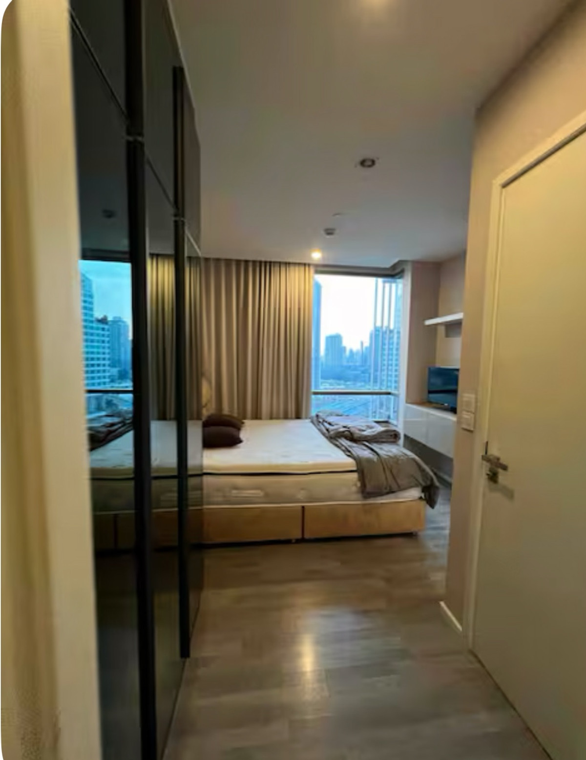 จุดเด่นห้องนี้ วิว BTS รับลม ไม่มีตึกบัง (ทิศตะวันตก) ตรงข้ามห้องเมื่อเปิดประตู เป็นระเบียงหน้าต่าง ตำแหน่งห้องอยู่กึ่งกลาง Floor ไม่ติดลิฟท์ และไม่ติดห้องขยะ The Room Sukhumvit 69 ข้อดี ติดถนนสุขุมวิ