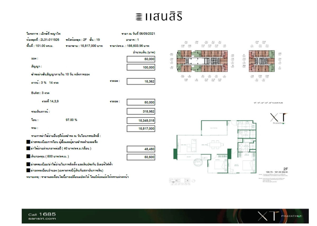 ขายดาวน์ 13.5ลบ. คอนโด2นอน2น้ำ 101ตรม. ระเบียงหันทิศตะวันออก+Openwell ชั้น19 ไม่เคยปล่อยเช่า ไม่เคยอยู่