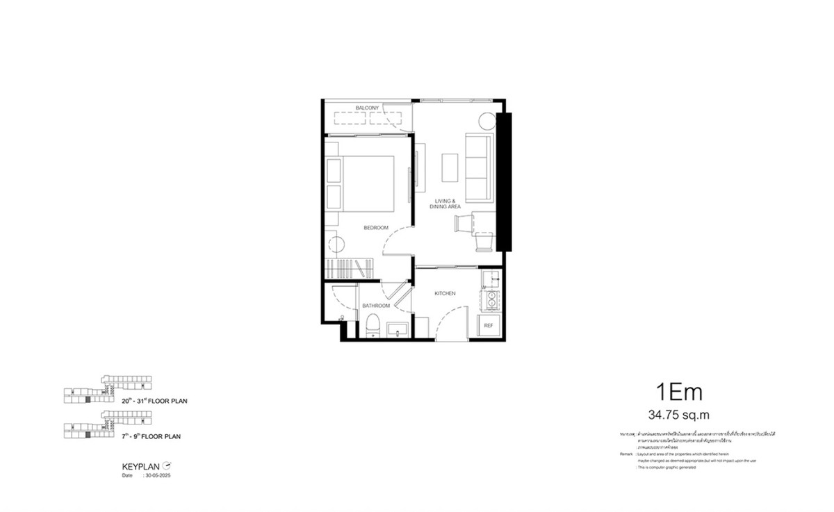 1 ห้องนอน 1 ห้องน้ำ (34.75ตร.ม) ห้องSimplex พื้นที่เยอะ ชั้น8 ทิศตะวันออก