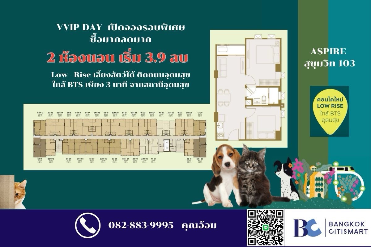 🐶 Pet-Friendly Condominium ตอบโจทย์ชีวิตคนรุ่นใหม่ที่อยากมีสัตว์เลี้ยงอยู่ด้วยกัน หายากมากในโซนสุขุมวิท — ดีมานด์เช่ากลุ่มนี้สูงขึ้นต่อเนื่อง 💡 สำหรับนักลงทุน – ราคาเปิดตัวรอบ VVIP เริ่มเพียง 9x,xxx บ